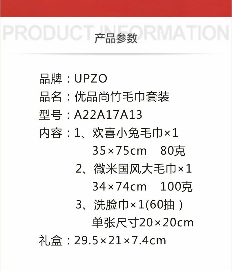型号: A22A17A13 产品内容: 1、欢喜小兔毛巾×1 35*75CM 80克 2、微米国风大毛巾×1 34*74CM 100克 3、洗脸巾×1包 60抽 加厚加大 单张尺寸20*20CM 平方克重70 礼盒: 29.5×21×7.4cm 天地盖+拎袋 产品说明 1、欢喜小兔大毛巾 升级精美包边 波浪纹面料 2、微米国风毛巾 精制包边 厚实面料 结合国风刺绣 3、棉柔巾60抽每包 加厚设计平方克重70克 珍珠纹