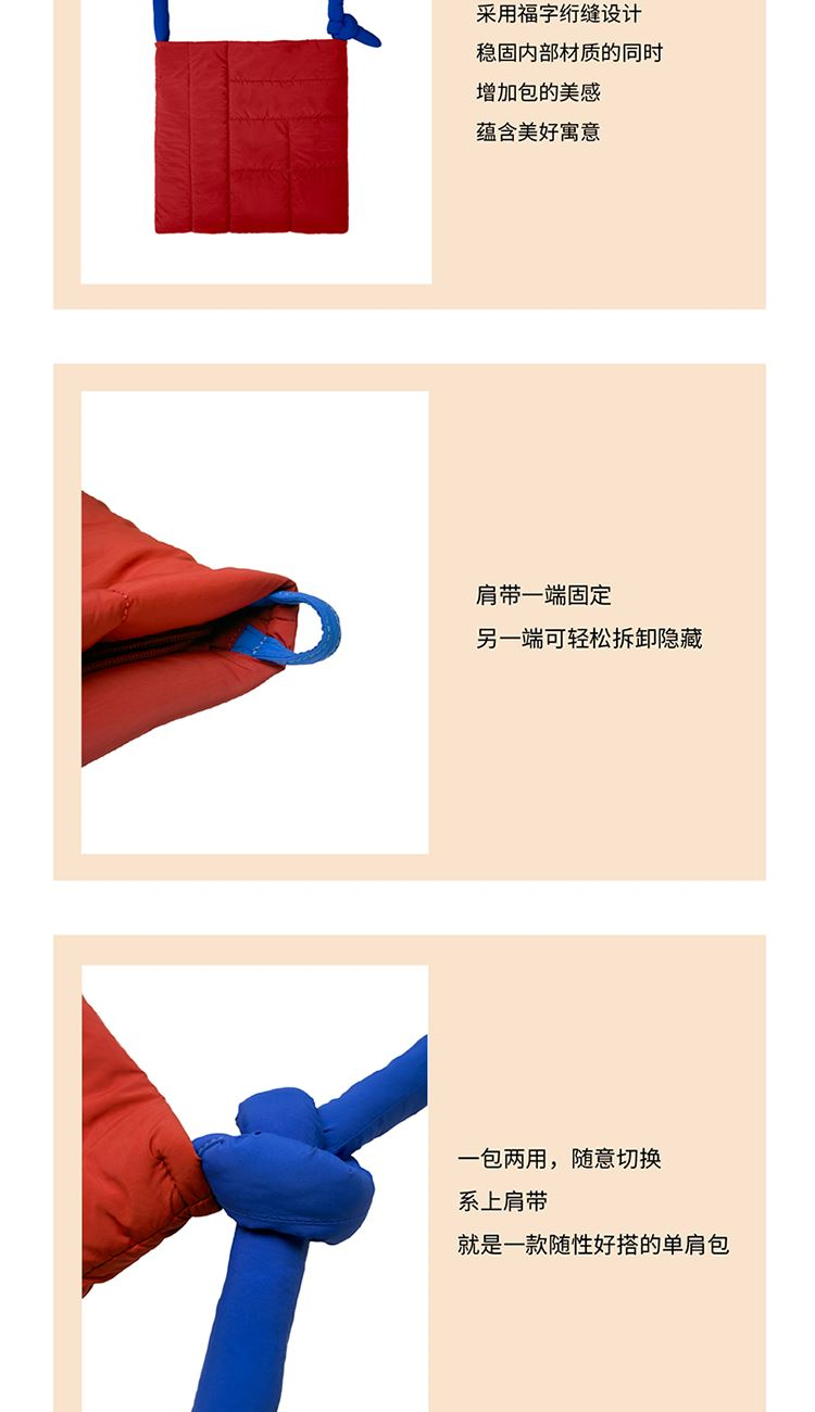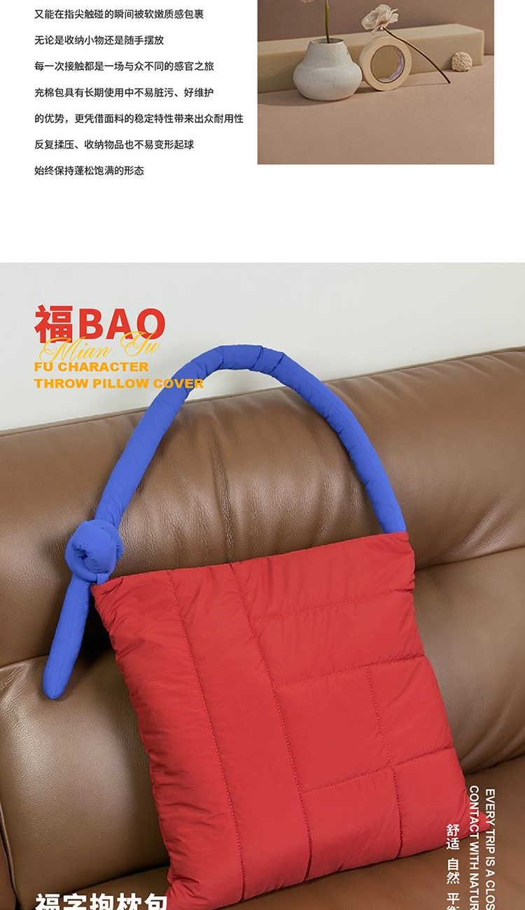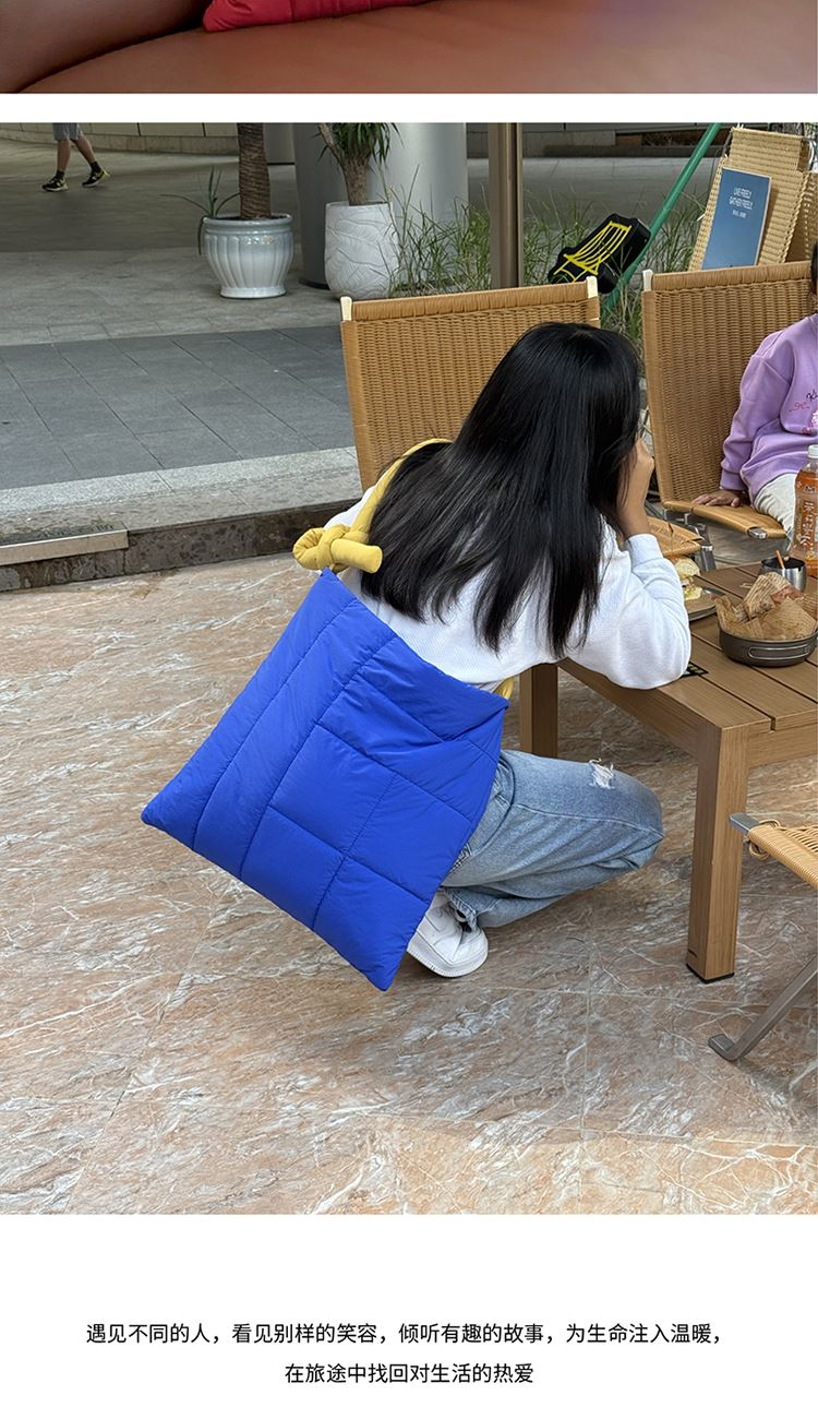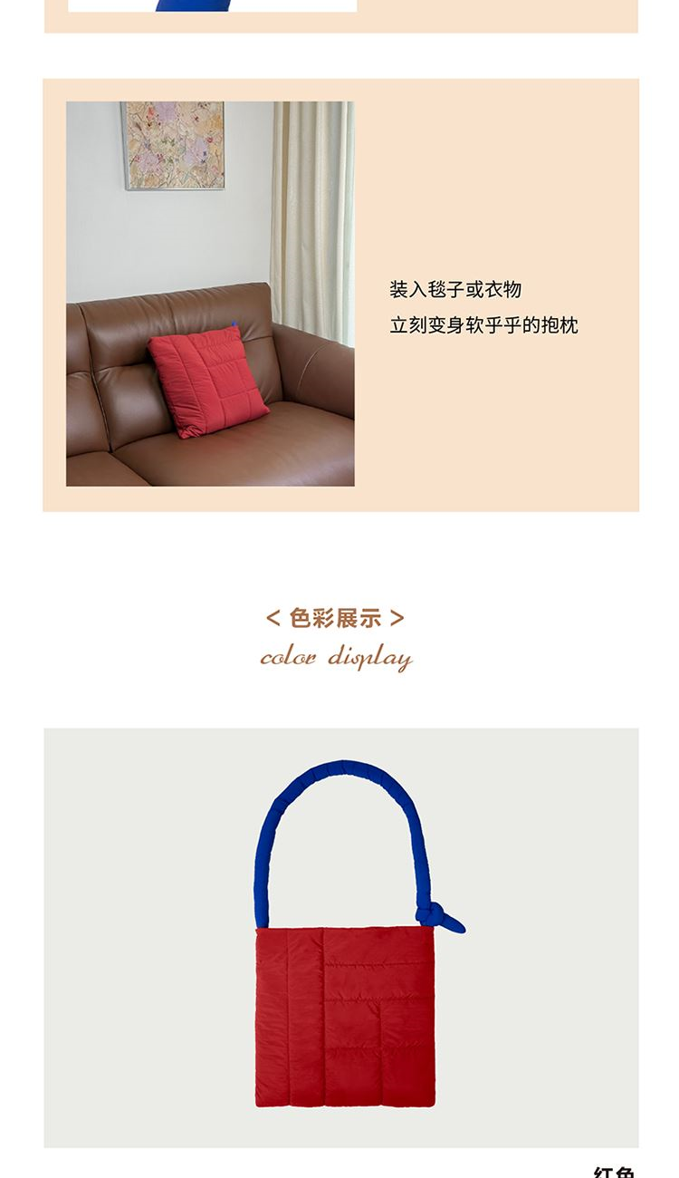 一包两用,随意切换。它不只是个包,还是个抱枕!肩带一端固定、另一端可轻松拆卸隐藏。系上肩带,就是一款随性好搭的单肩包,日常通勤、逛街都能背;把肩带拆卸并隐藏起来,再装入毯子或衣物,立刻变身软乎乎的抱枕~办公时能装文件小物,居家时可当靠枕放松,旅行时既方便收纳,还能临时充当休憩抱枕,一包解锁办公、居家、旅行等多场景需求。