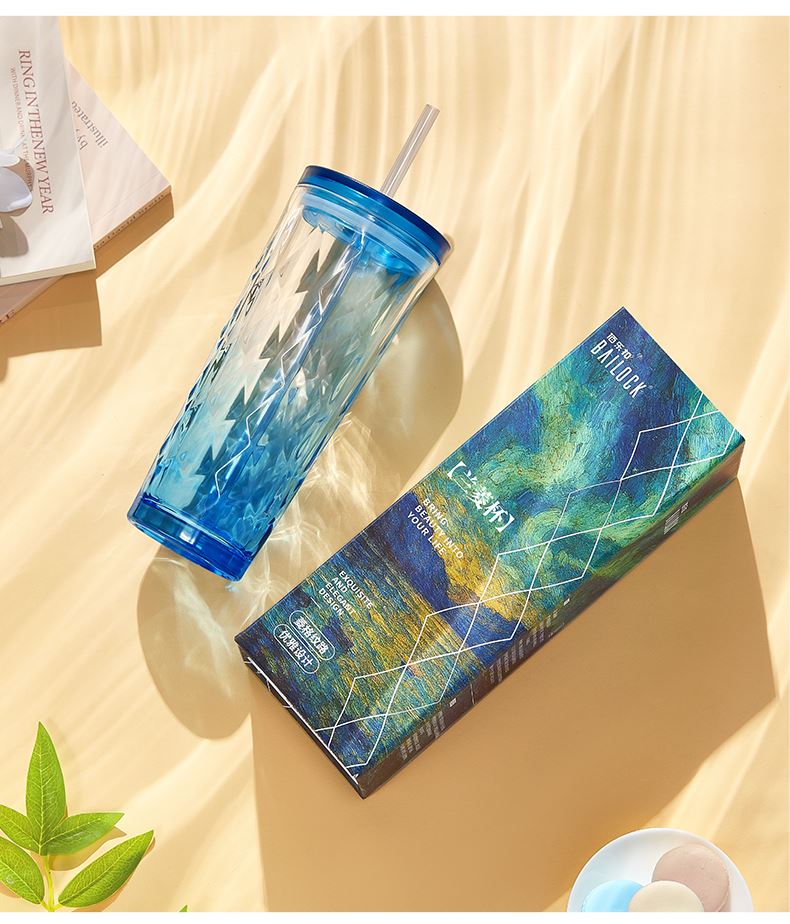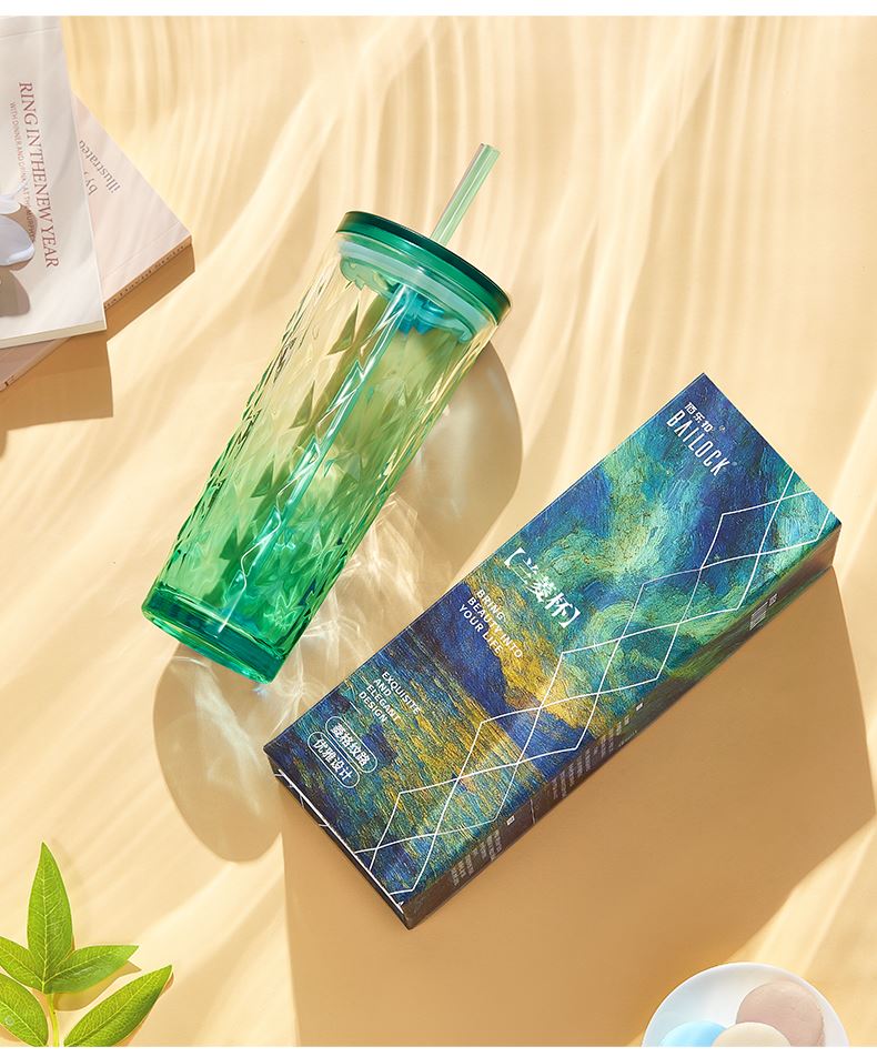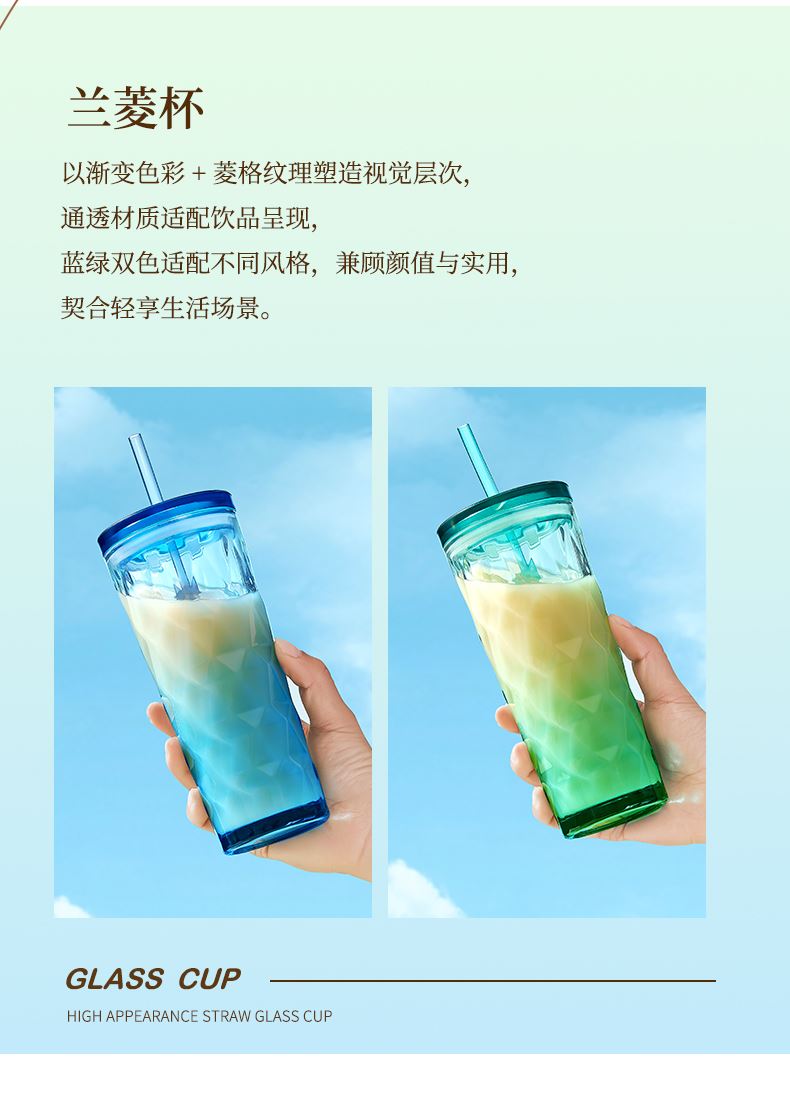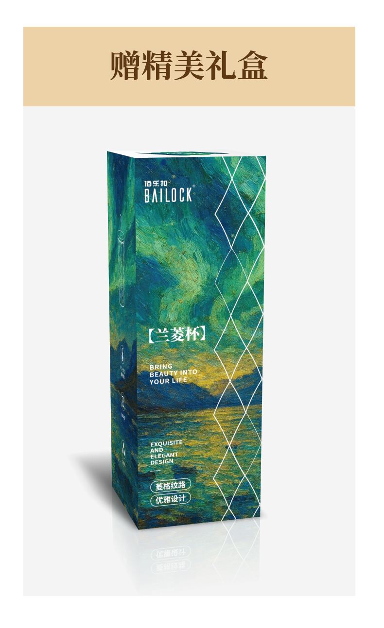 材 质:钠钙玻璃、PS、食品级硅胶、TRITAN 产品参数:水杯460ml*1 彩盒尺寸:83*83*235mm 外箱尺寸:52.2*26.7*18.8cm 全新一代艺术油画风外包装设计,灵感源自自然光影与现代艺术肌理。 采用超白料质打造,远超同类玻璃光泽。加厚玻璃,安全健康,手感细腻。 专为分销客户预留小批量定制窗口。 采用独特菱格切面纹理与渐变通透色彩设计,光影折射出晶莹立体感。
