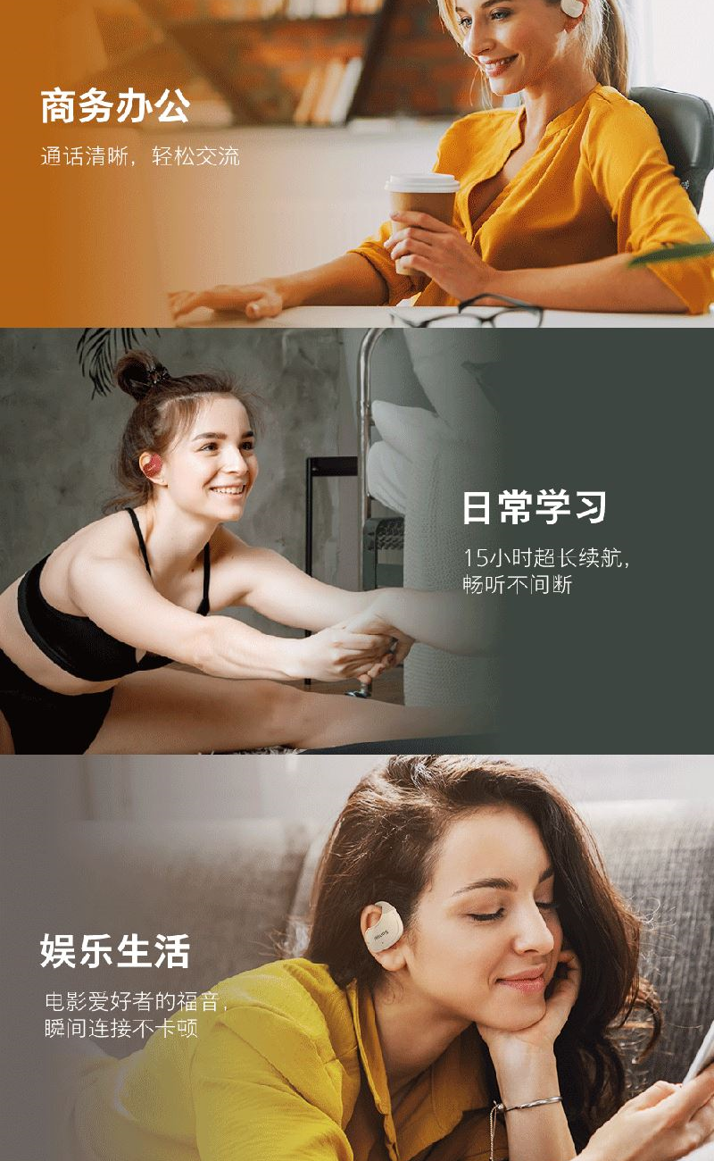 3、开放式设计不入耳,无感零压迫,久戴不掉;