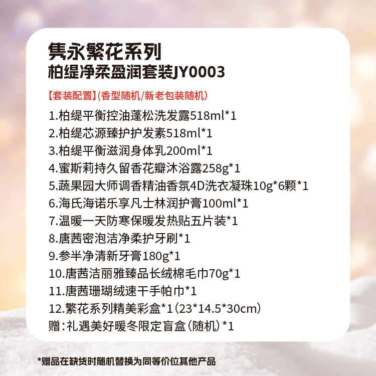 【套装配置】(香型随机/新老包装随机) 1.柏缇平衡控油蓬松洗发露518ml*1 2.柏缇芯源臻护护发素518ml*1 3.柏缇平衡滋润身体乳200ml*1 4.蜜斯莉持久留香花瓣沐浴露258g*1 5.蔬果园大师调香精油香氛4D洗衣凝珠10g*6颗*1 6.海氏海诺乐享凡士林润护膏100ml*1 7.温暖一天防寒保暖发热贴五片装*1 8.唐茜密泡洁净柔护牙刷*1 9.参半净清新牙膏180g*1 10.唐茜洁丽雅臻品长绒棉毛巾70g*1 11.唐茜珊瑚绒速干手帕巾*1 12.繁花系列精美彩盒*1(23*14.5*30cm) 赠:礼遇美好暖冬限定盲盒(随机)*1