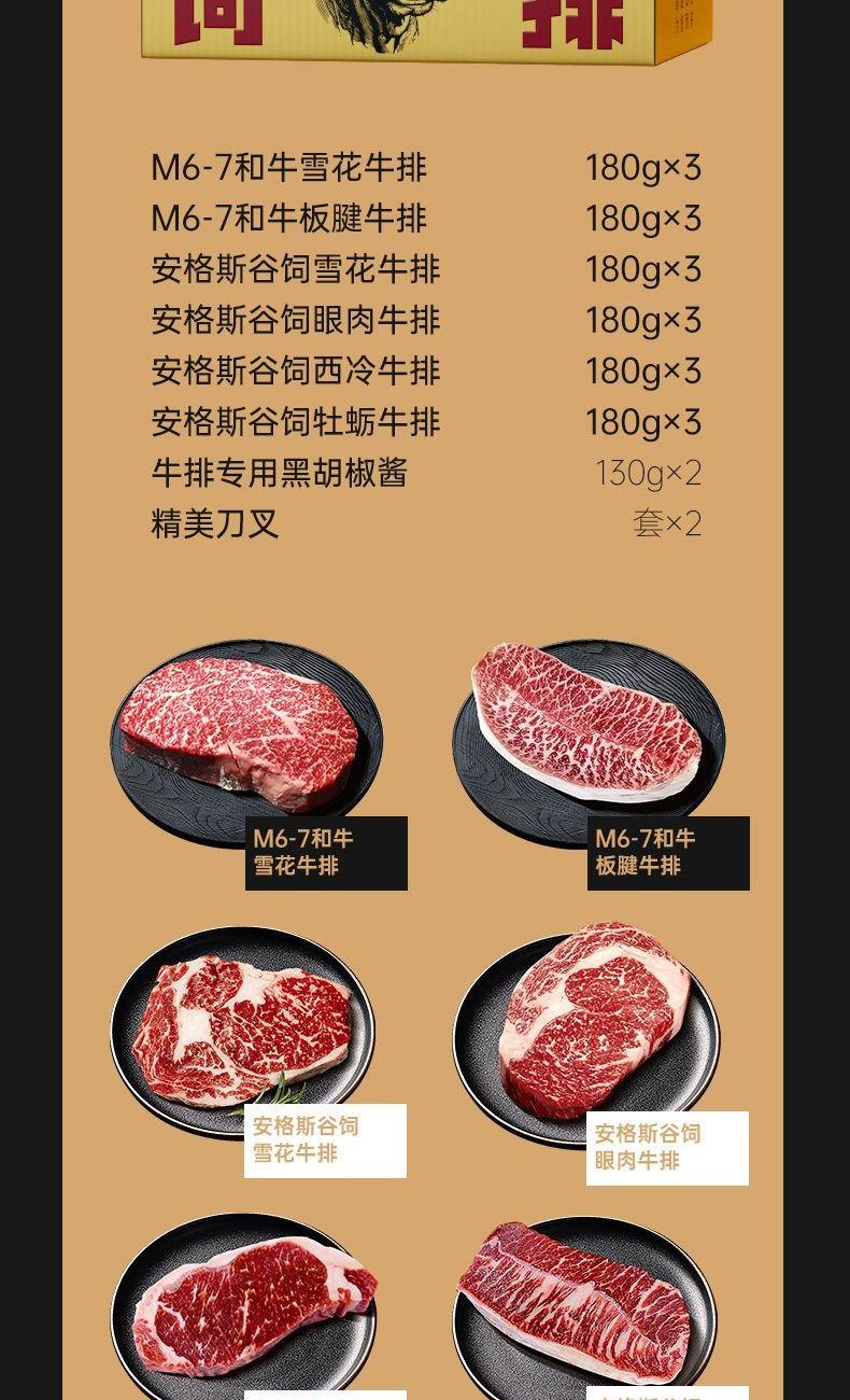 M6-7和牛雪花牛排 180gx3 盒 M6-7和牛板腱牛排 180gx3 盒 安格斯谷饲雪花牛排 180gx3 盒 安格斯谷饲眼肉牛排 180gx3 盒 安格斯谷饲西冷牛排 180gx3 盒 安格斯谷饲牡蛎牛排 180gx3 盒 牛排专用黑胡椒酱 130gx2 袋 精美刀叉 x2 套 净含量:3240g