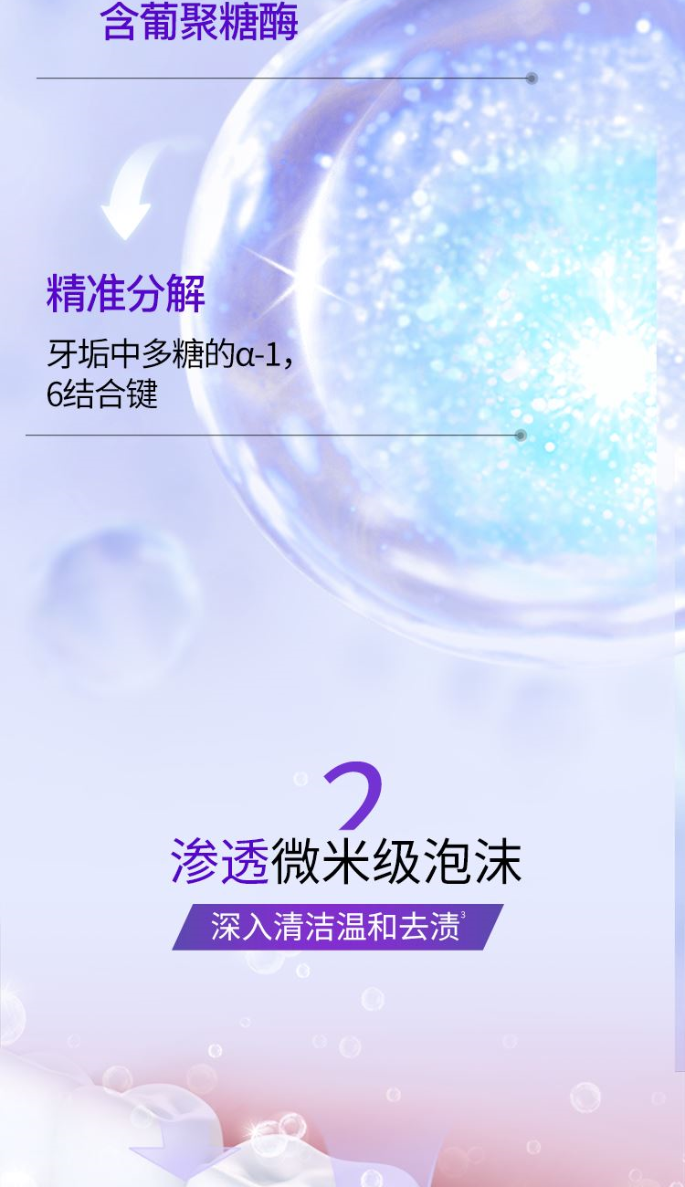 1-定向释放焕白配方 2-渗透微米级泡沫,深入清洁,温和去渍 3- 有效抵抗多种色素,防渍固白