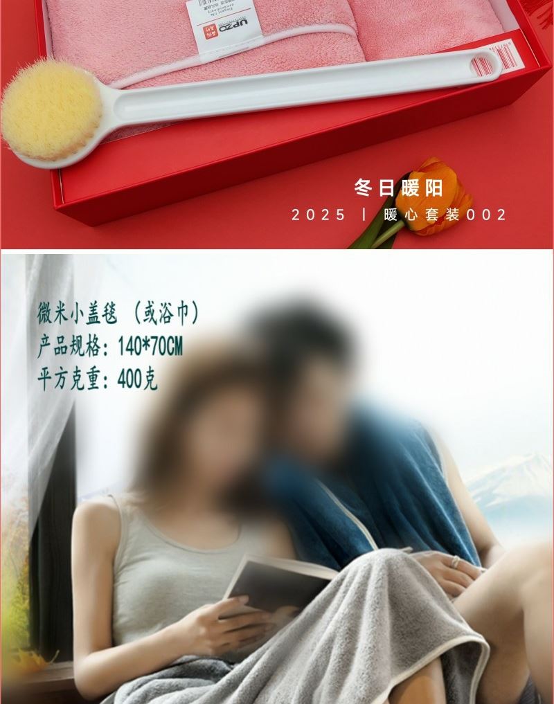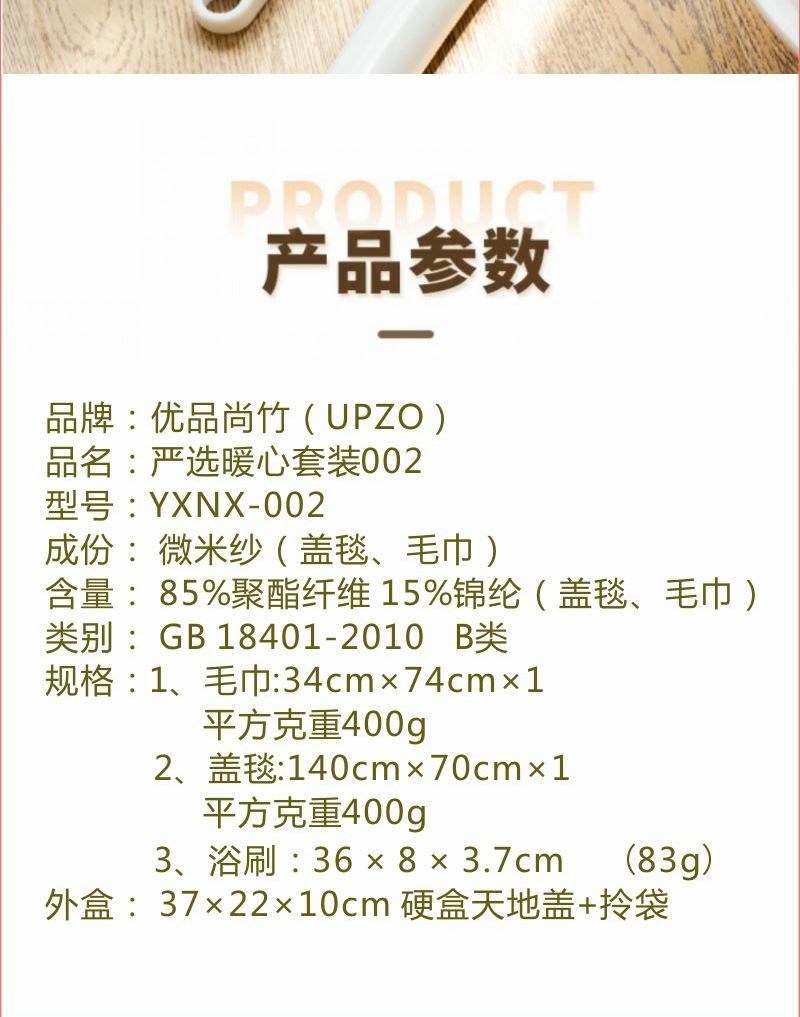 型号: YXNX-002 成份: 盖毯 毛巾 微米纱 含量: 盖毯 毛巾 85%聚酯纤维 15%锦纶 产品: 毛巾:34cm×74cm×1 (平方克重400 g) 盖毯:140cm×70cm×1 (平方克重400 g) 浴刷:36 × 8 × 3.7cm×1 (83g) 礼盒: 37×22×10cm 硬盒天地盖+拎袋 微米纱加厚设计 精致包边工艺 拒绝勾丝 搭配精品洗澡刷 大礼盒精装版卫浴套装