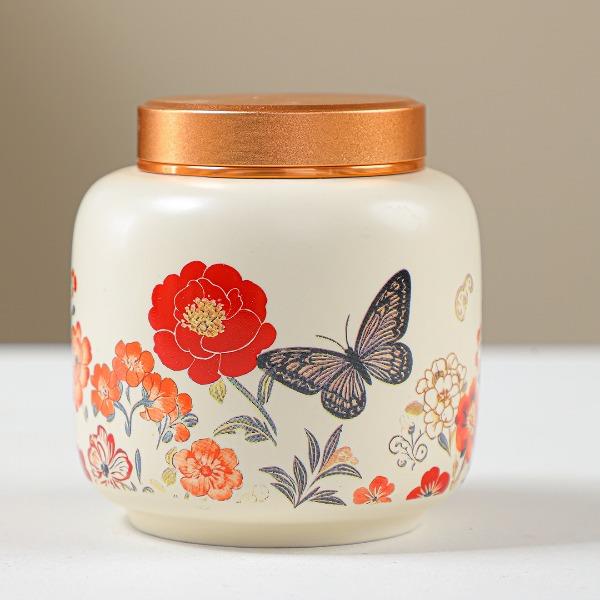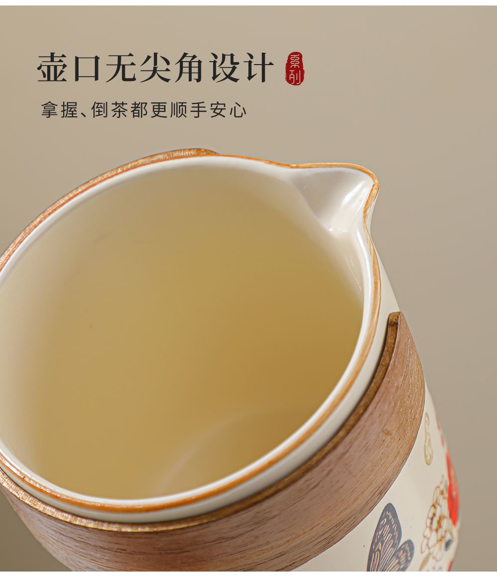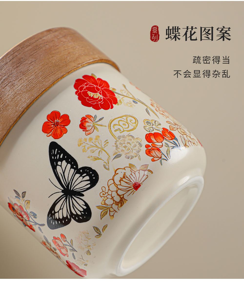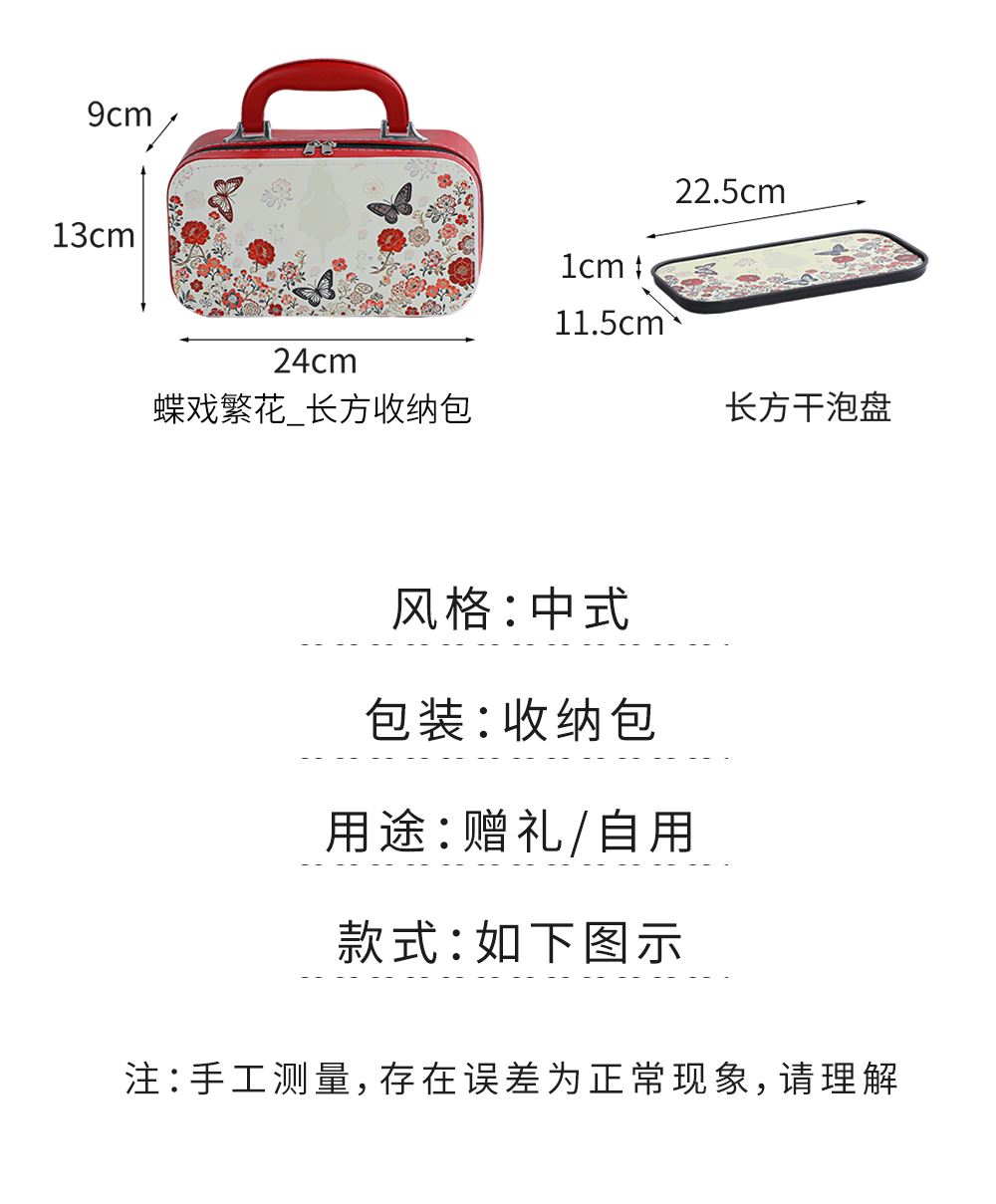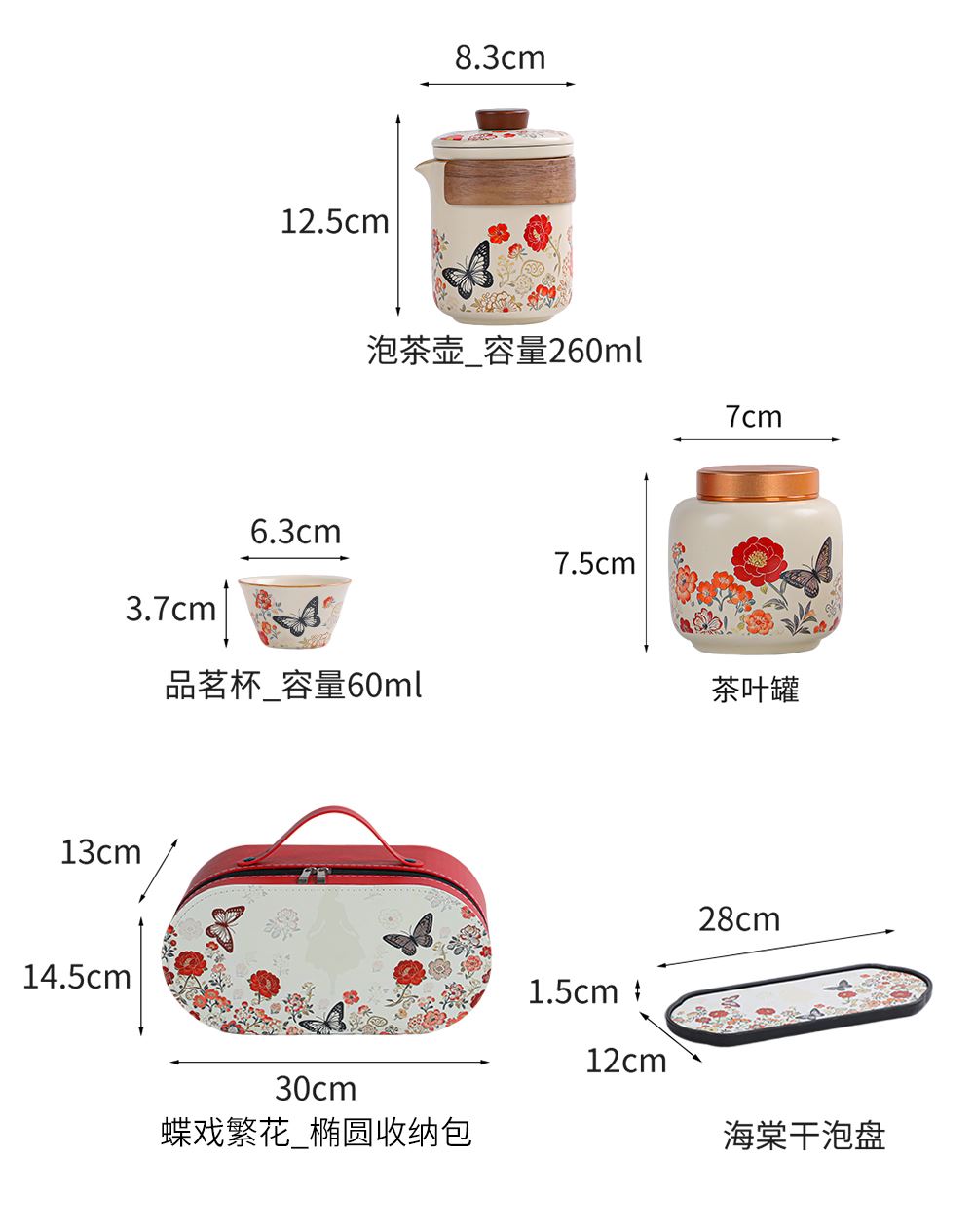 壶:12.5*8.3厘米 260ml 茶叶罐:7.5*7厘米 品茗杯:6.3*3.7厘米60ml 礼盒:30*14.5*13厘米 天然矿物釉,高温烧制无铅镉 ,花面清新,寓意美好,搭配礼盒包装,自用赠礼两宜。