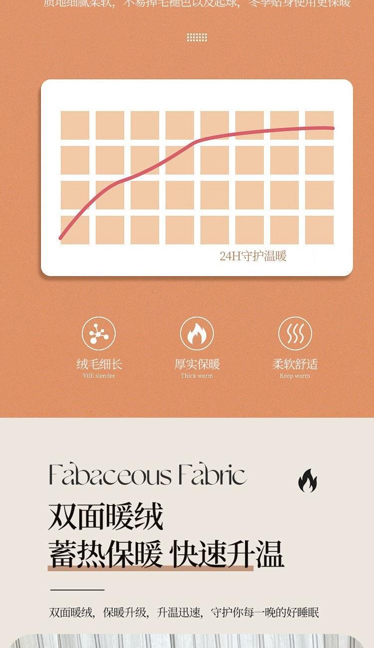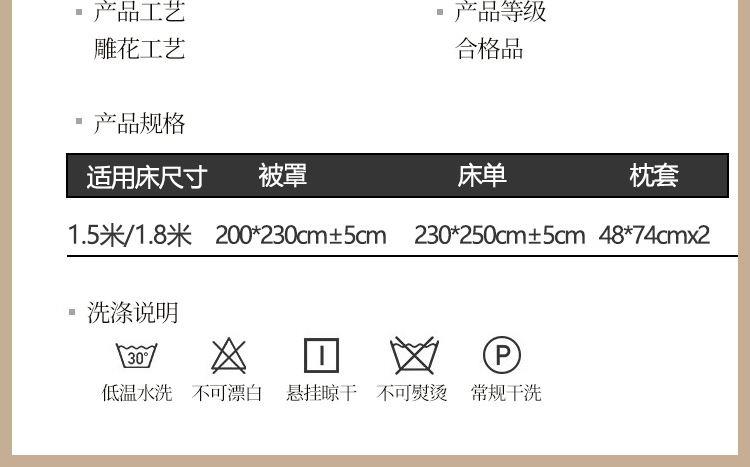 规格: 床单:230*250cm±5cm 被罩:200*230cm 枕套:48*74cmx2 面料:牛奶绒雕花绒(聚酯纤维) 重量:3.4KG 1、双面牛奶绒面料拥有丰厚的绒毛,手感极其柔软 2、特使工艺处理,内外循环,排汗速干 3、活性印染设计,色彩清晰耐看,久用如新