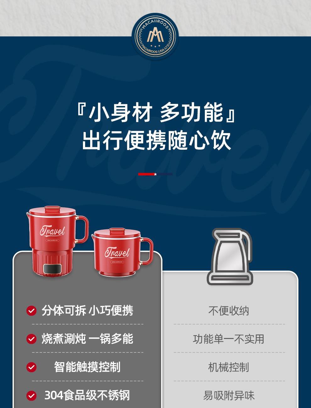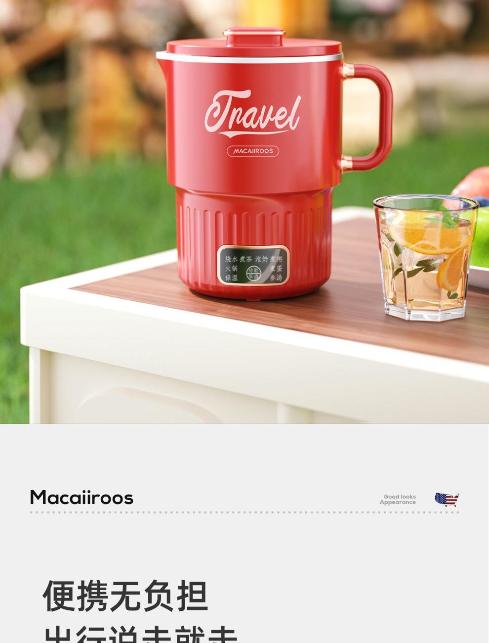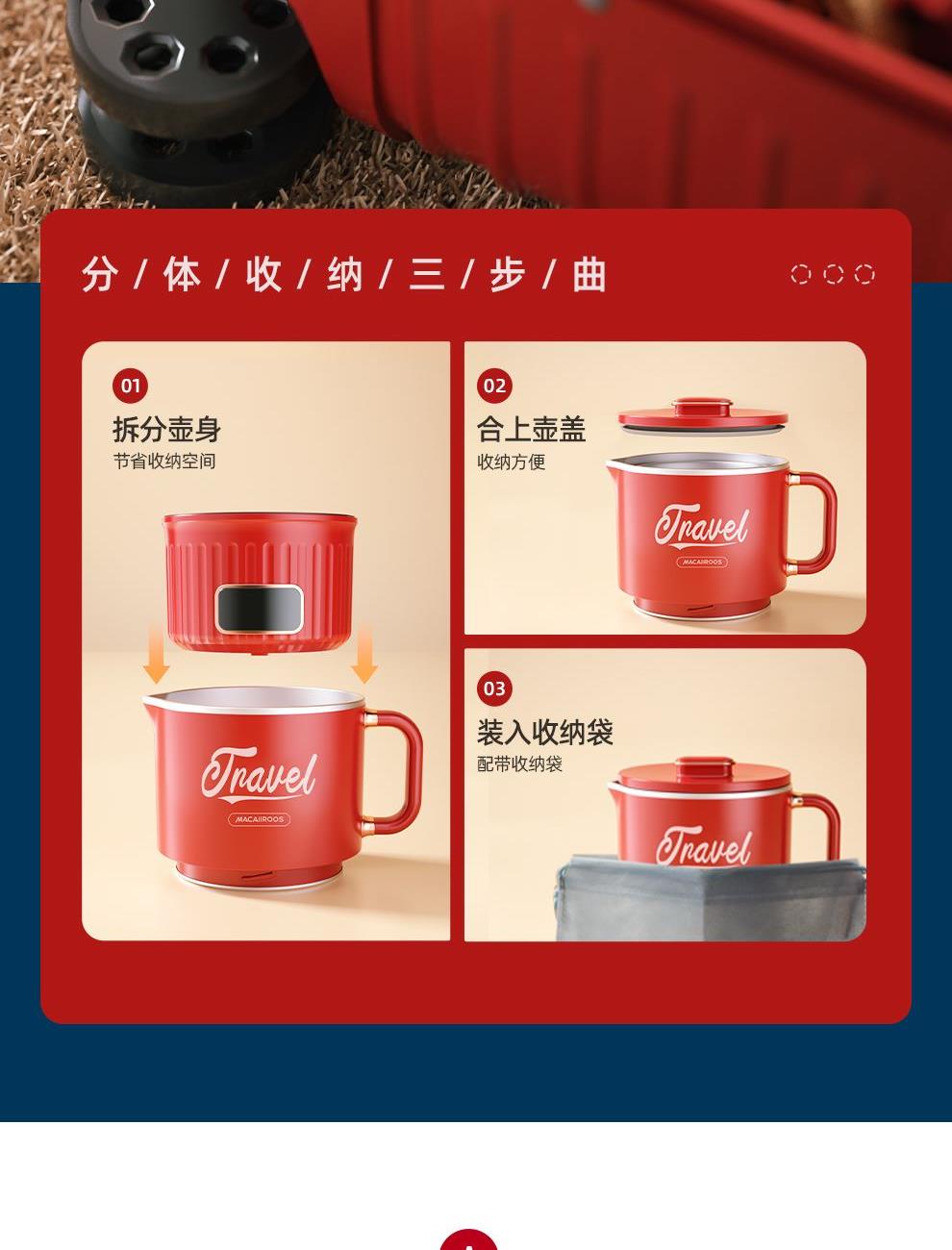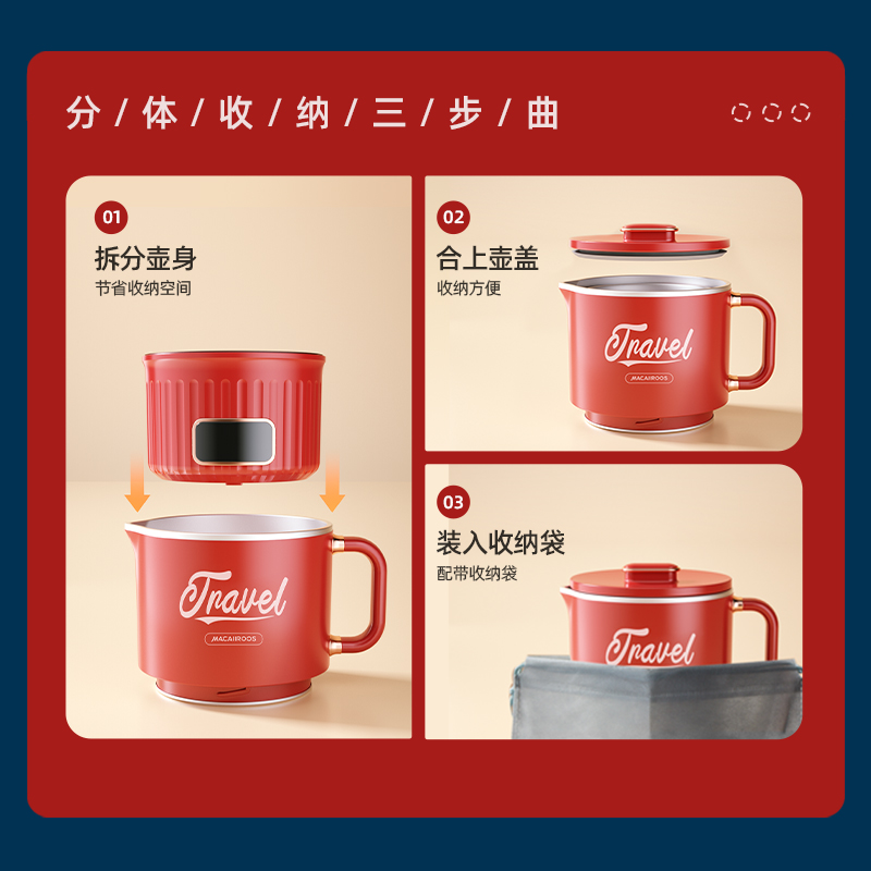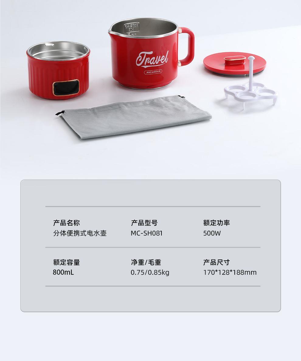 额定功率:500W 额定容量:800mL 额定电压:220V~ 额定频率:50Hz 产品净重:0.75kg 产品毛重:0.85kg 整箱重量:21.6kg 装 箱 数:24台/箱 一机多能八大功能菜单,集烧水、煮粥、火锅等功能一体,特设保温功能; 可折叠壶身分体可拆便携式水壶,小巧易收纳; 304不锈钢内胆食品接触用材质,耐高温耐腐蚀,保温性强; 产品配置配有煮蛋架、收纳袋,电源线拔插分离设计。