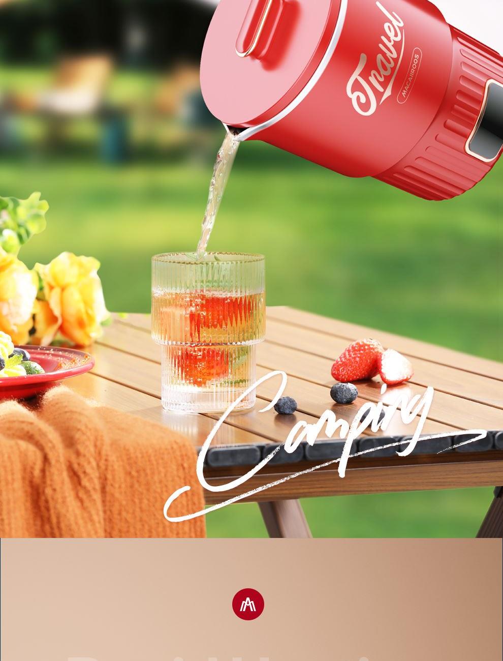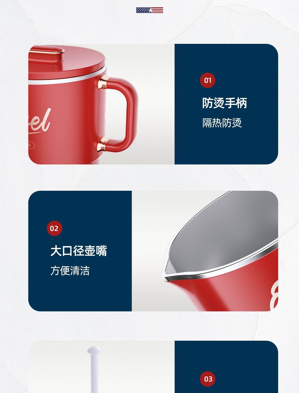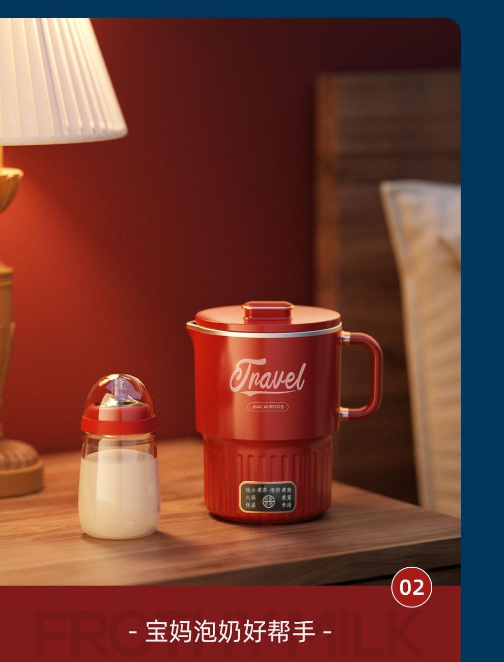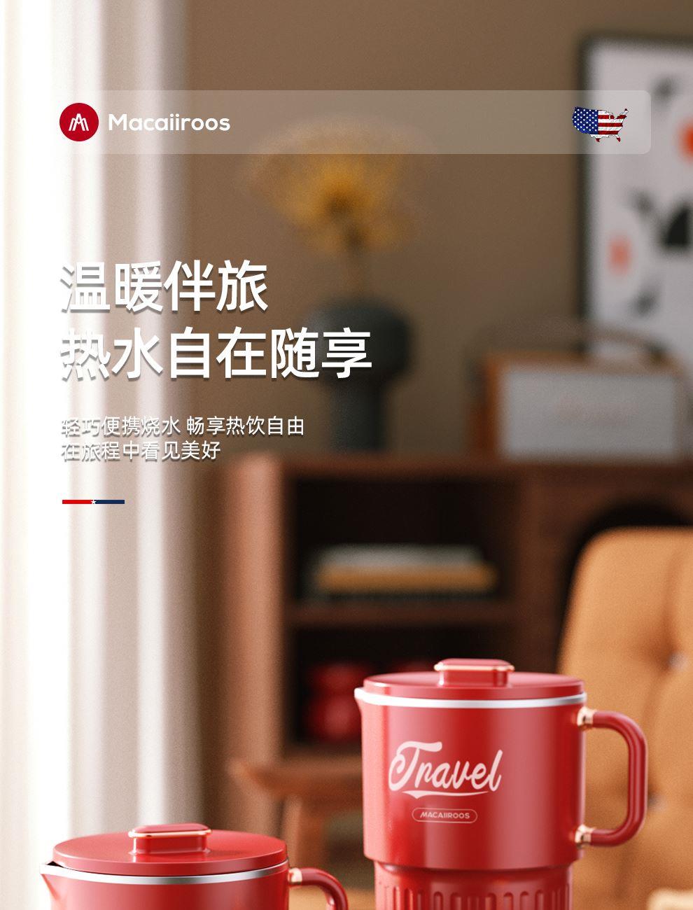 额定功率:500W 额定容量:800mL 额定电压:220V~ 额定频率:50Hz 产品净重:0.75kg 产品毛重:0.85kg 整箱重量:21.6kg 装 箱 数:24台/箱 一机多能八大功能菜单,集烧水、煮粥、火锅等功能一体,特设保温功能; 可折叠壶身分体可拆便携式水壶,小巧易收纳; 304不锈钢内胆食品接触用材质,耐高温耐腐蚀,保温性强; 产品配置配有煮蛋架、收纳袋,电源线拔插分离设计。