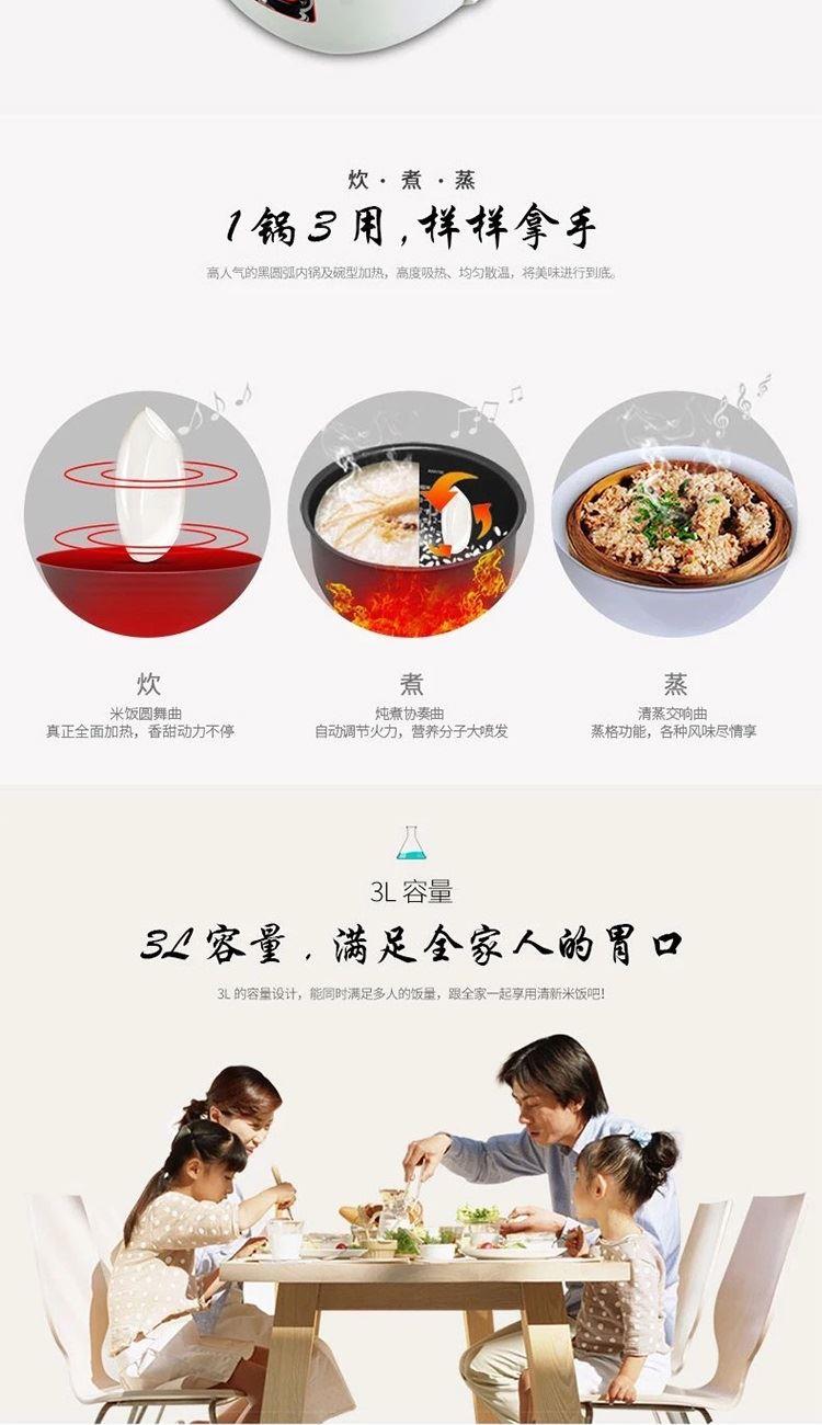 商品毛重:3.5kg; 产品尺寸:25.6*34.9*20.9cm 类别:家用电饭煲; 操作方式:按键式: 容量:3L; 功能:预约,蛋糕,粥,炖汤;内胆材质:黑晶;加热方式:三维立体加热; 包装清单: 电饭煲、内胆、调理盘、饭勺、汤勺、说明书、质保卡、食谱