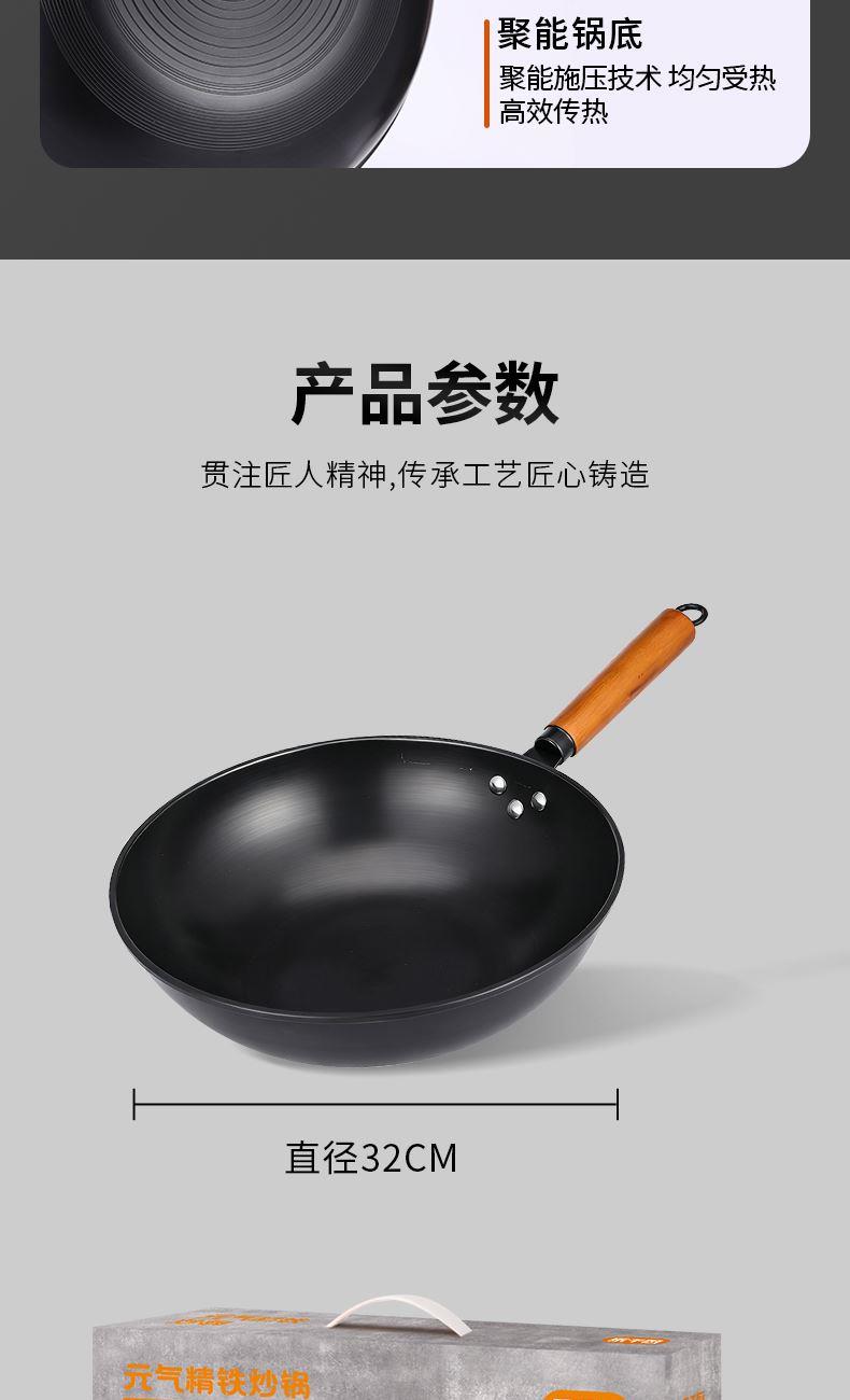 规 格:32cm 材 质:优质精铁 装 箱 数:5pcs/箱 彩 盒 尺 寸:L51.5*W13.2*H36cm 1、采用优质精铁材质防摔抗撞:加厚锅底,受热均匀,使用寿命长。 2、烹饪时可游离出更多铁离子,长期使用可达到补铁效果。 3、采用气氮工艺加工处理,在常规情况下不易生锈,百年工艺提高导热效果,更适合中国女性做饭的习惯。 4、可使用各类锅铲,铁铲、木铲、硅胶铲,均可使用。 5、适用燃气灶、电陶炉、电磁炉等各类灶具。