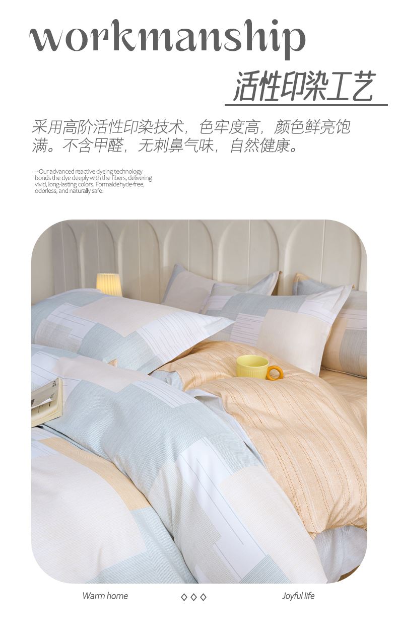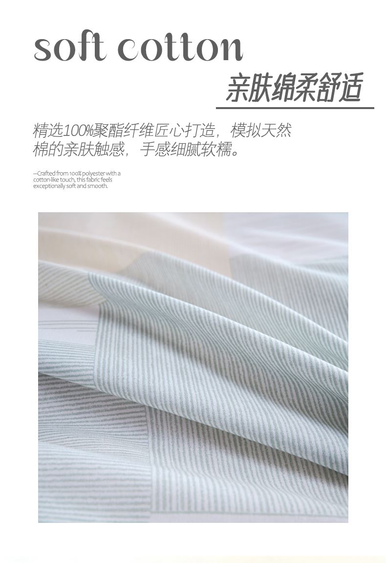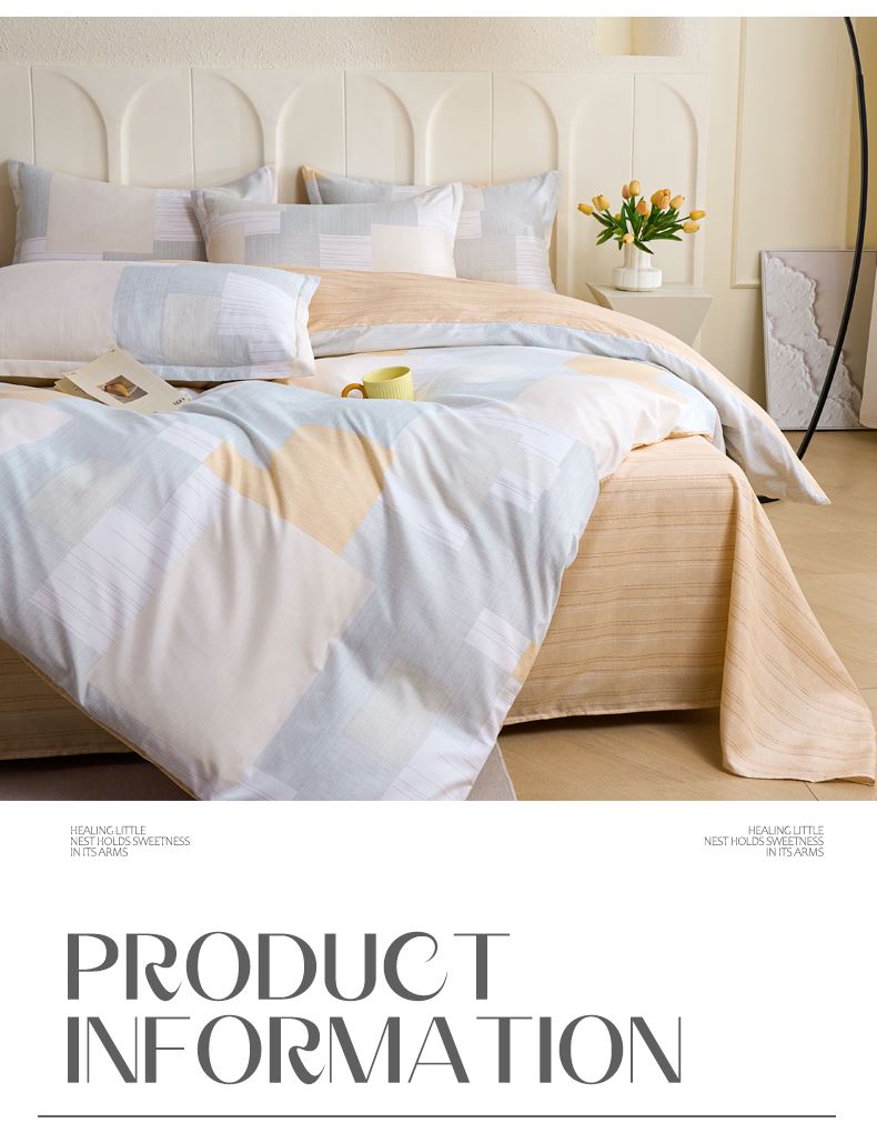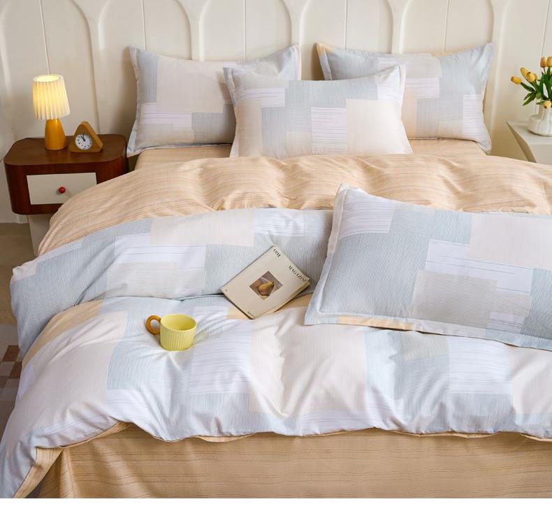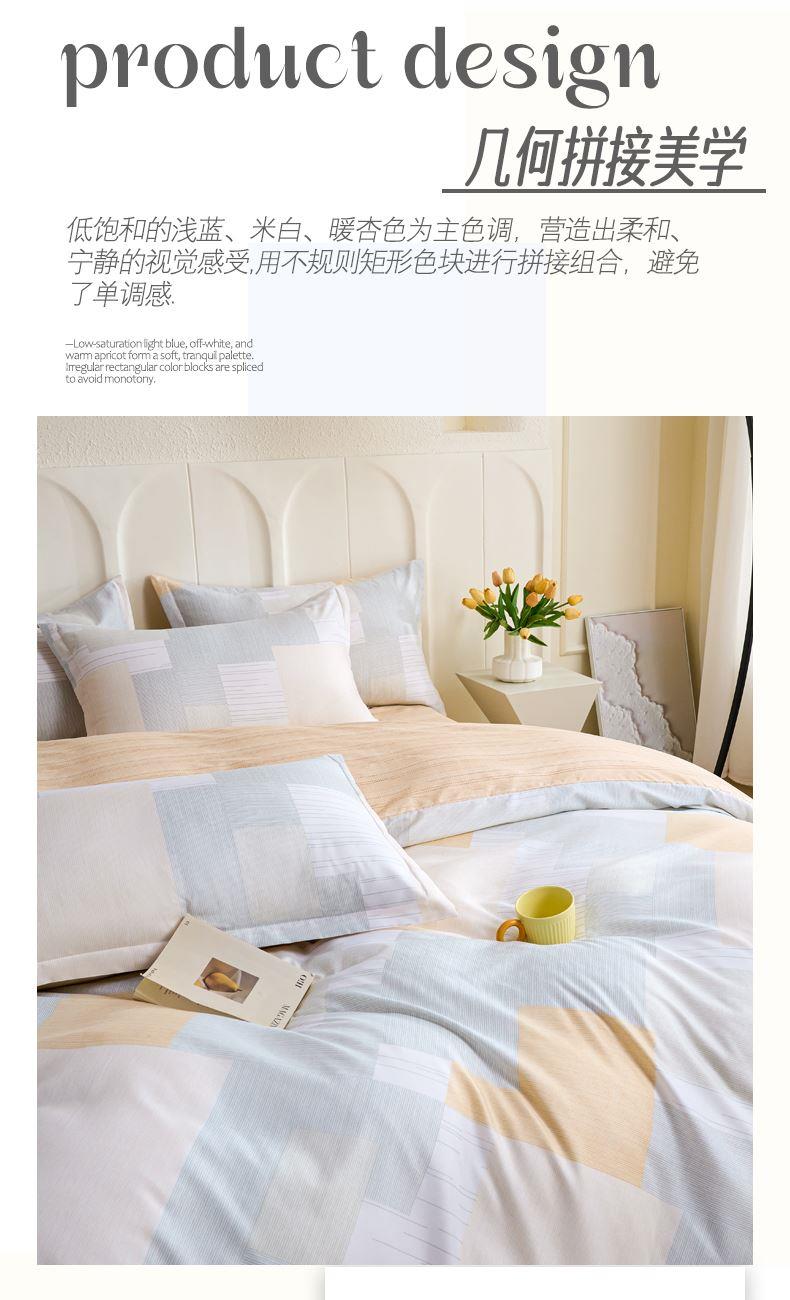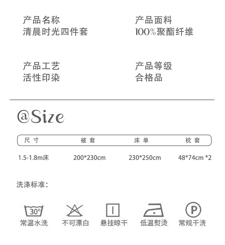 产品参数: 面料:聚酯纤维 规格: 被套200*230cm 床单230*250cm 枕套48*74cm*2只 产品卖点: 亲肤棉感聚酯纤维,柔软细腻不闷汗,耐磨抗皱好打理,机洗不变形 透气亲肤不压身,夜夜安睡不粘腻,柔软贴身,告别粗糙化纤感