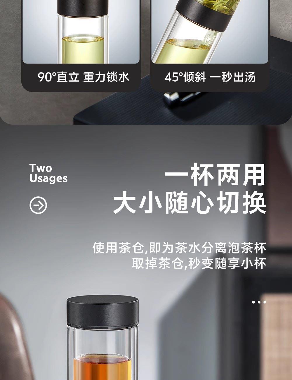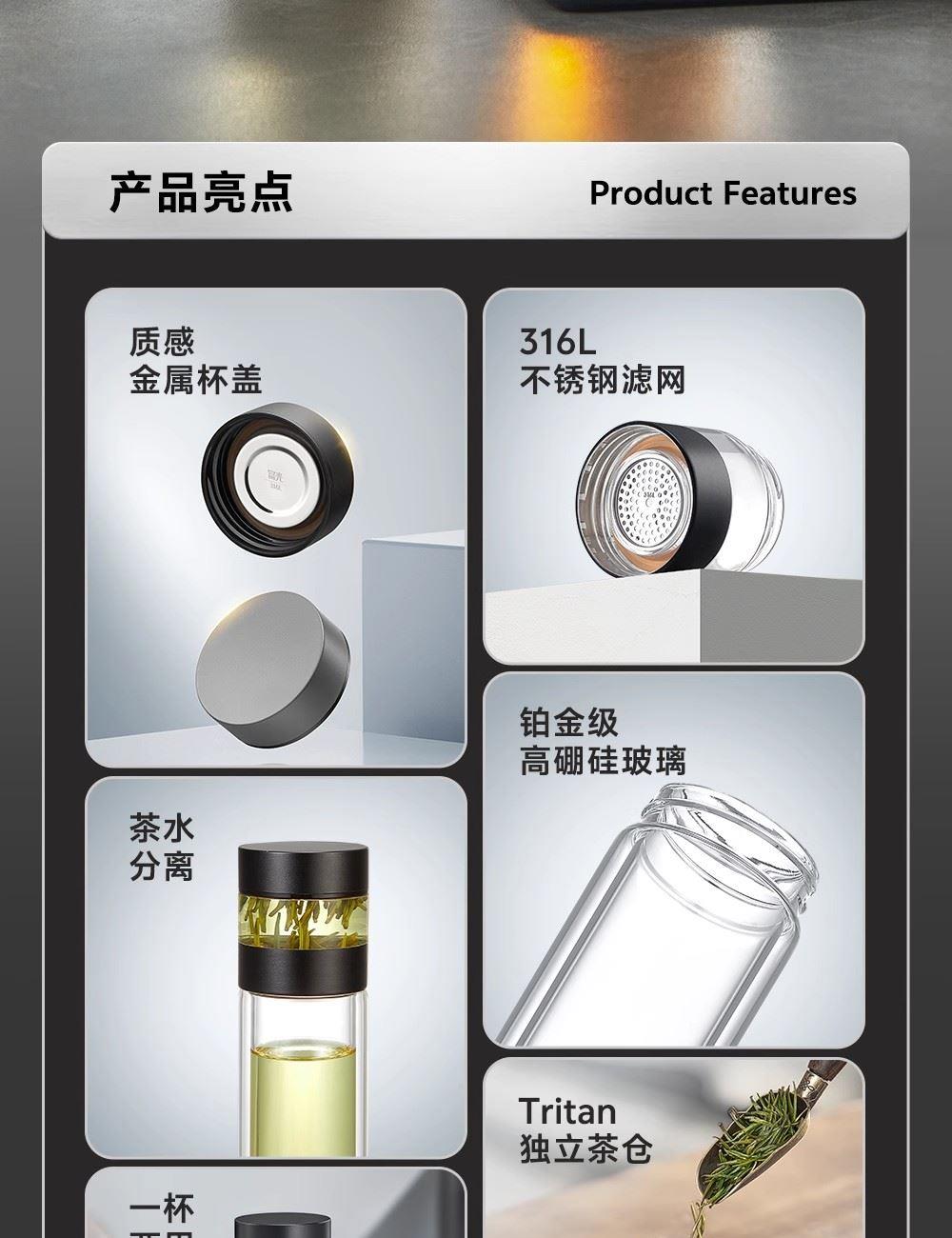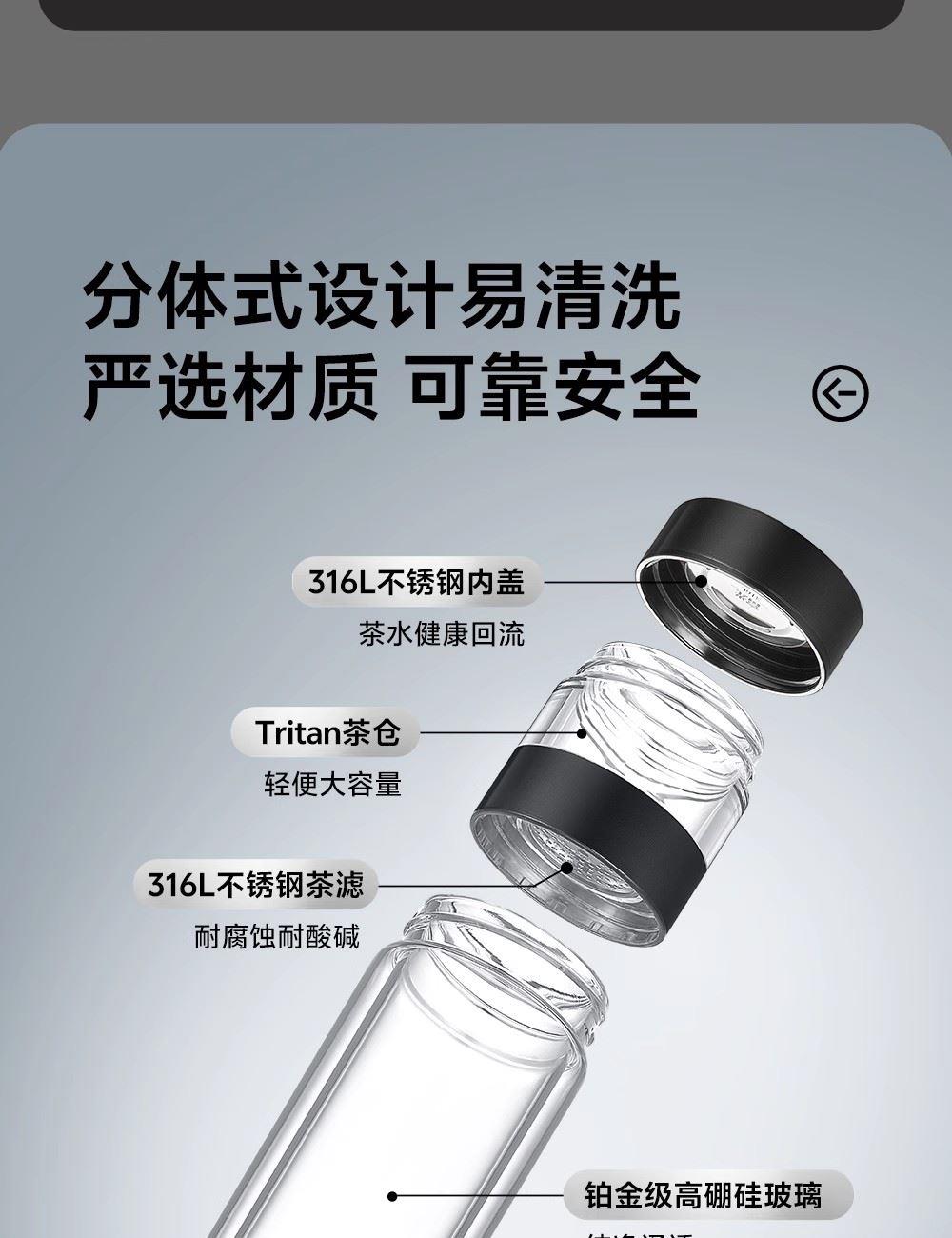容量:300ml 颜色:灰色 蓝色 尺寸:65.5*232mm 材质:铂金级双层高硼硅,加厚一体成型杯底。 金额数磨砂质感杯盖,316L不锈钢,婴幼儿级Tritan独立茶仓。 两种泡茶方式自由选择,一杯两用,大小杯随意切换(去掉茶仓秒变随行小杯),一立一斜实现茶汤分离。 包装:单瓦盒