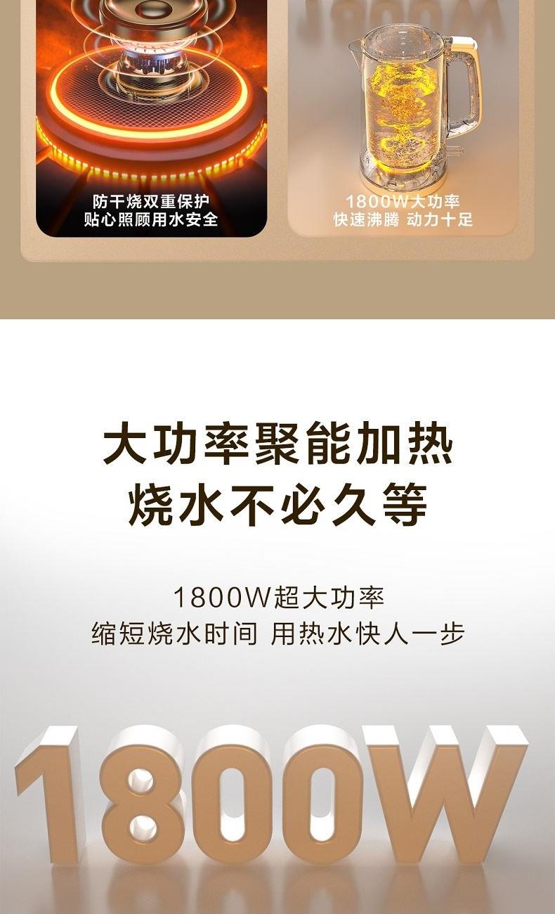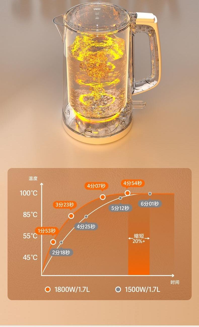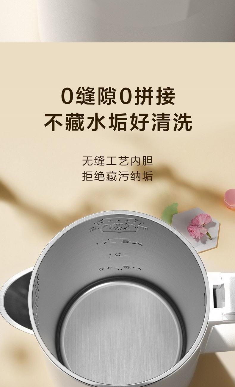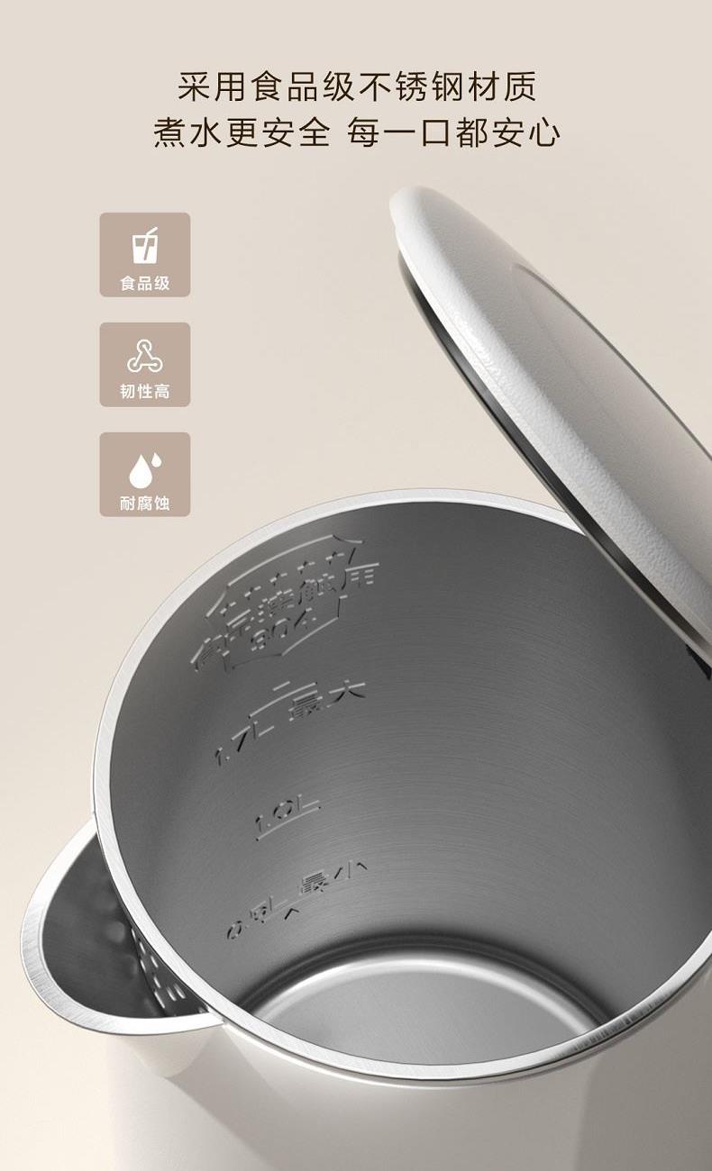 产品尺寸mm:220*156*262 包装尺寸mm:220*220*277 毛重kg:1.40 功率W:1800 配置:1.7L+国产温控器 包装:邮盒 1、简约优雅:简约工艺美学,百搭家居色系 2、畅享容量:1.7L容量,满足全家饮水需求 3、快速沸腾:1800W强大功率,快速烧水不久等 4、便捷清洗:无缝内胆,不藏水垢易清洗 5、材质安全:304食品级不锈钢内胆,安全煮水无异味