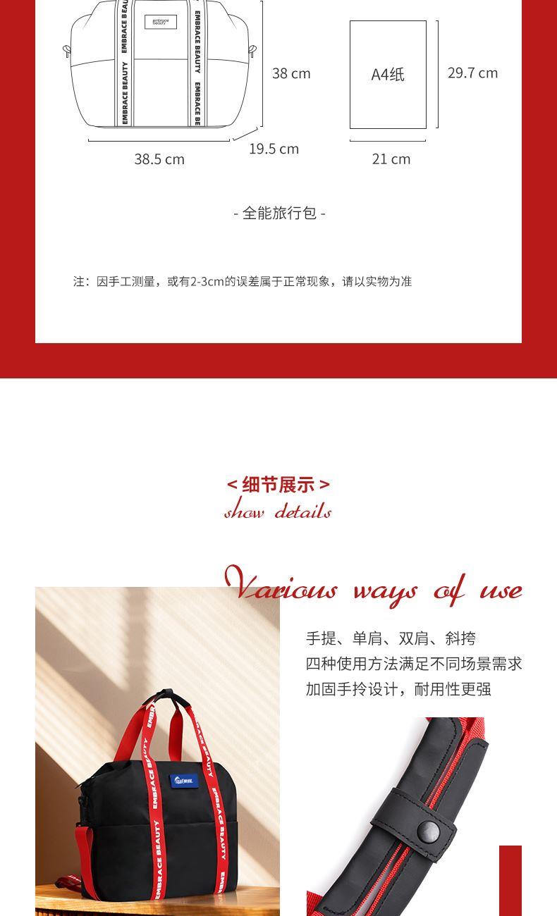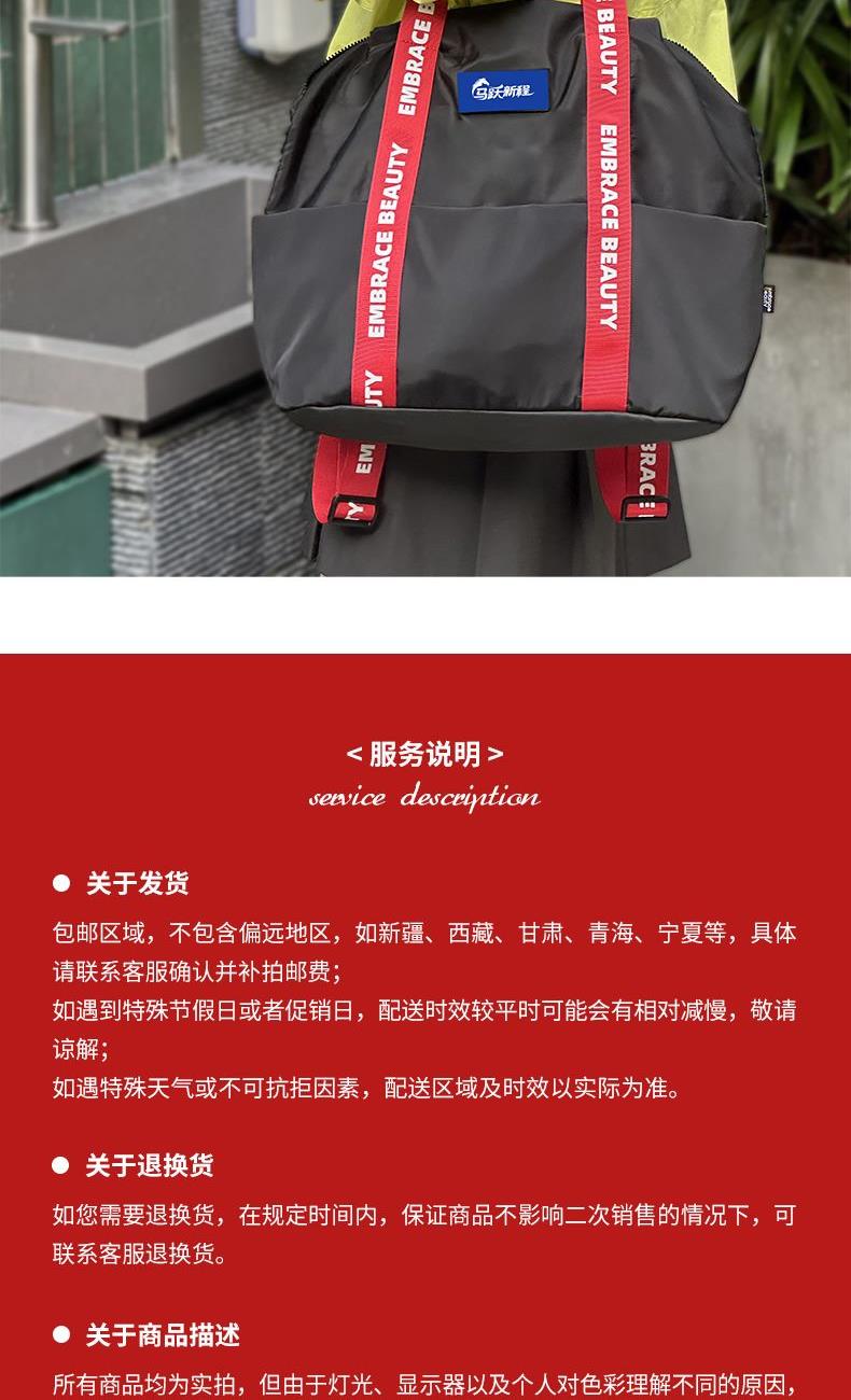 超大容量主仓设计,前仓多个分类收纳插袋,提高了放物品的便利度,后部隐藏式拉链袋一袋两用;既可收纳物品,亦可配合拉杆箱使用(秒变拉杆套);