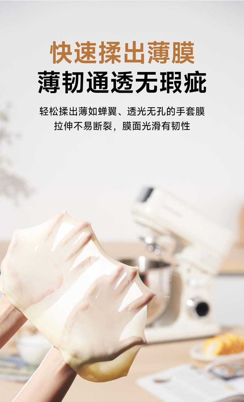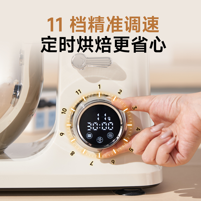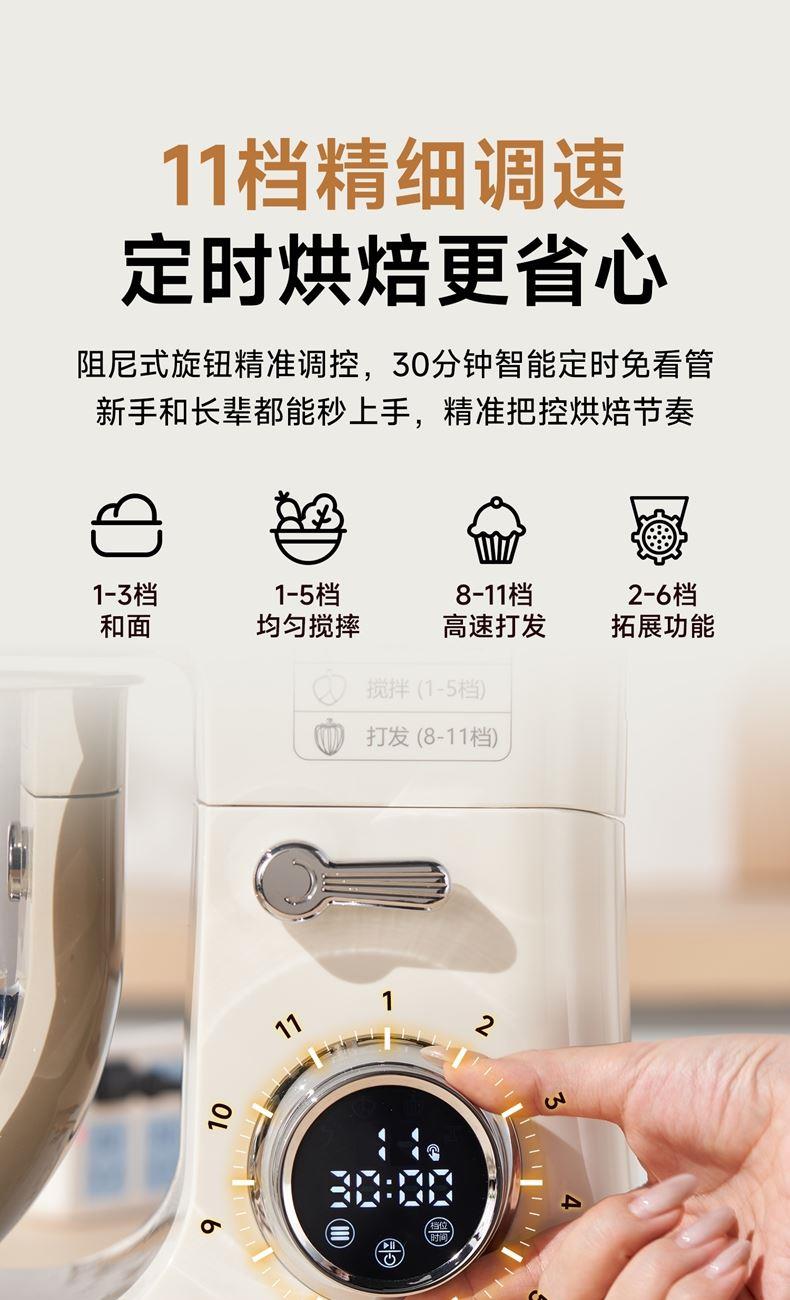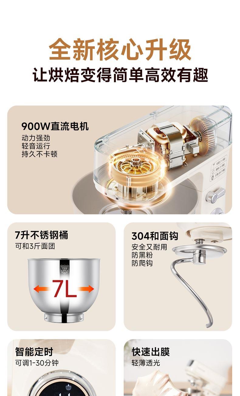 900w直流电机高效轻音运行,成团快,轻松出手套膜 7升家用大容量 11档调速,满足不同需求, 30分钟定时免看管 3大预设功能,304和面钩,304打蛋笼,搅拌桨配件, 触控屏+旋钮交叉控制 支持扩展接口,配件需另购;