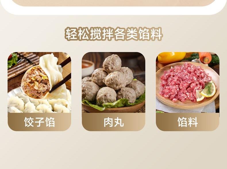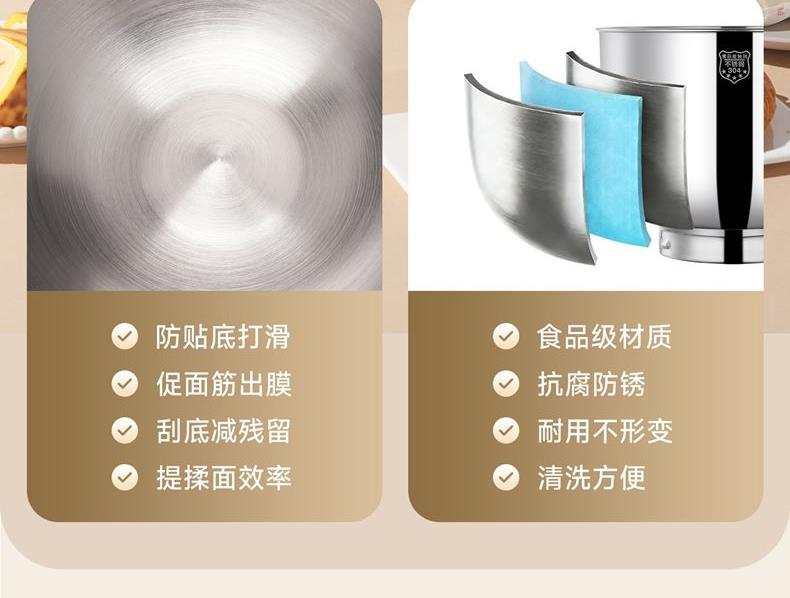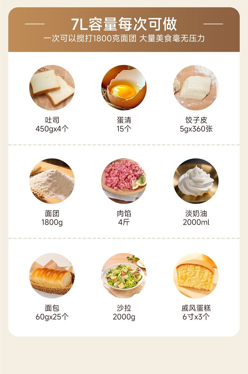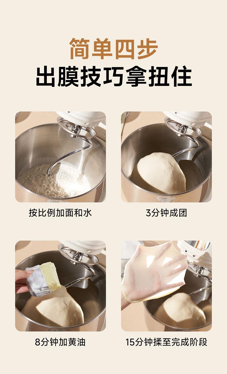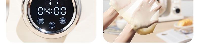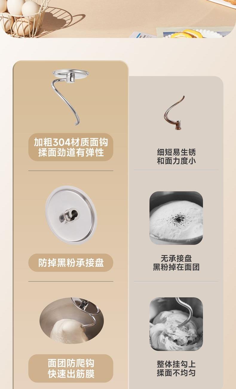 900w直流电机高效轻音运行,成团快,轻松出手套膜 7升家用大容量 11档调速,满足不同需求, 30分钟定时免看管 3大预设功能,304和面钩,304打蛋笼,搅拌桨配件, 触控屏+旋钮交叉控制 支持扩展接口,配件需另购;