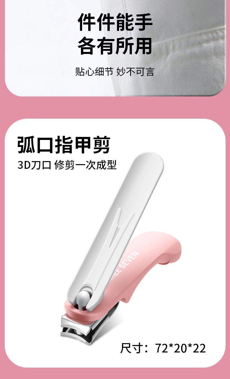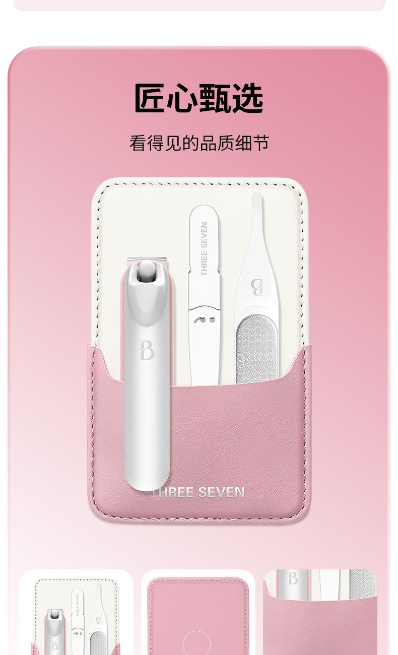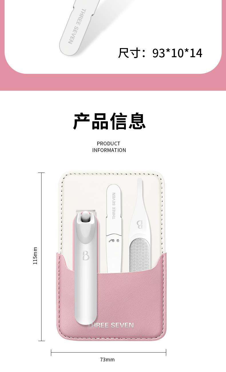 777指甲刀套装360°旋转指甲剪 3件套PL035粉 材质:优质不锈钢 规格:115*73*16mm 产品颜色:粉色 套装内容:3件套 产品配件:弧口指甲刀、锉片、眉夹 产品特色:3D弧口刀头,360度可旋转,隐藏磁吸小皮板,兼具实用与颜值,工具不再躲猫猫,小清新马卡龙配色