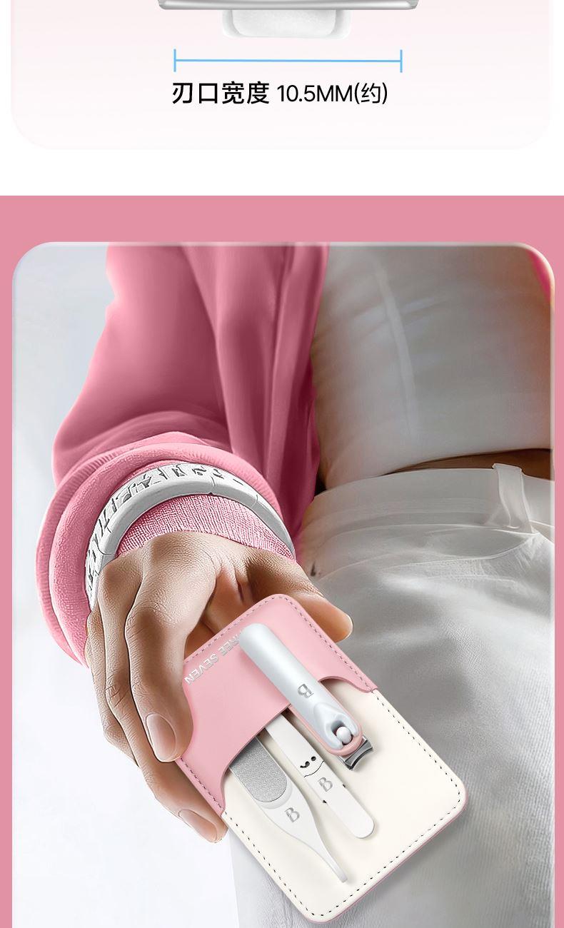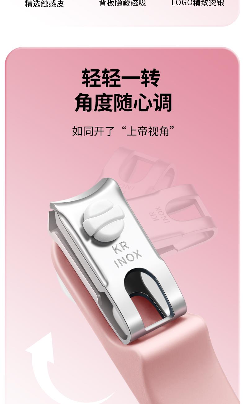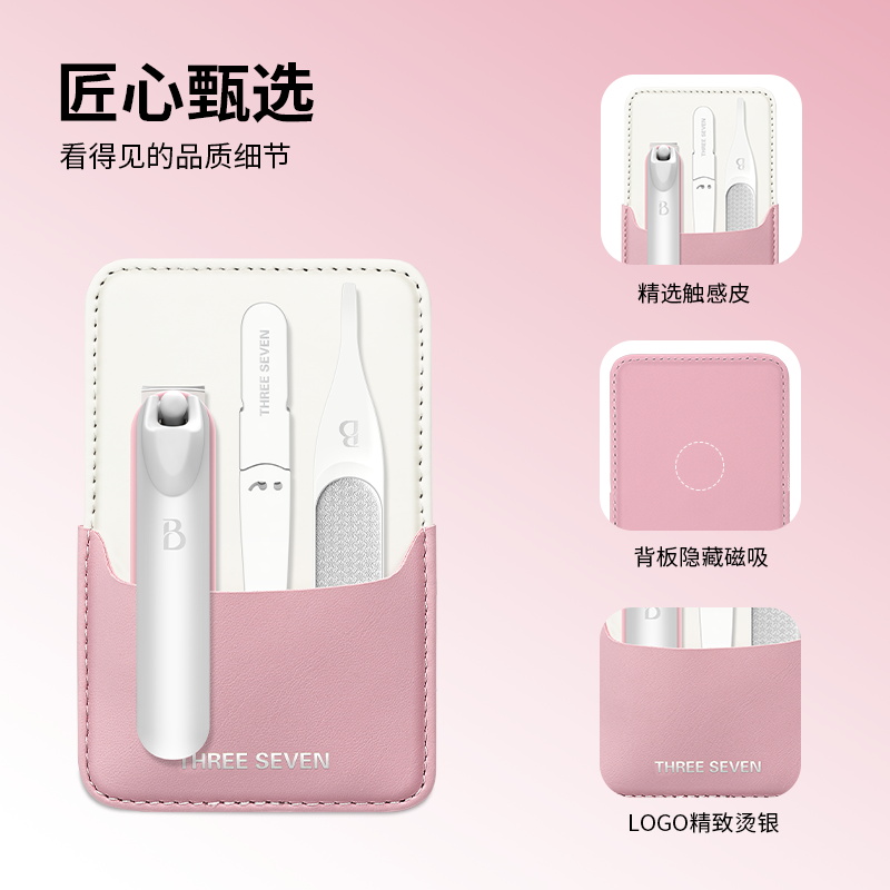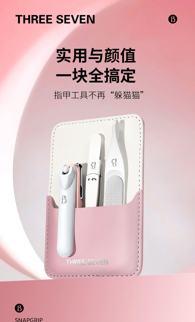 777指甲刀套装360°旋转指甲剪 3件套PL035粉 材质:优质不锈钢 规格:115*73*16mm 产品颜色:粉色 套装内容:3件套 产品配件:弧口指甲刀、锉片、眉夹 产品特色:3D弧口刀头,360度可旋转,隐藏磁吸小皮板,兼具实用与颜值,工具不再躲猫猫,小清新马卡龙配色