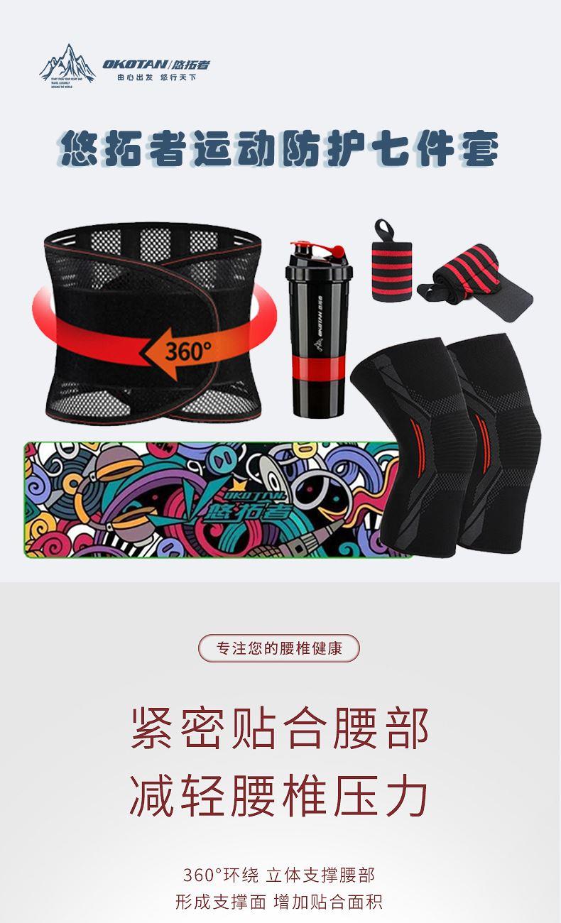 配置:运动透气护腰X1+运动护膝X1副+运动护腕X1对+运动毛巾X1 +运动多用水壶X1
