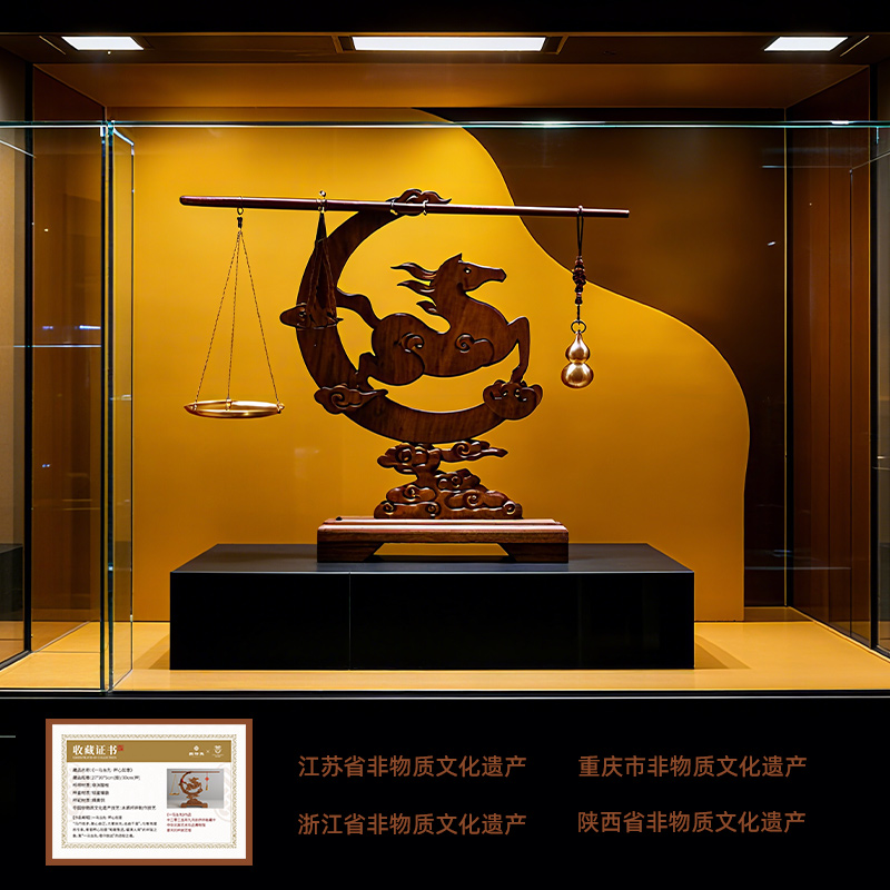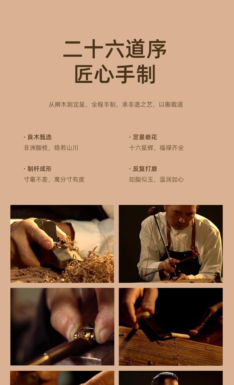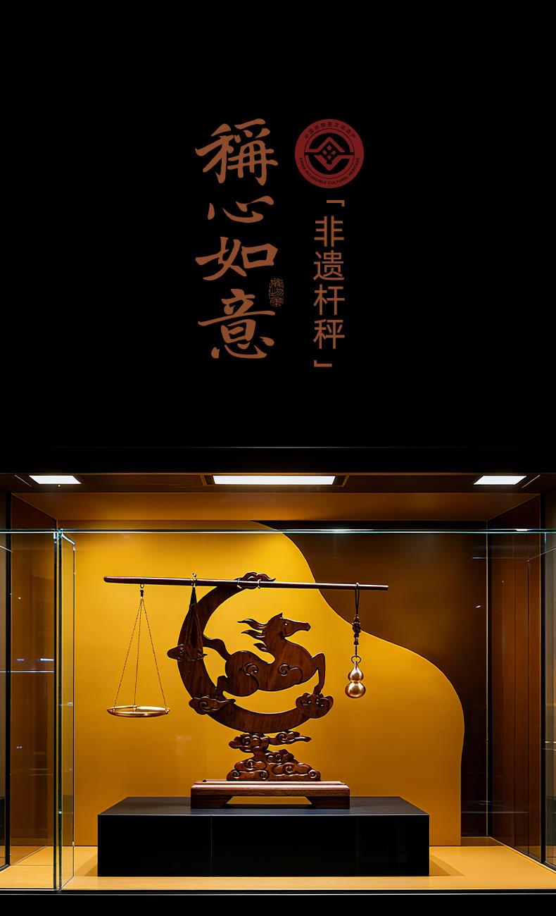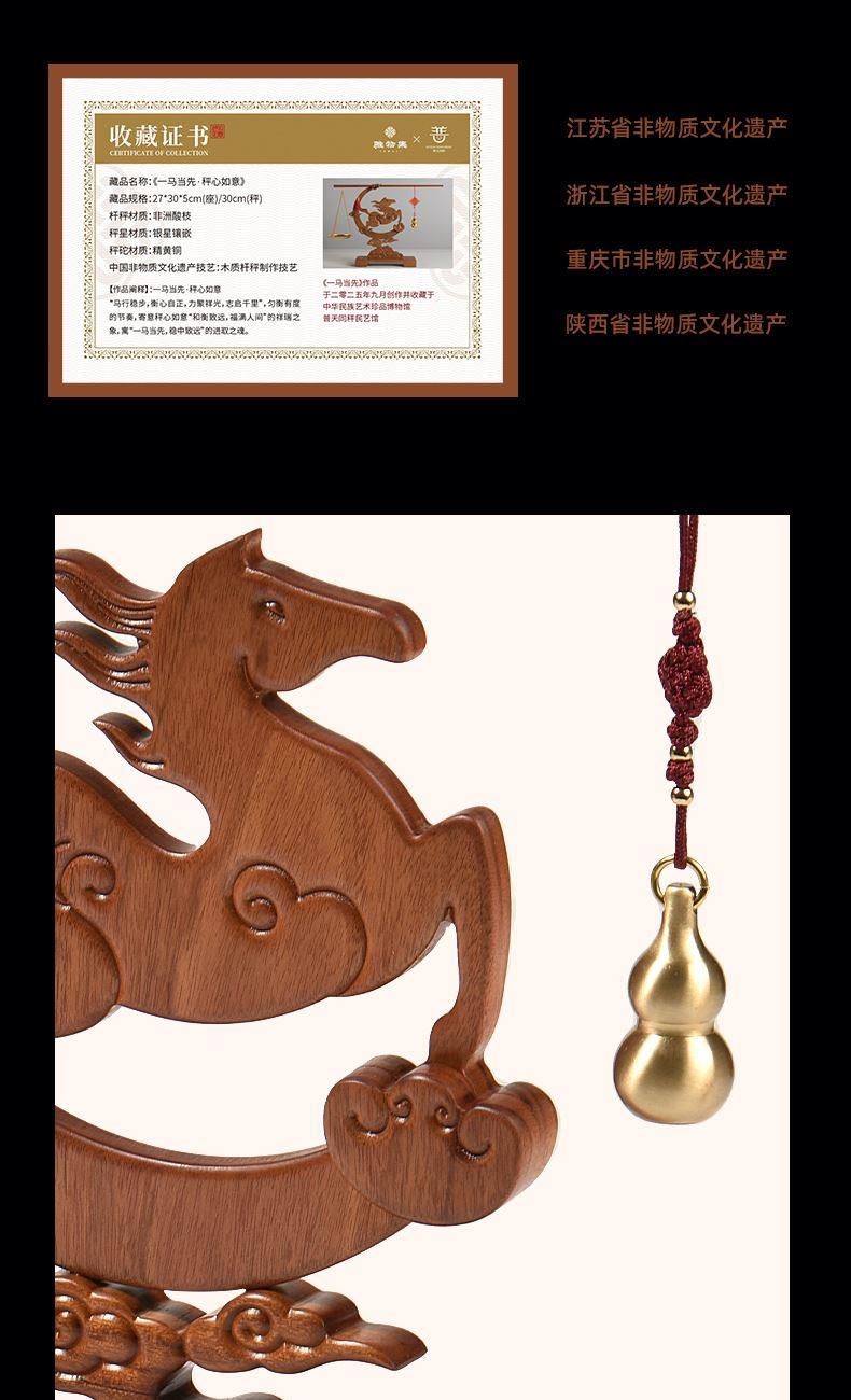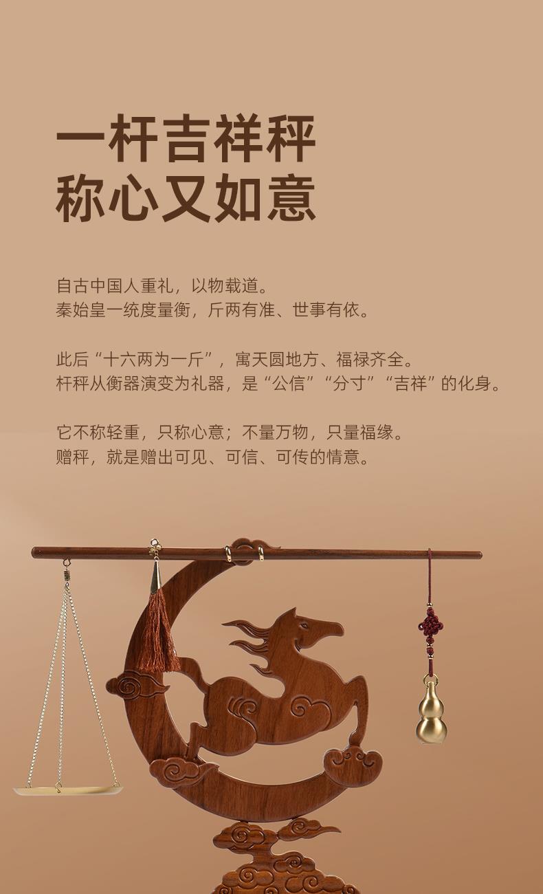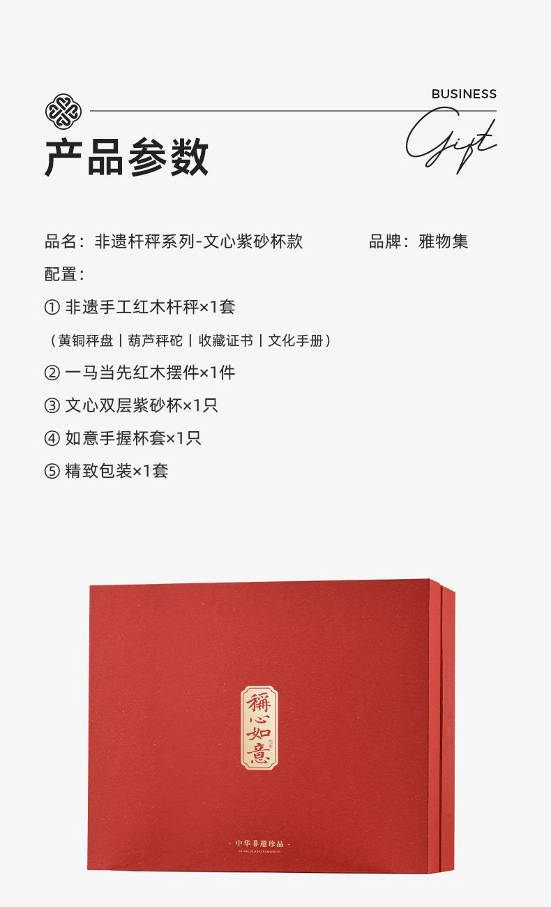 配置 · ① 非遗手工红木杆秤×1套 (黄铜秤盘丨葫芦秤砣丨收藏证书丨文化手册) ② 红木摆件×1件 ③ 文心双层紫砂杯×1只 ④ 如意手握杯套×1只 ⑤ 精致包装×1套