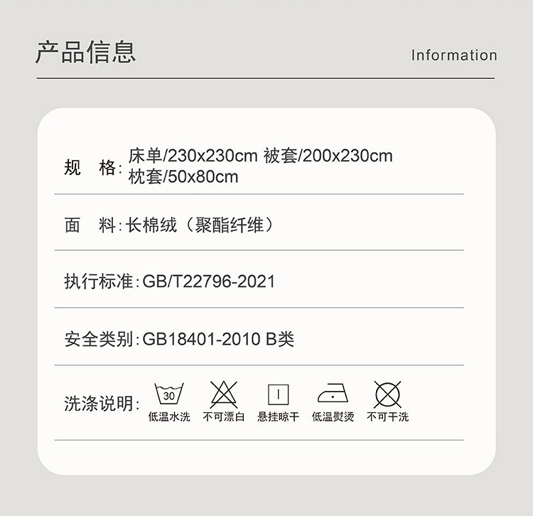 床单:230x230cm 被套:200x230cm 枕套:50x80cm 【面 料】长棉绒(聚酯纤维) 产品特点: 1.精选生态长棉绒面料,亲肤透气,细腻柔软; 2.活性印染,不添加劣质涂料,面料柔软,花型立体感强; 3.做工精细,足尺足码。