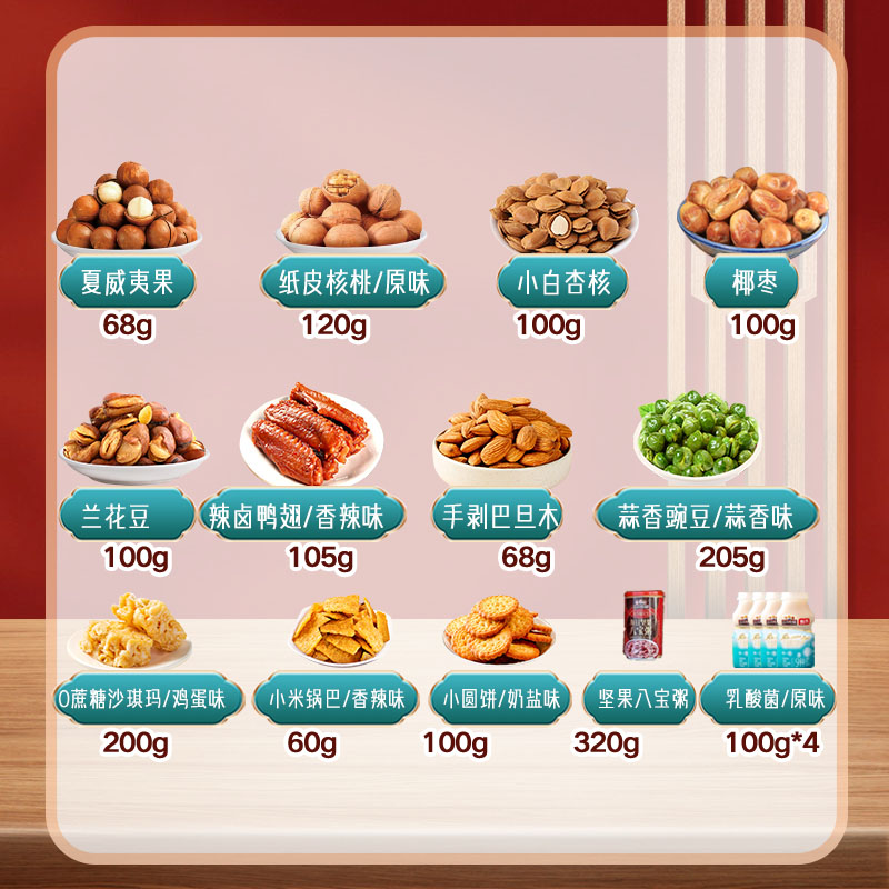 内容物:纸皮核桃/原味/120g 手剥巴旦木/68g 夏威夷果/68g 小白杏核/100g 兰花豆/100g 蒜香豌豆/蒜香味/205g 椰枣/100g 辣卤鸭翅/香辣味/105g 五黑沙琪玛/100g 小米锅巴/香辣味/60g 小圆饼/奶盐味/100g 坚果八宝粥/320g 乳酸菌/原味/100g*4瓶 礼盒尺寸:37*27*12cm 品类丰富,产品便携包装 购物不止于下单,服务长期保持 性价比极高,各价位都有,满足不同选择