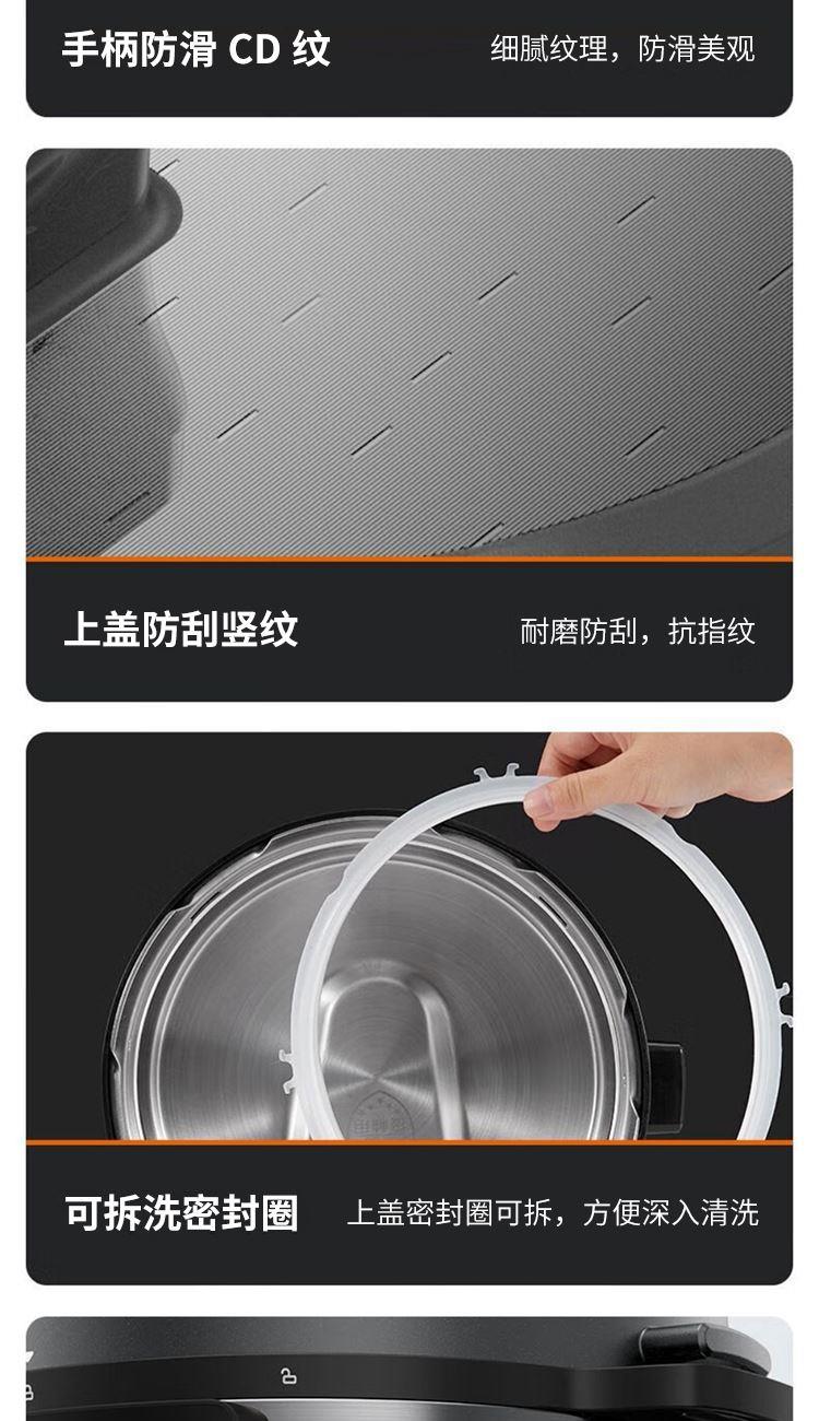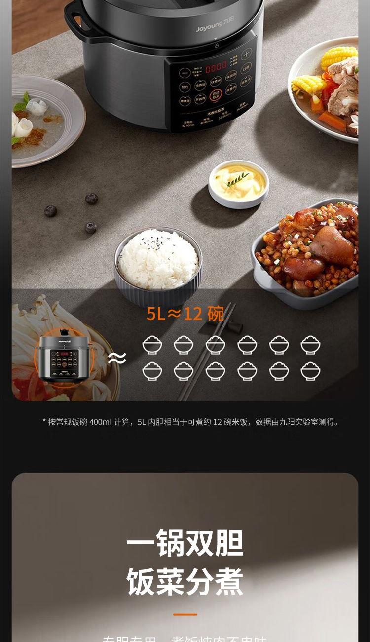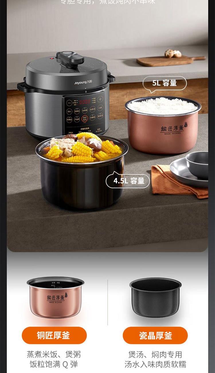 "1、铜匠厚釜内胆,导热强不粘锅; 2、一煲双胆(5L铜匠厚釜内胆+4.5L瓷晶厚釜) 3、底盘加热系统,反向排压按键; 4、开盖收汁,可立式上盖; 5、24小时预约,3档口感可调; 6、容量5L,功率1000W。 "