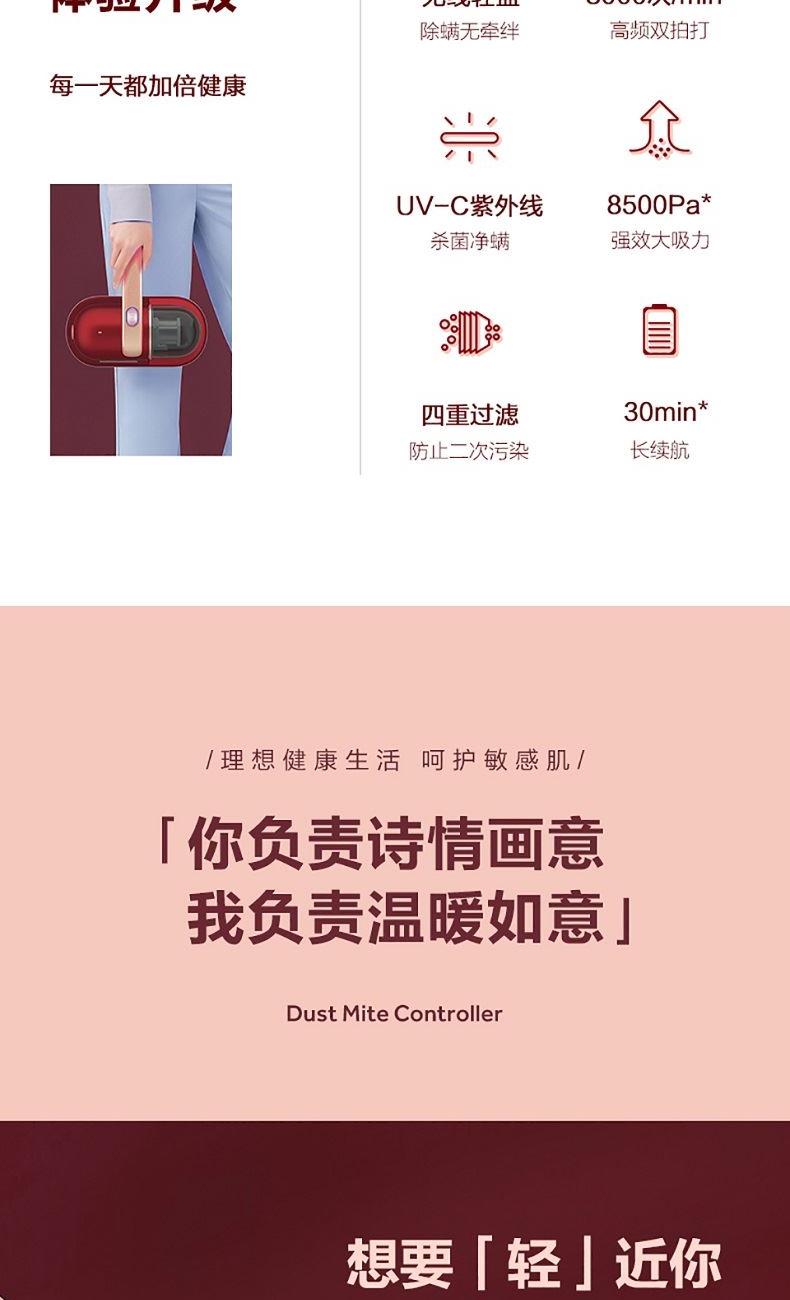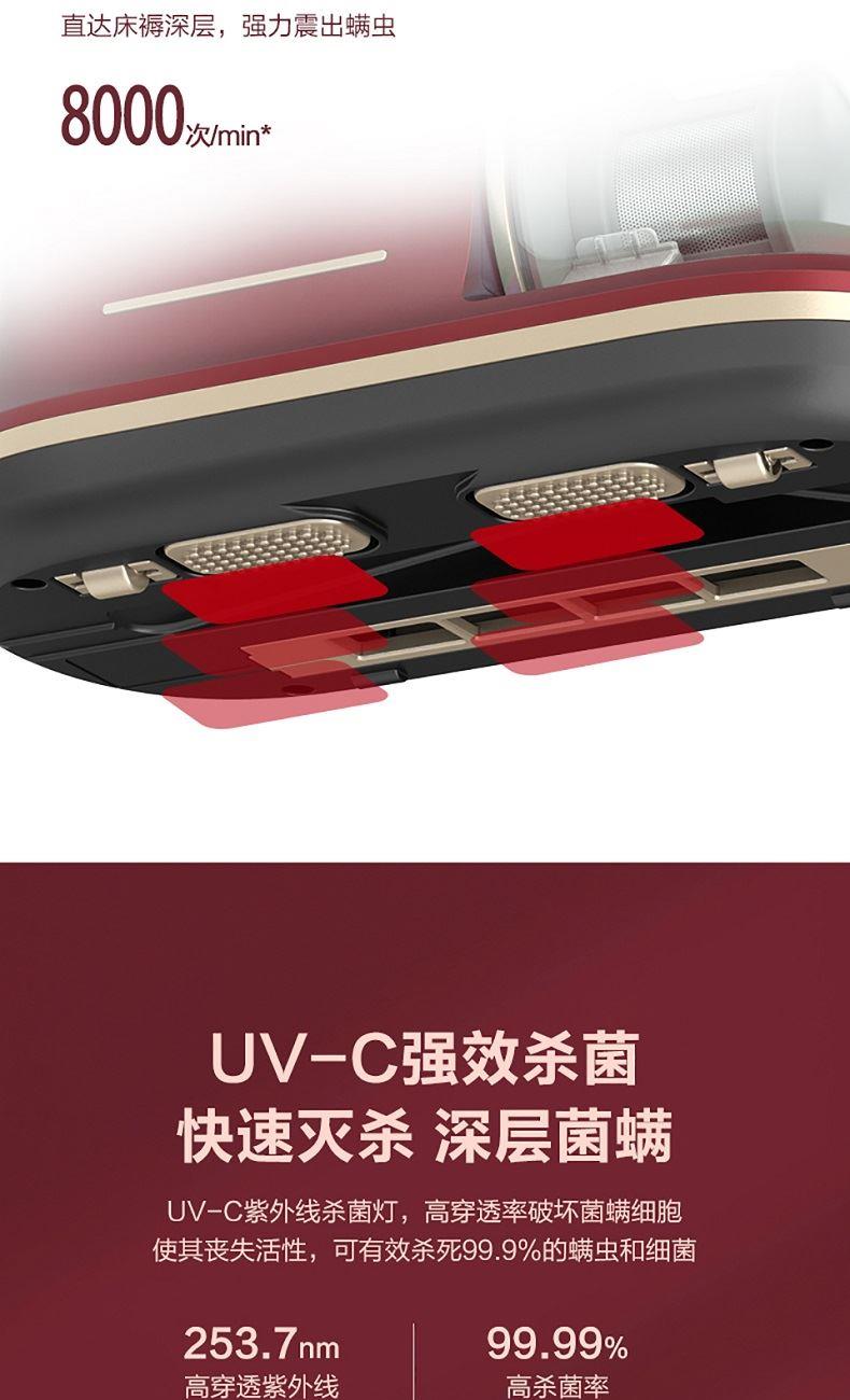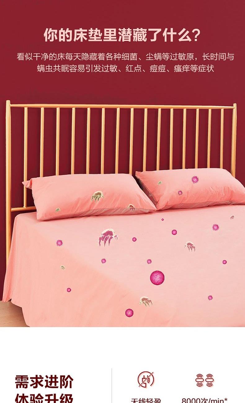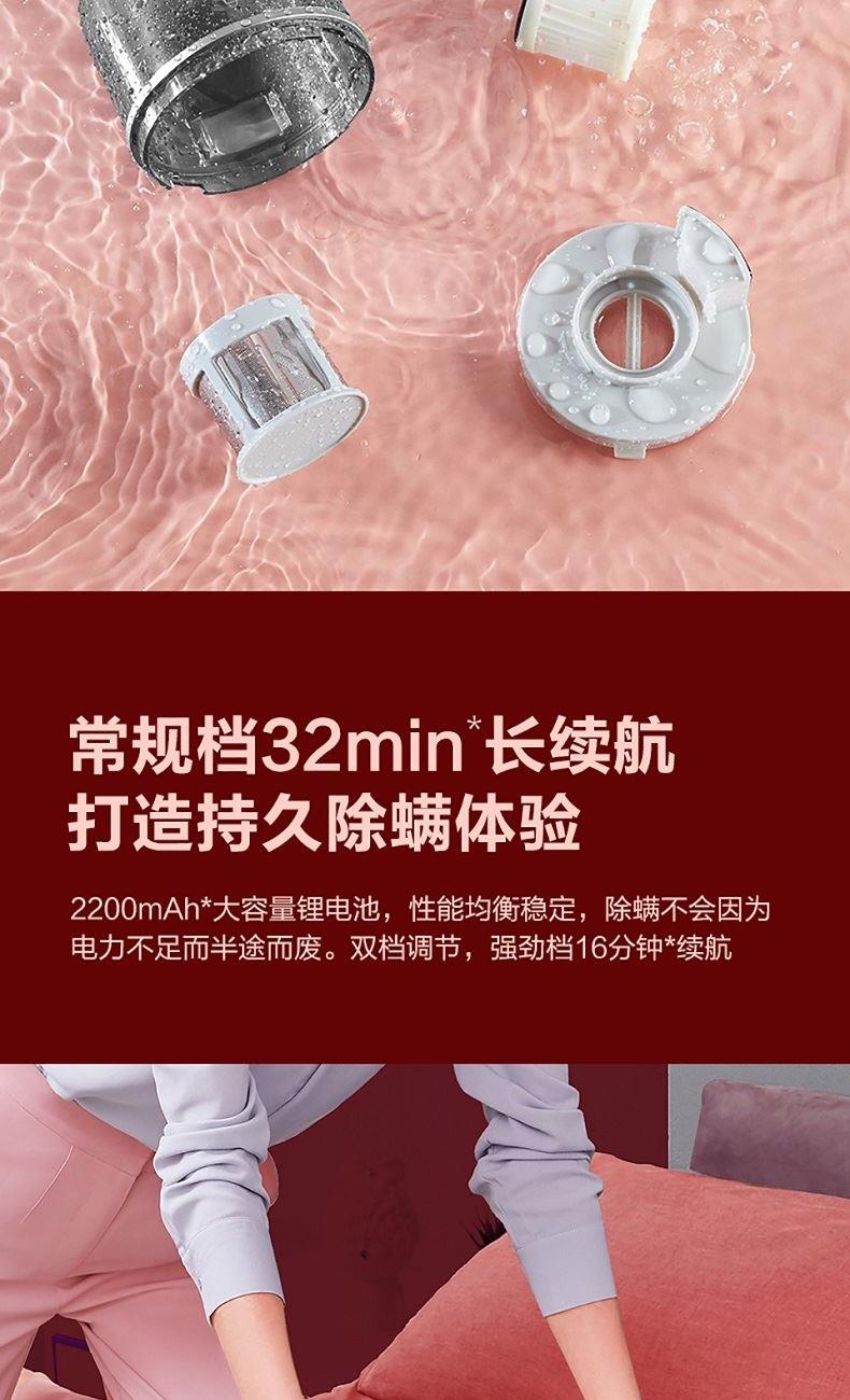 功率(W):140 额定电压(V):14.4 噪音(dB)A:66.3 真空度(Kpa):8.5 电池容量(mAh):2200 续航时间(min):高16低32 尘杯容积(L):0.25L 过滤:重 产品重量(kg):1.2 产品尺寸(mm):250*230*130 拍打次数(次/min):8000 1. 无线除螨-减少电源线带来的二次污染,没有线的羁绊,让你爱上除螨 2. UV-C紫外线管-253.7nm波长紫外灯可杀死大量细菌螨虫等微生物