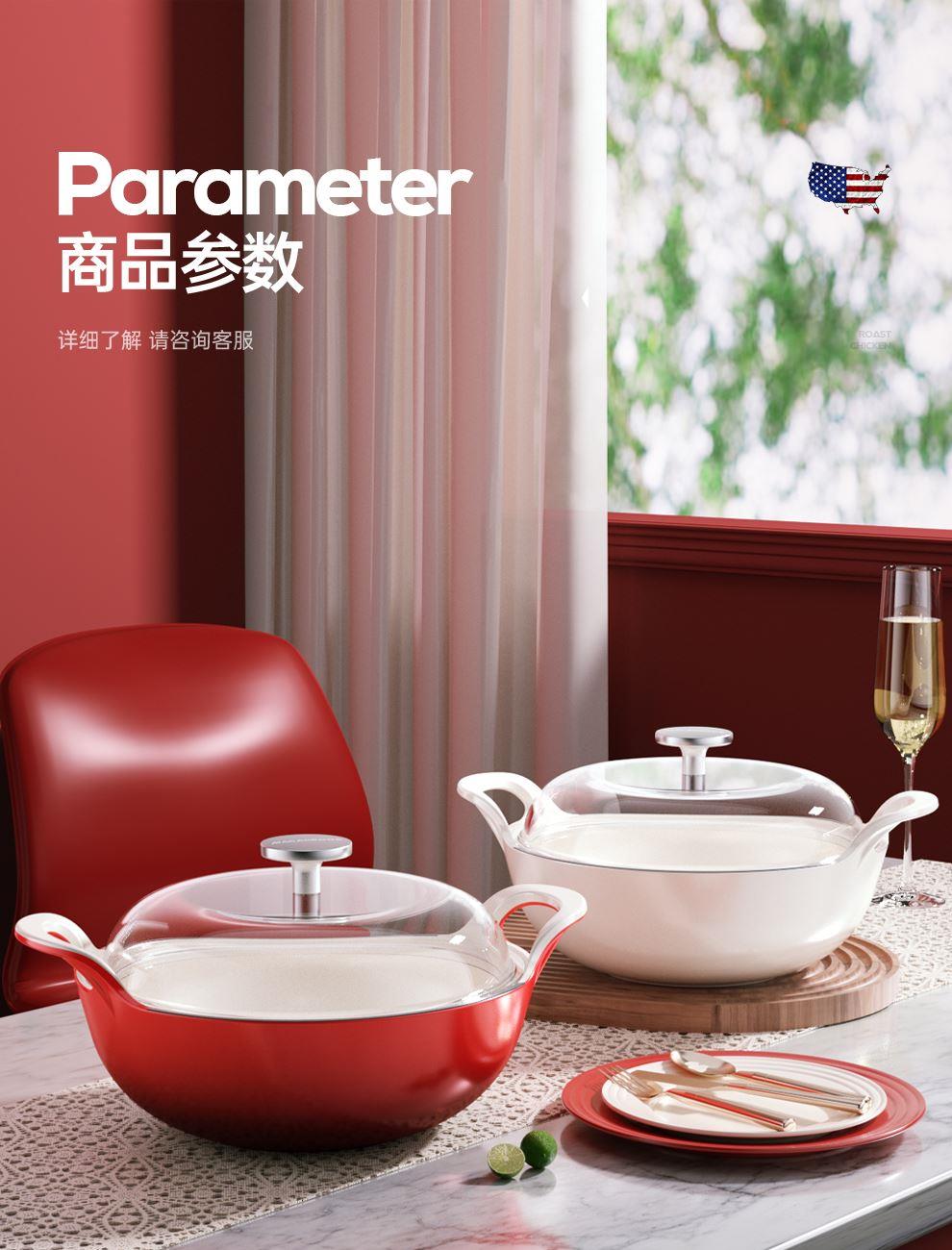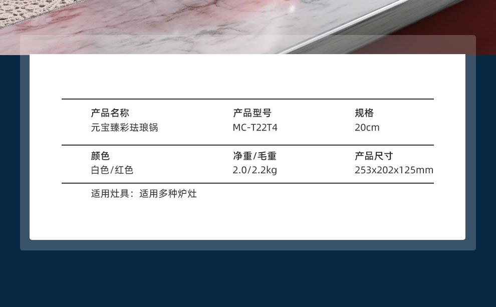 口 径:20cm 材 质:铸铁 产品净重:2.0kg 产品毛重:2.2kg 整箱重量:10.8kg 装 箱 数:4台/箱 产品尺寸:253x202x125mm 彩盒尺寸:260x170x265mm 外箱尺寸:575x285x390mm 高颜值外观元宝造型锅体,炫彩渐变红,吉祥又喜庆,高硼硅高拱玻璃盖; 0涂层不粘锅精铁打造0涂层珐琅工艺,健康不粘易清洁; 一锅多用焖、炖、煮花样烹饪,一锅多用; 不挑炉灶适用燃气、电磁灶、电陶炉等多种炉具。