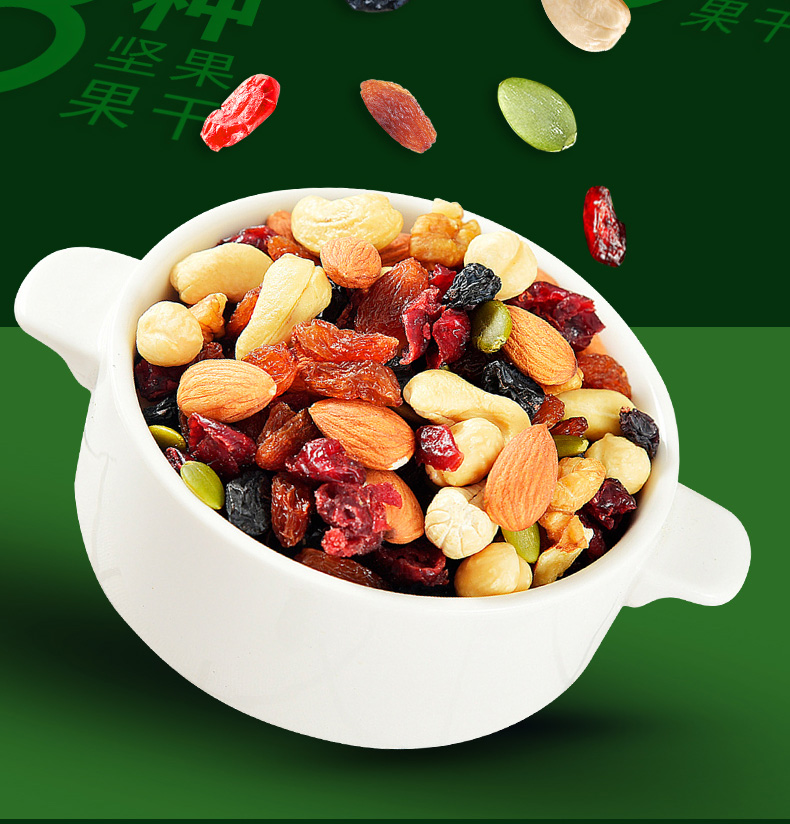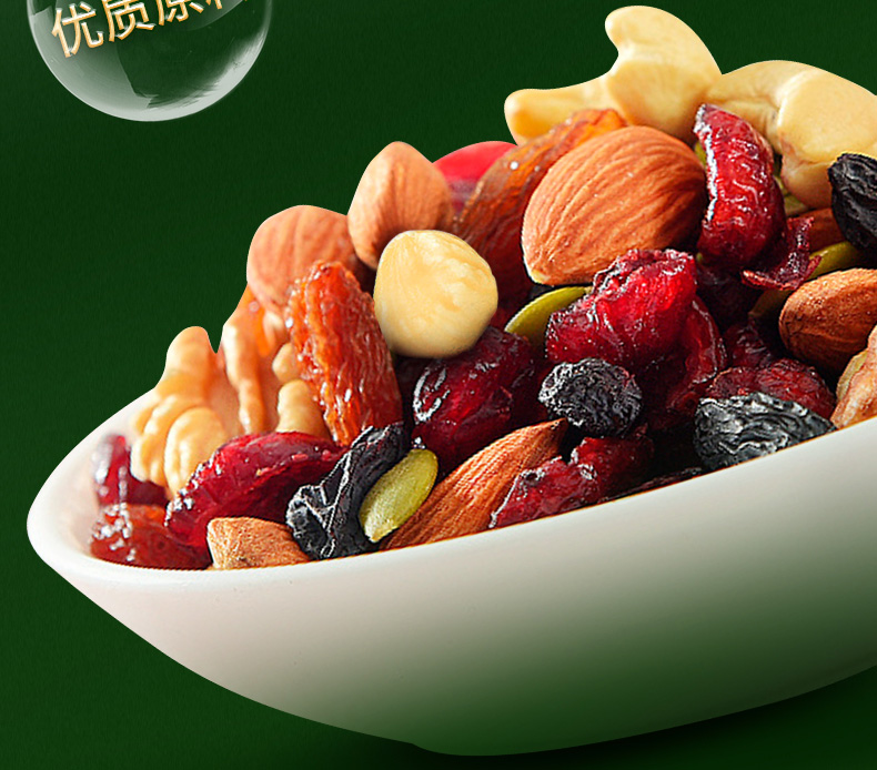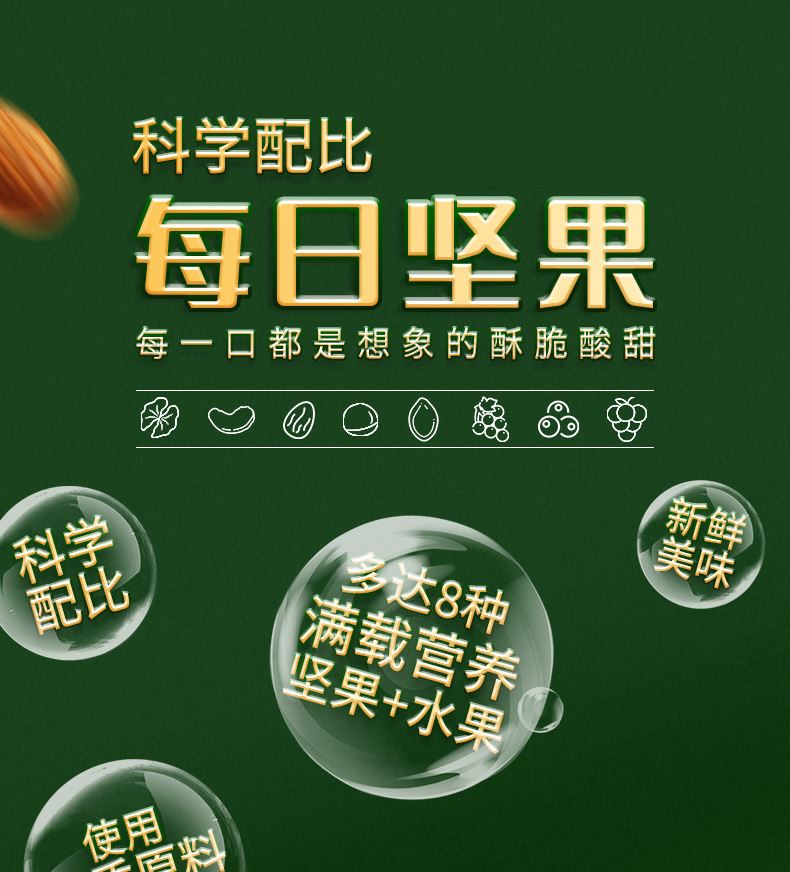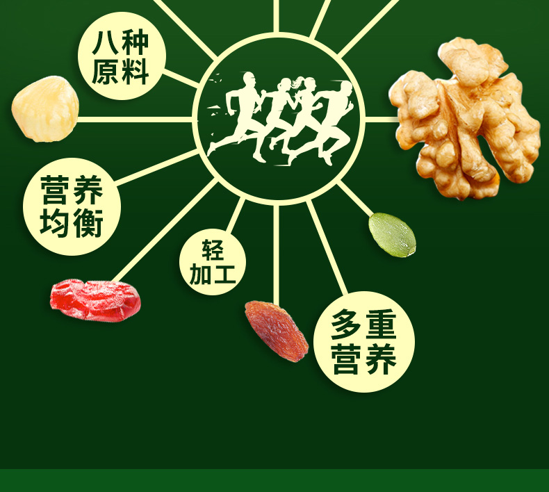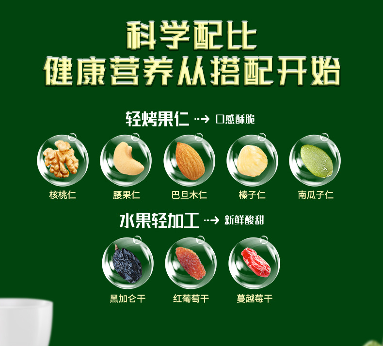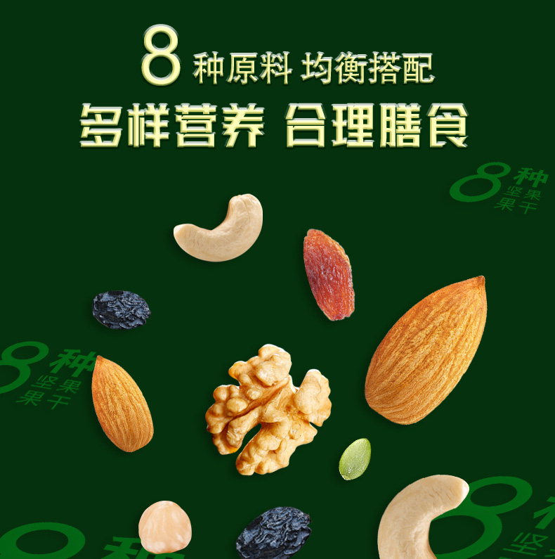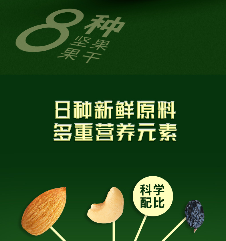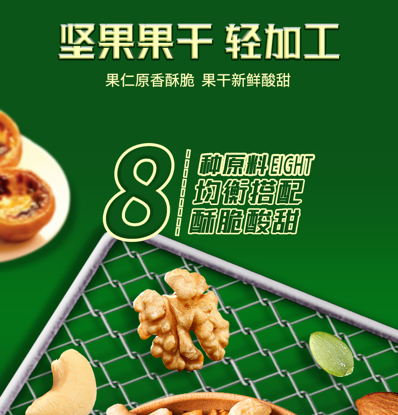 八种新鲜原料,多重营养元素; 果仁原香酥脆,果干新鲜酸甜。