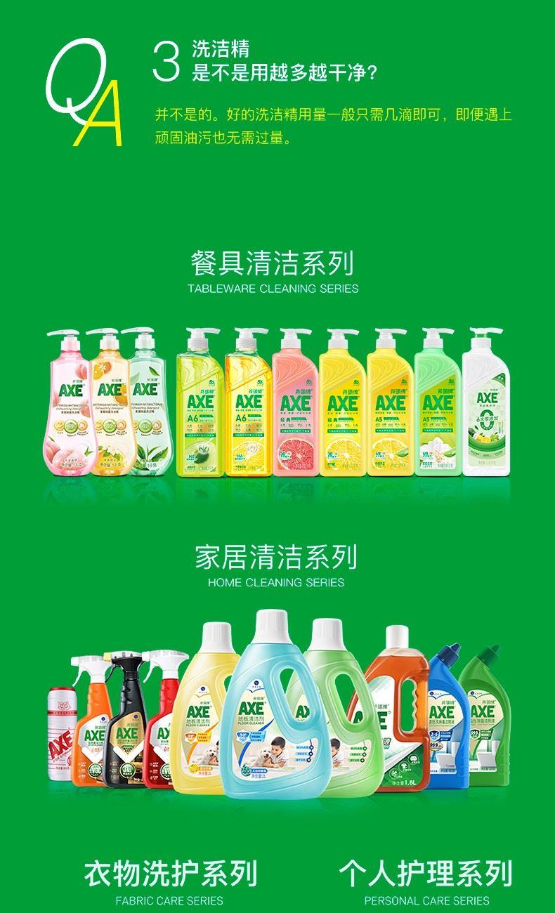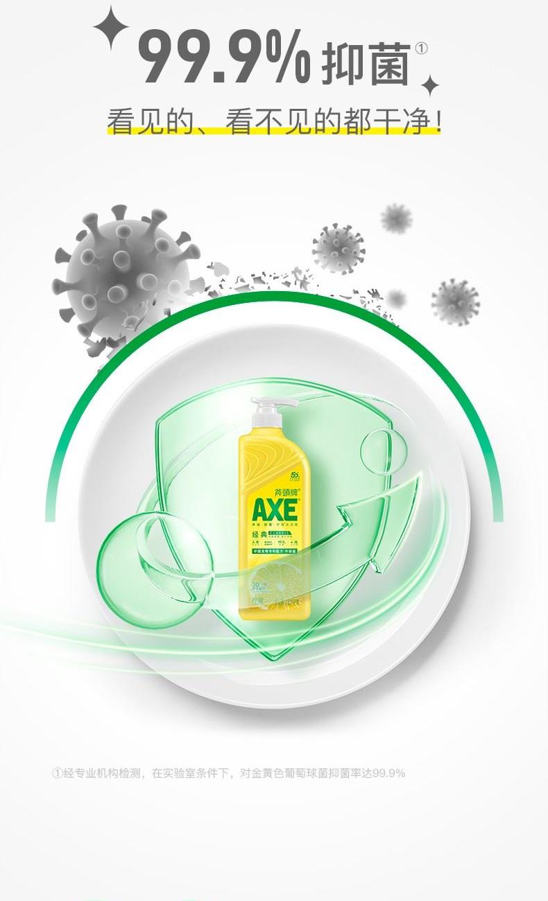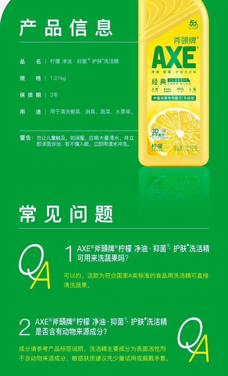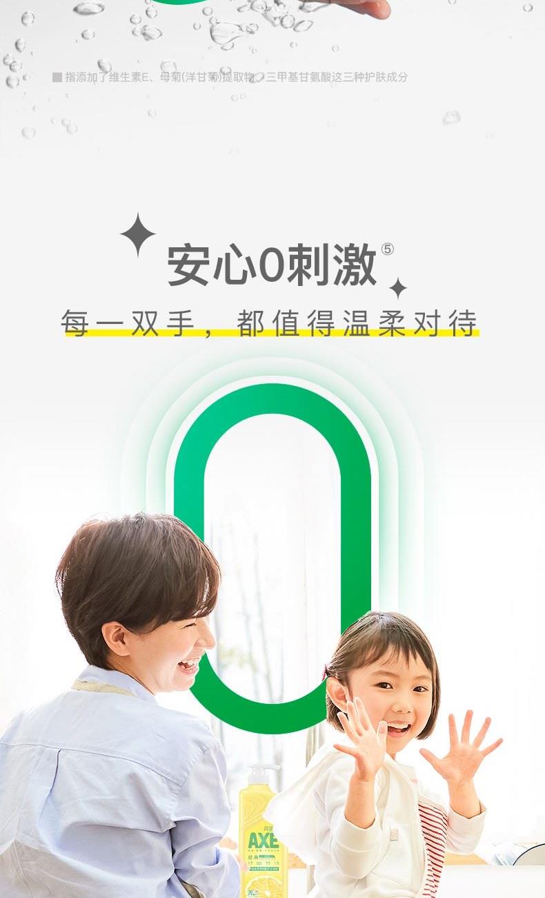 AXE柠檬护肤洗洁精500g泵 柠檬 净油· 护肤”洗洁精 保质期:3年 卖点: 用于清洗餐具、厨具、蔬菜、水果等。 警告: 勿让儿童触及。如误服,应喝大量清水,并立 即求医诊治;若不慎入眼,立即用清水冲洗。