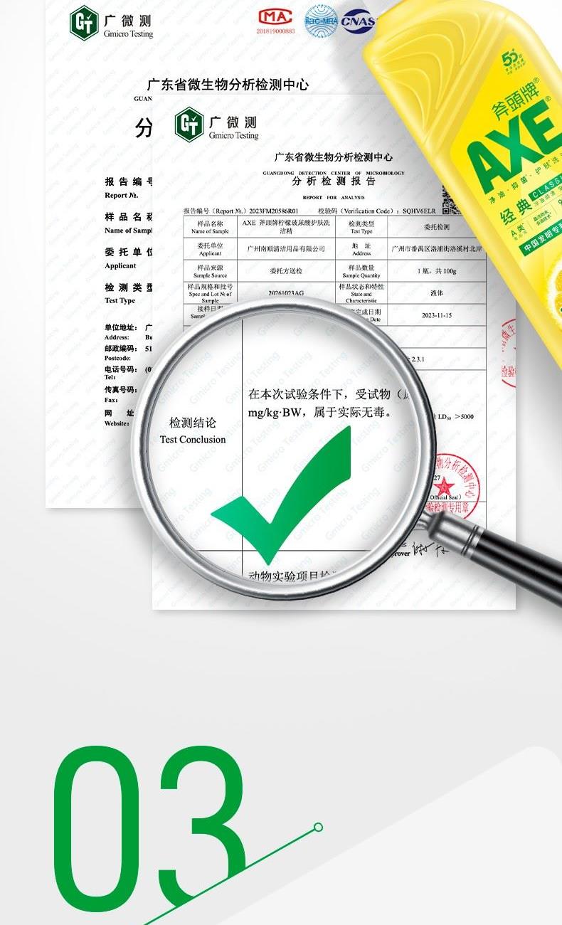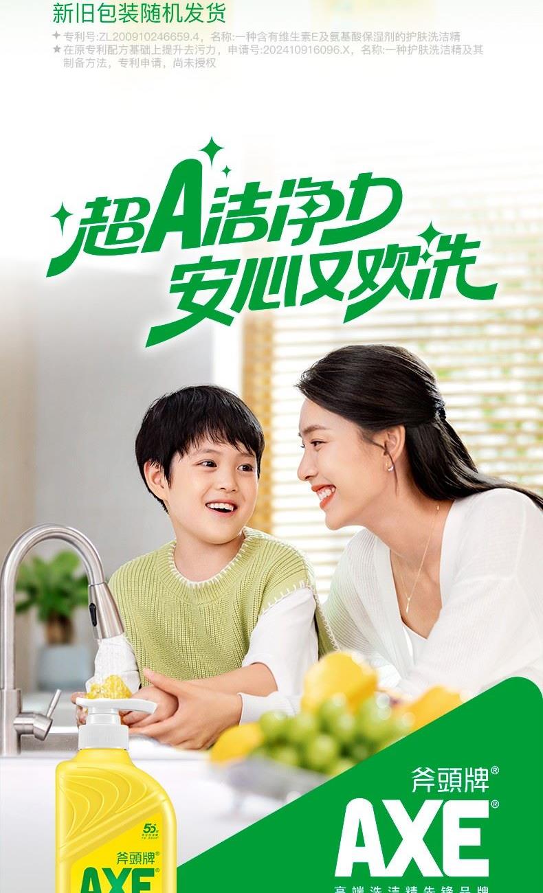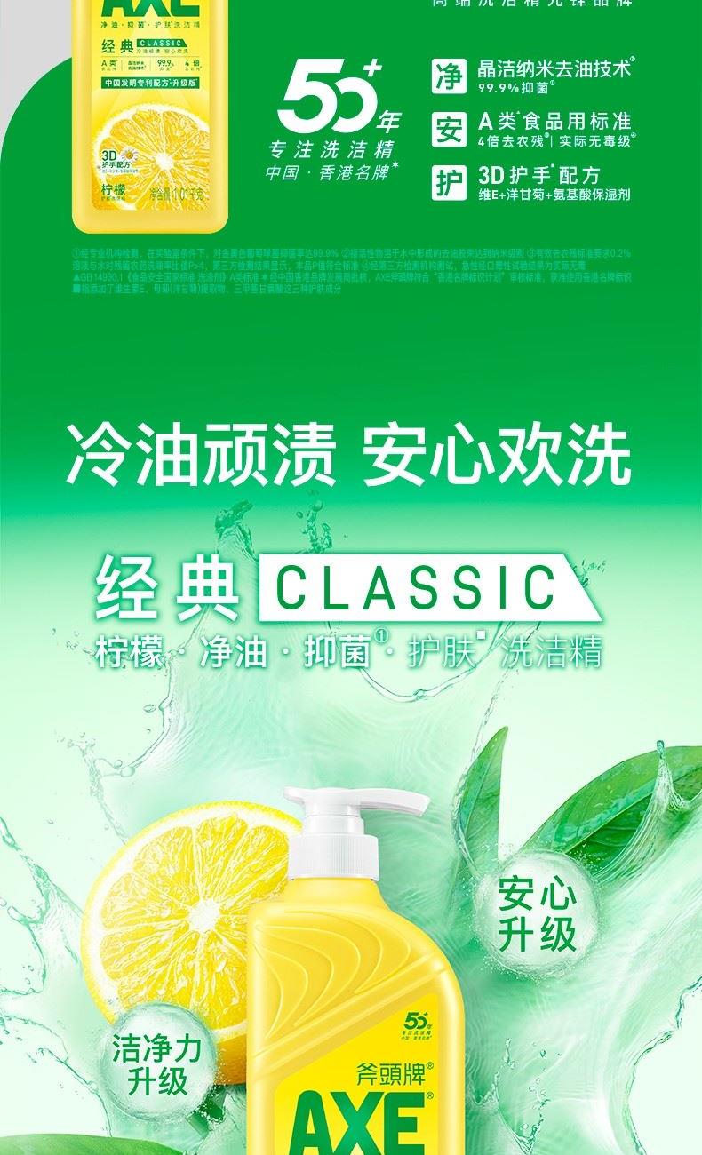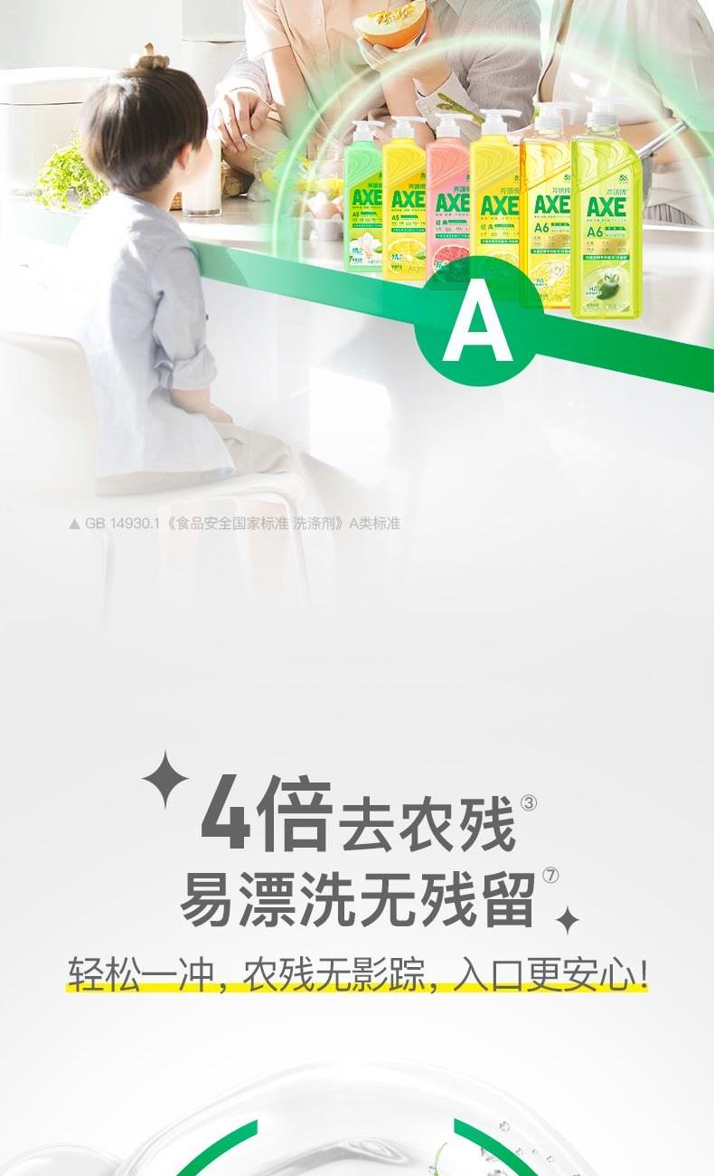 AXE柠檬护肤洗洁精500g泵 柠檬 净油· 护肤”洗洁精 保质期:3年 卖点: 用于清洗餐具、厨具、蔬菜、水果等。 警告: 勿让儿童触及。如误服,应喝大量清水,并立 即求医诊治;若不慎入眼,立即用清水冲洗。