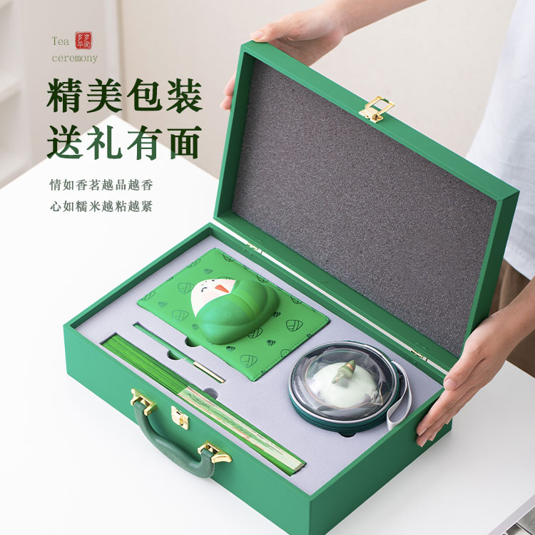 手抓壶1:宽9.5cm 高8cm 容量150ml 大杯1:宽8cm 高5cm 容量100ml 小杯2:宽5.6cm 高3cm 容量40ml 旅行包1:宽12cm,高11cm, 扇子1:长29.5cm 笔长14cm 笔记本1:长18.5cm 宽13.5cm 高5.6cm 笔1:长14cm 礼盒1:长38cm 宽12c m 高8cm 优质原矿瓷土,瓷土本色,仅透明釉高温烧制,精致耐看。 手抓壶选用粽子盖钮茶具,立体逼真,颜色明亮。 融合古代端午“送扇赠祝福”元素,表达祝福心意。 粽子解压笔记本,趣味满满。优质办公用品,好用舒心。 精致粽子元素礼盒,呼应节日氛围。