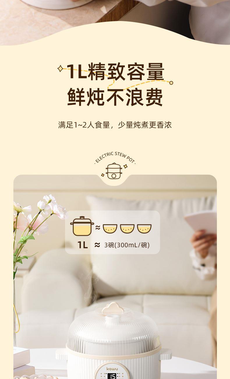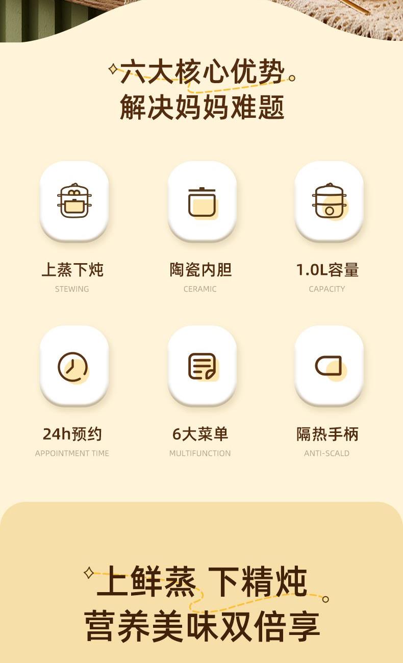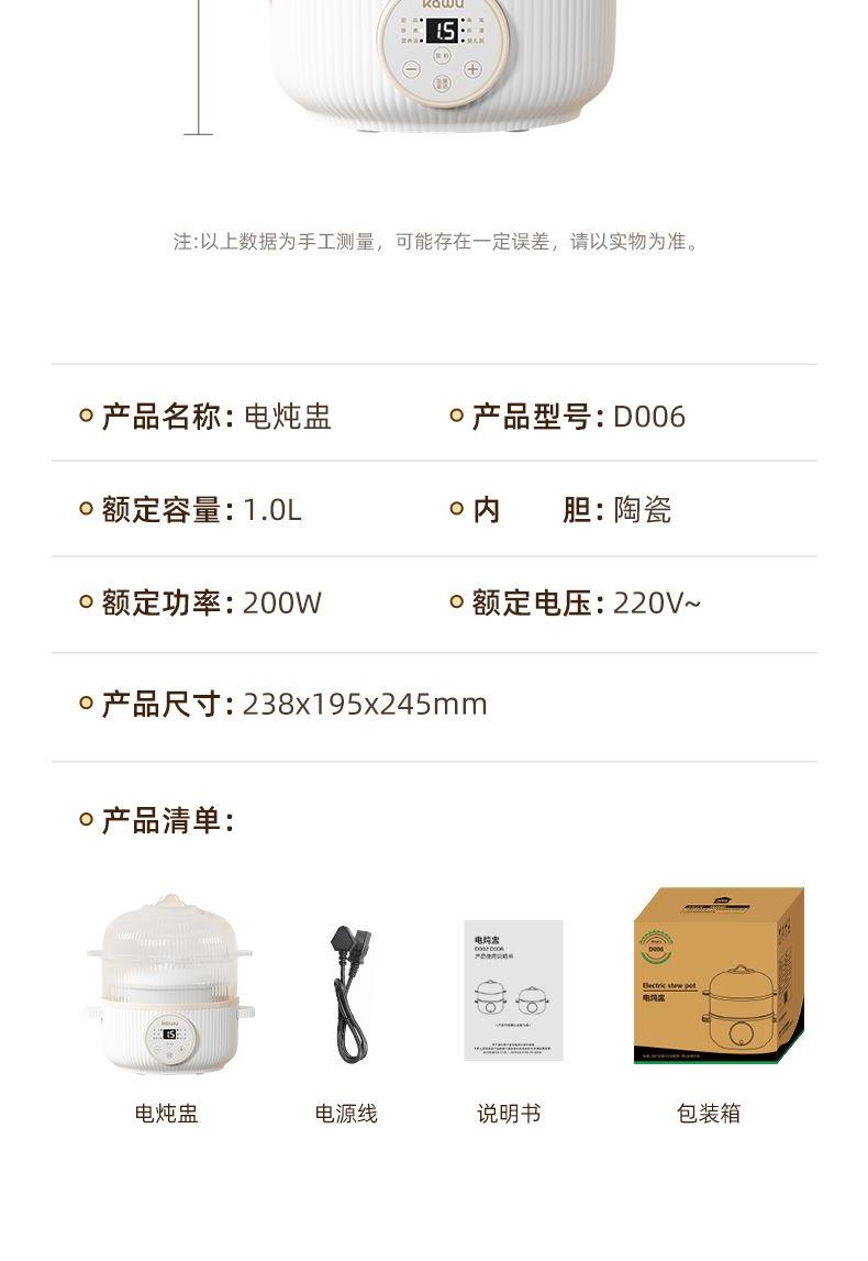产品型号:D006 额定电压:220V 额定功率:200W 额定容量:1L 单台净重:1.5KG 单台毛重:2.4KG 包 装:邮购箱 商品条码:6977256044864 产品尺寸:238*195*245mm 包装尺寸:220*220*220mm 清单:电源线,说明书,主机,陶瓷内胆,蒸笼,上盖 1、 6大模式,能蒸擅炖 2、24H智能预约 3、隔水慢炖,轻养一日三餐,隔水锁鲜好营养 4、PTC节能发热片。恒温加热,节能省电