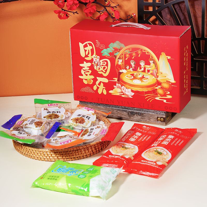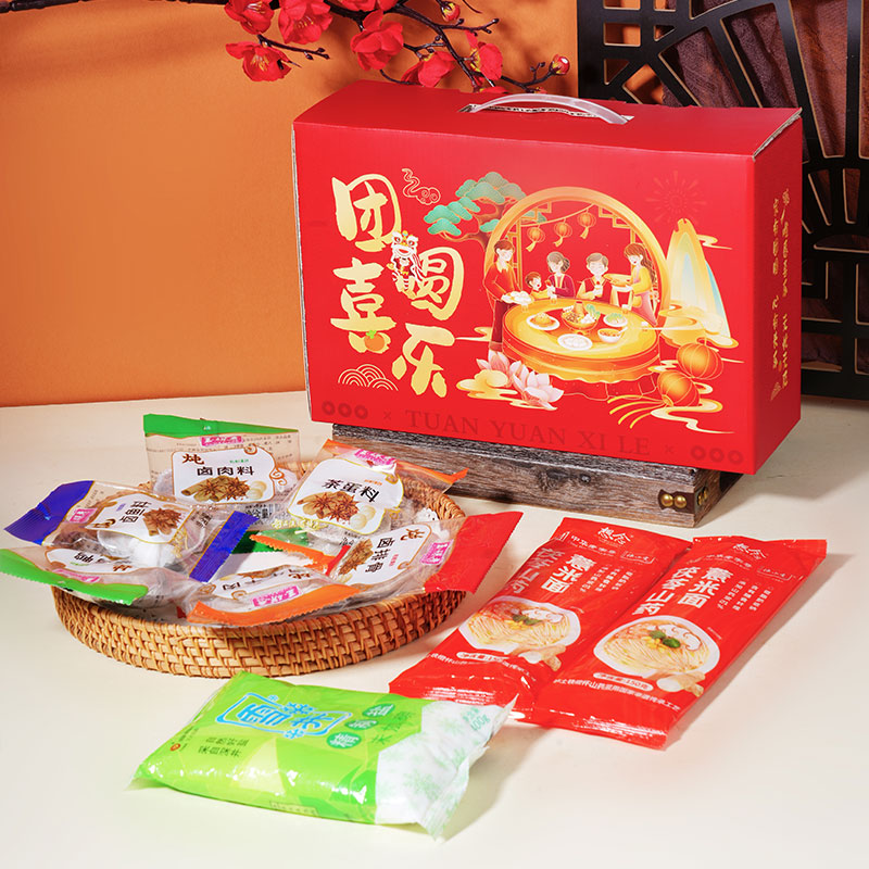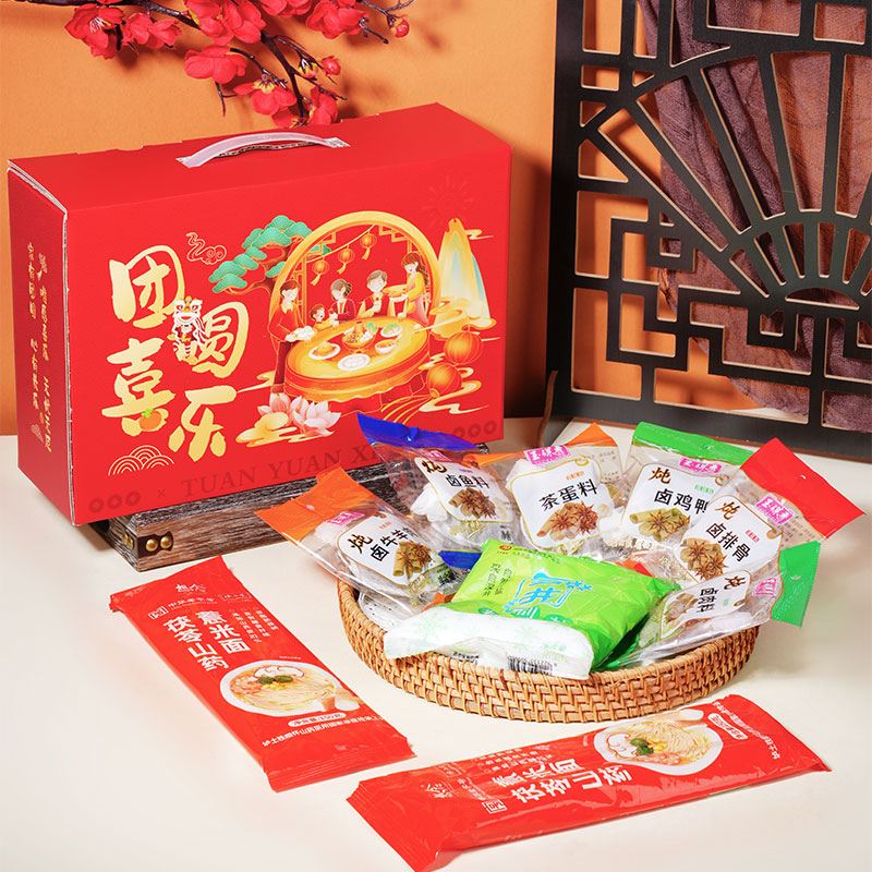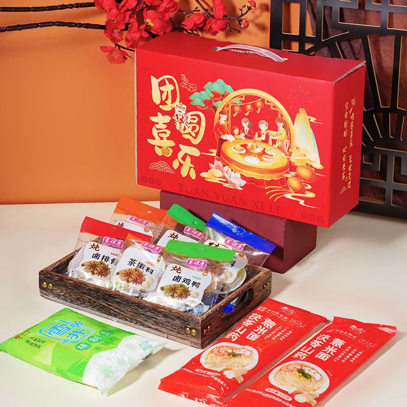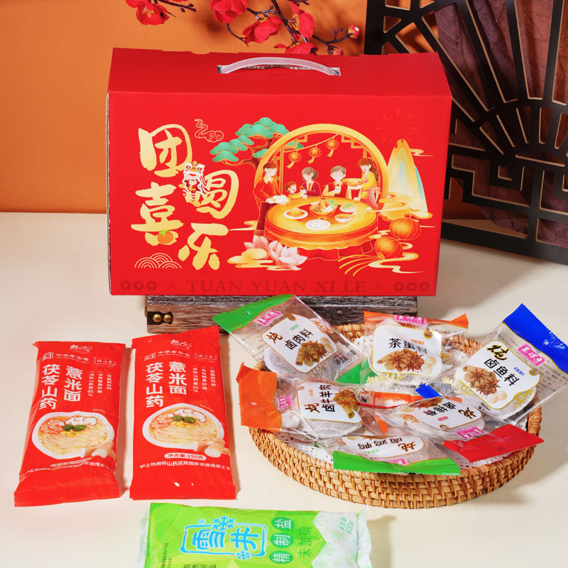 产品主题:家有团圆 心有常乐 礼盒规格:300*200*100mm 产品内置: 茯苓山药薏米面150g*2 自贡雪井精制盐400g*1包, 卤鸡鸭调料15g*1包, 炖排骨调料15g*1包, 炖鱼调料15g*1包, 炖肉料15g*1包, 茶蛋调料15g*1包, 炖牛羊肉调料15g*1包,