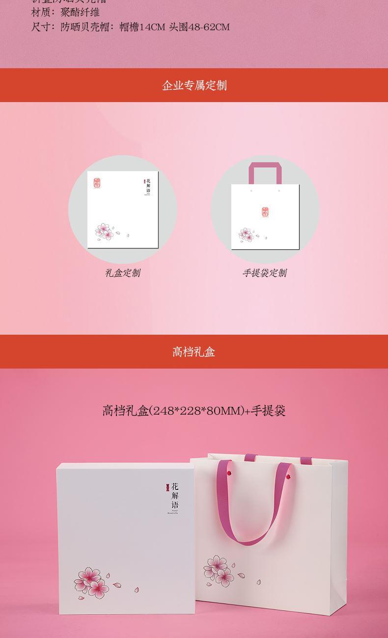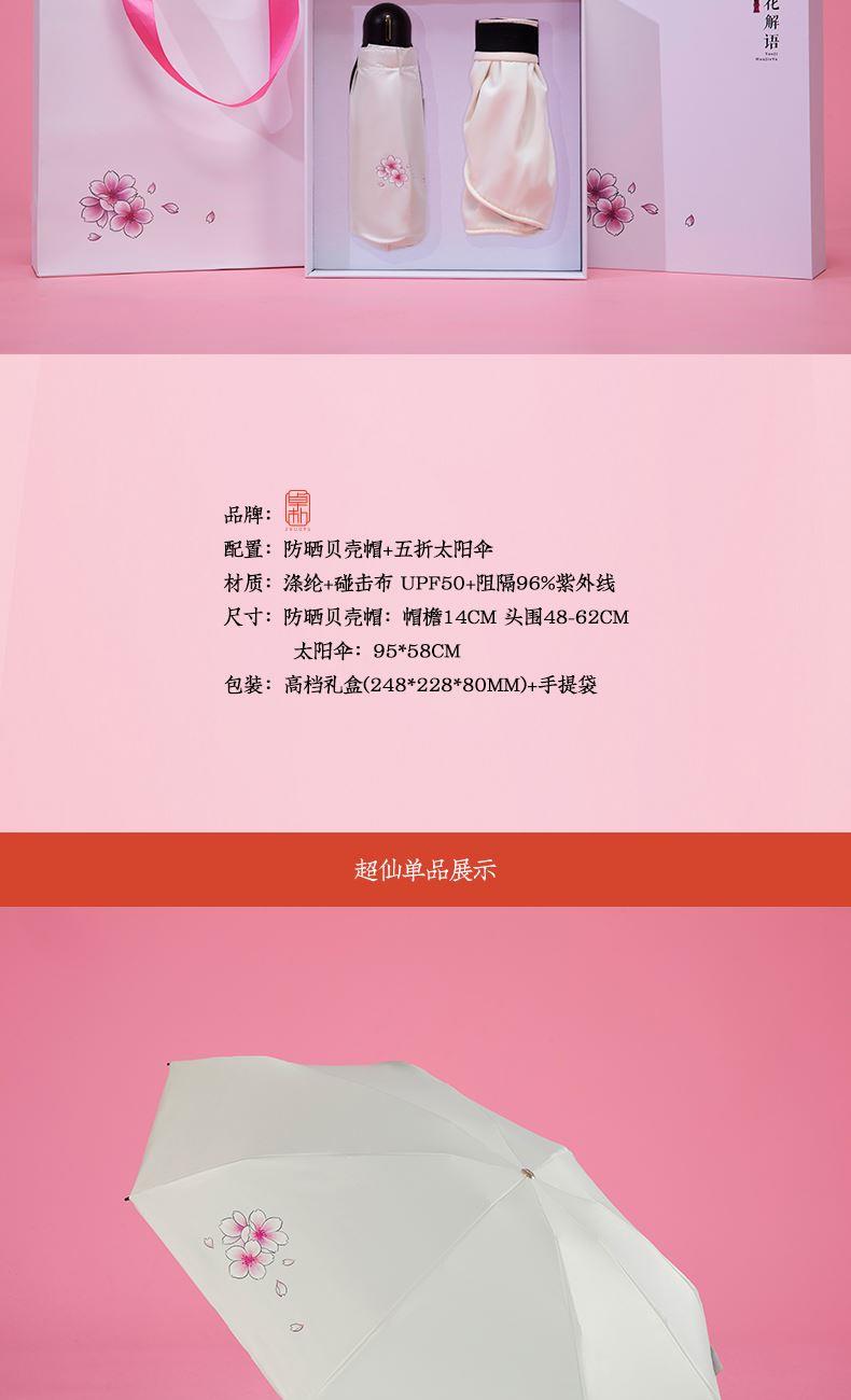 配置:防晒贝壳帽+五折太阳伞 材质:涤纶+碰击布 UPF50+阻隔96%紫外线 尺寸:防晒贝壳帽:帽檐14cm 头围48-62cm 太阳伞:95*58cm 包装:礼盒(248*228*80mm)+手提袋