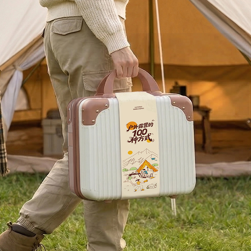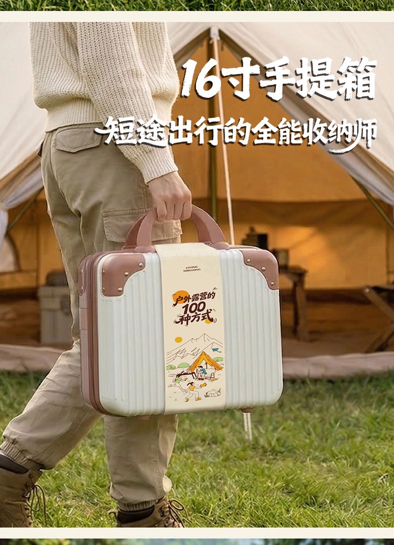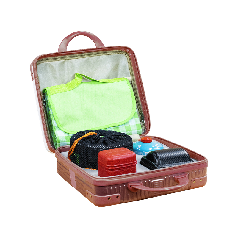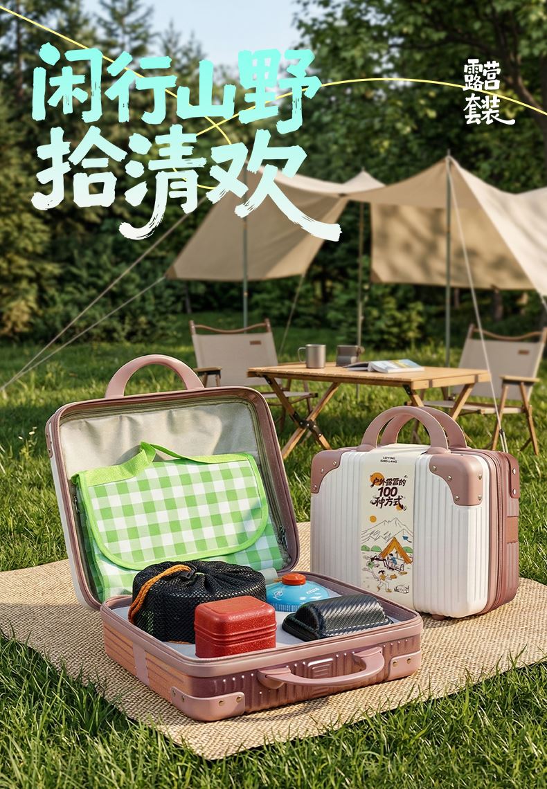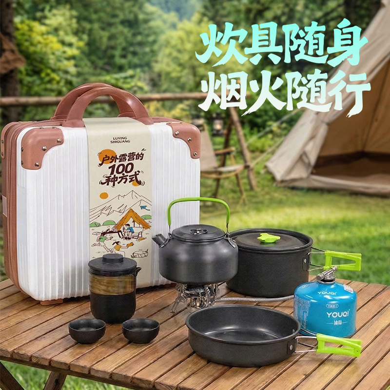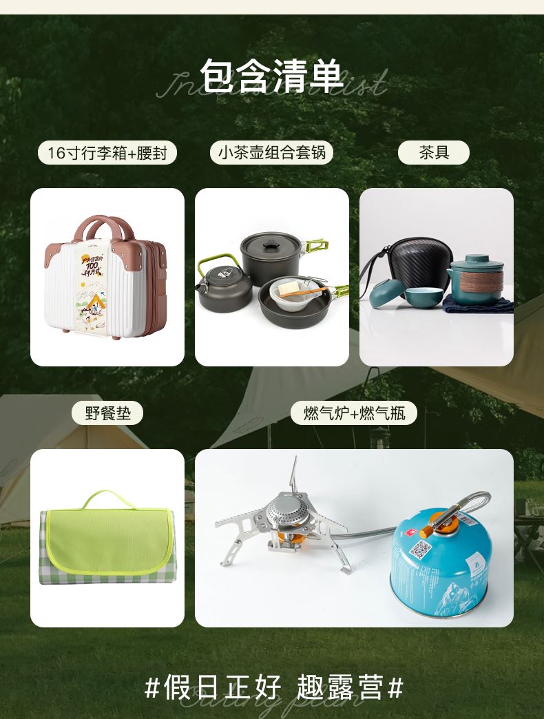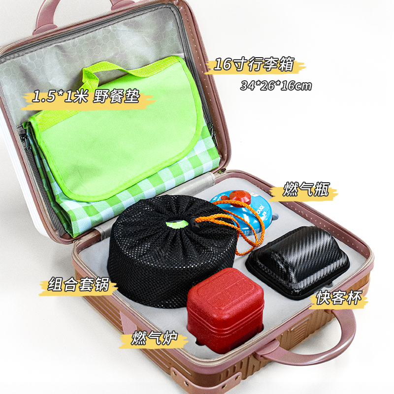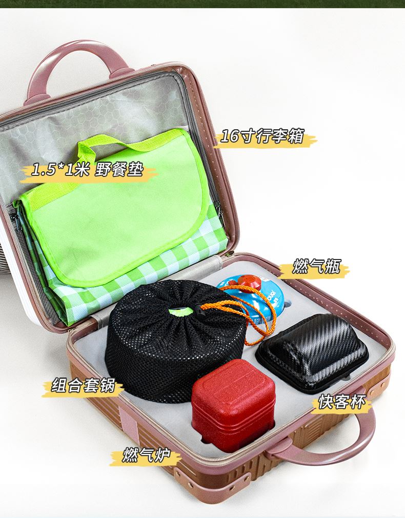行李箱:16寸 茶具组合:茶壶320ml+茶杯50ml×4+内胆+茶巾 野餐垫:1.5×1米 便携式液化煤气罐:230g 燃气炉×1 组合套锅:1.1L茶壶+700ml煎锅+1.6L中锅+饭铲+碗×3只+折叠勺+丝瓜瓤