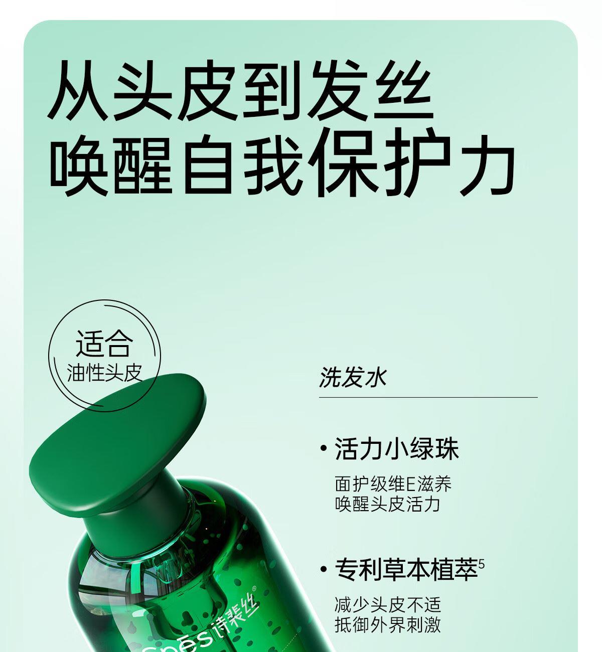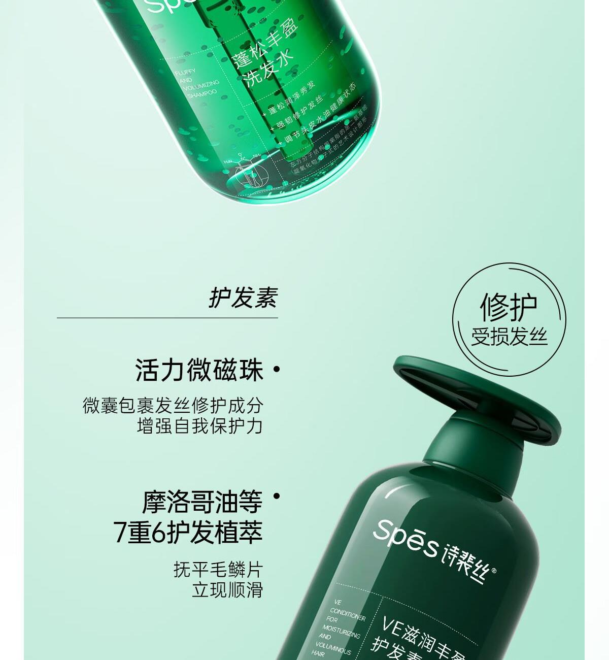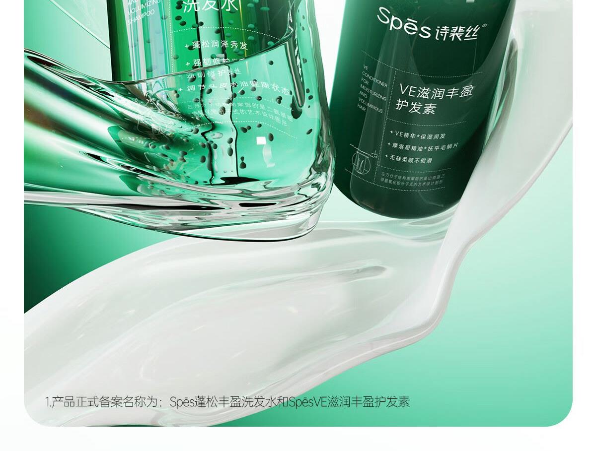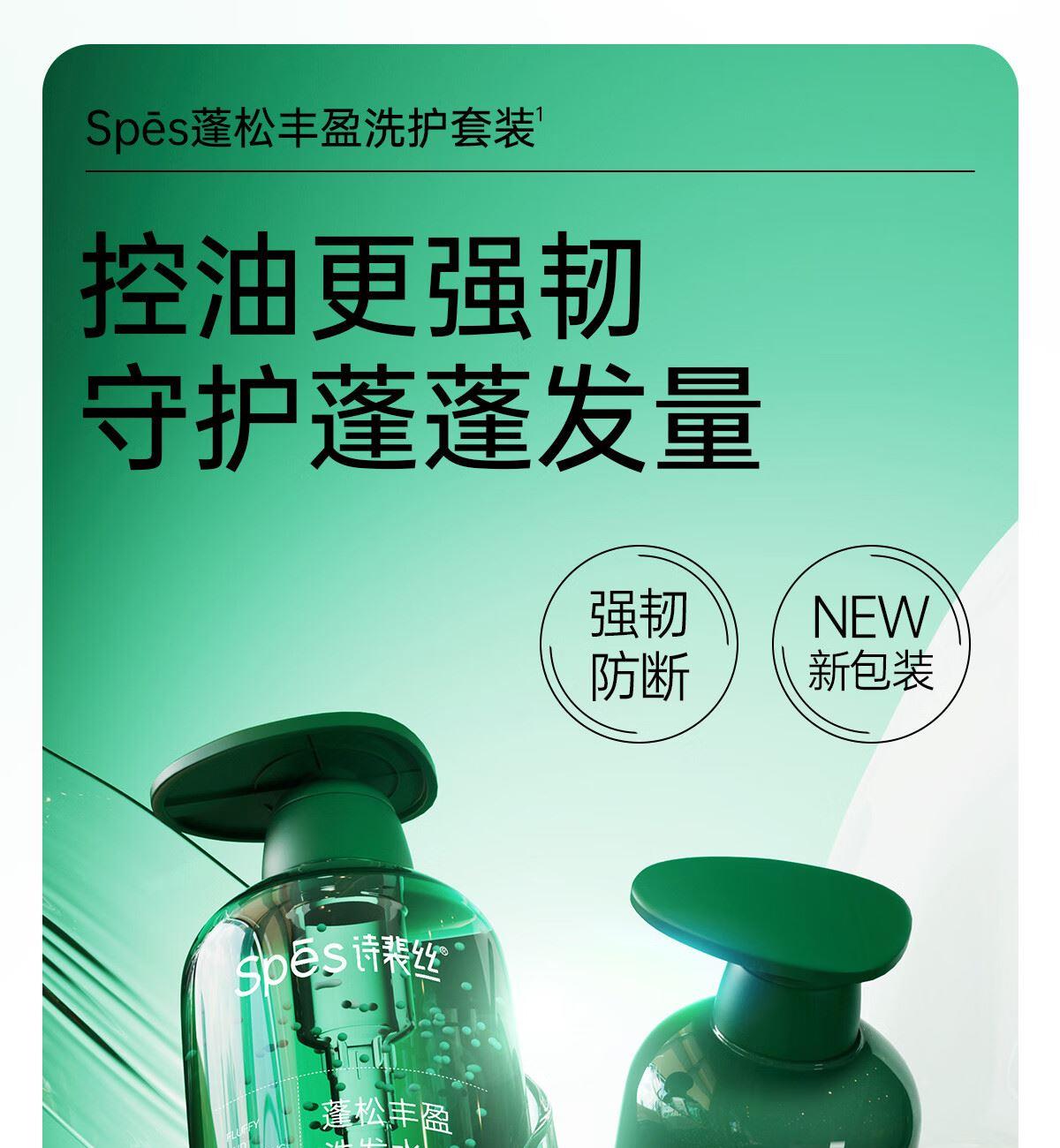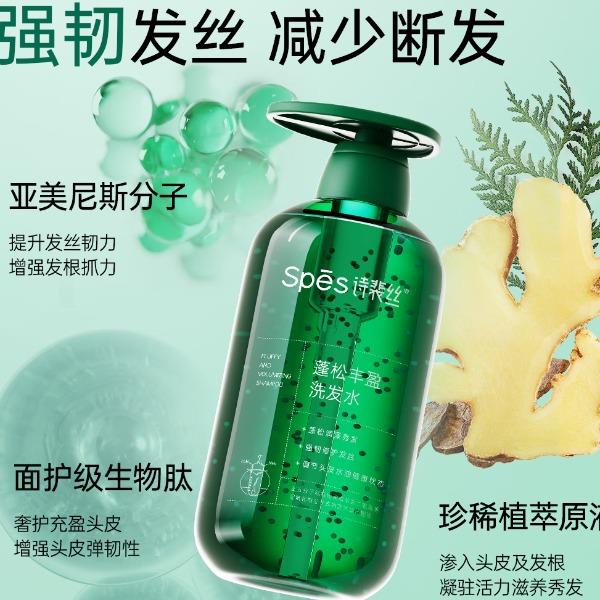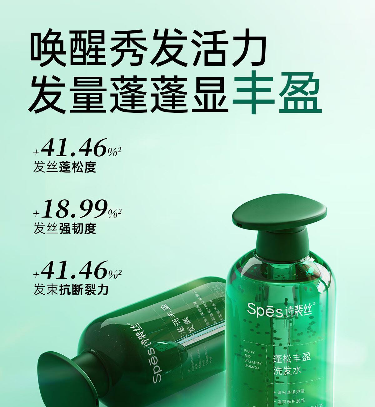Spēs蓬松丰盈洗发水500ml 适合人群:油性头皮 脆弱易断发质 产品材料: 1、活力小绿珠,面护级维E滋养,唤醒头皮活力 2、草本植萃,减少头皮不适,抵御外界刺激 产品卖点: 有效头皮控油,强韧发丝防断,视觉发量丰盈 适用人群 使用感受: 控油蓬松,断发减少,发量丰盈
