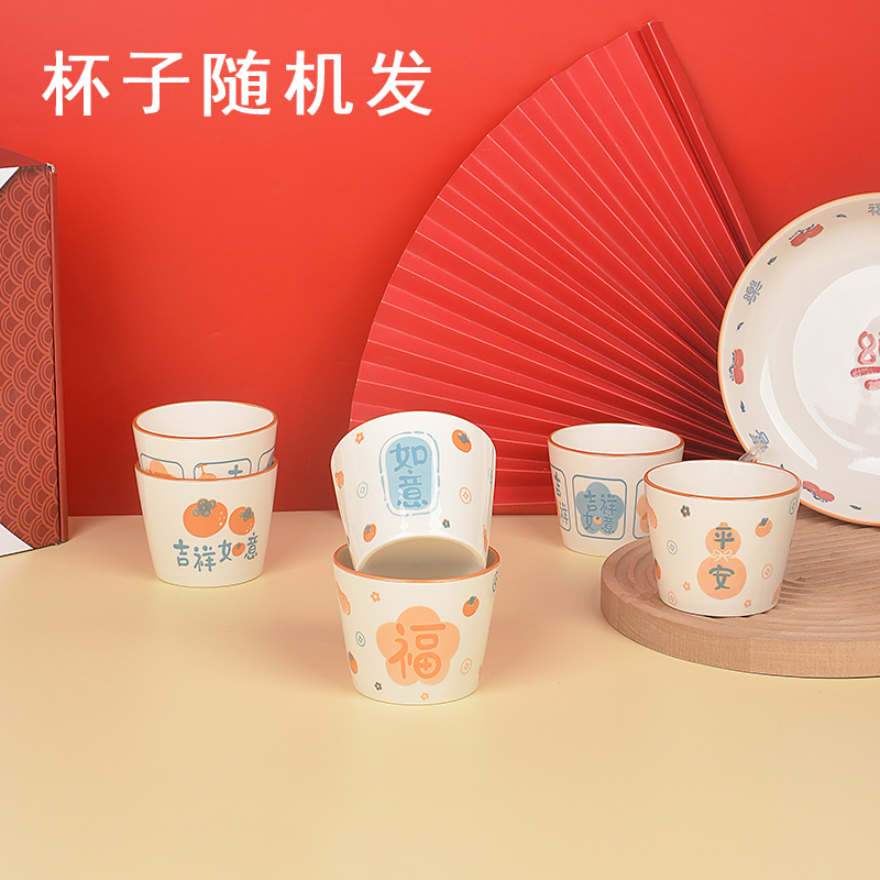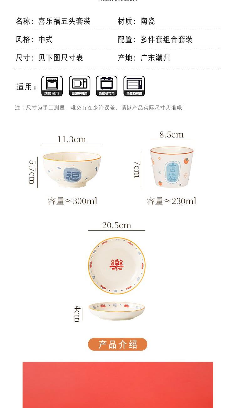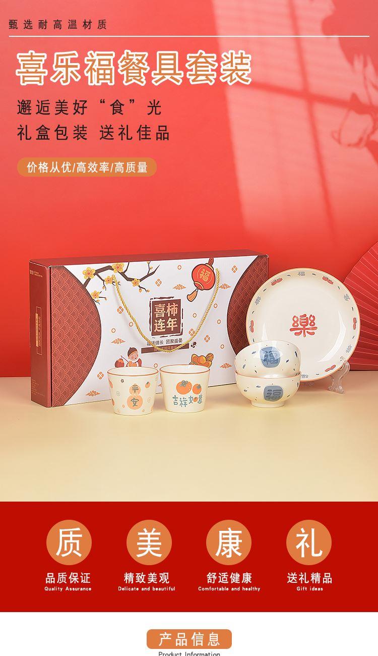 产品组成:整套=2碗+2杯+1盘+彩盒 产品材质:新骨瓷 产品规格:杯=口径8.5cm,高度7cm,容量230ml; 陶瓷碗=口径11.2cm,高度5.5cm;盘=口径20.5cm 彩盒尺寸:46.3*24*7.3cm 外箱毛重:26kg 外箱尺寸:63.5*47*50cm - ”生活美学搭子”。让每一天,每一刻都自带vibe, 把这套“喜乐福”餐具当礼物再合适不过。细腻瓷质摸得到的踏实,灵动花纹藏着“愿大家常享乐、常伴福”的期许。花纹里的“福”气看得见,用它装着家常菜,连饭菜都多了份温馨。 送长辈是孝心,送手足是心意,让每一次围坐用餐,都是“意满、乐足、福常在”的幸福滋味~轻松拿捏生活里的小确幸,让日子“city感”十足!幸福感直接拉满! 三餐烟火暖,四季皆安然。选意乐福陶瓷,喜乐常伴,福气满满。