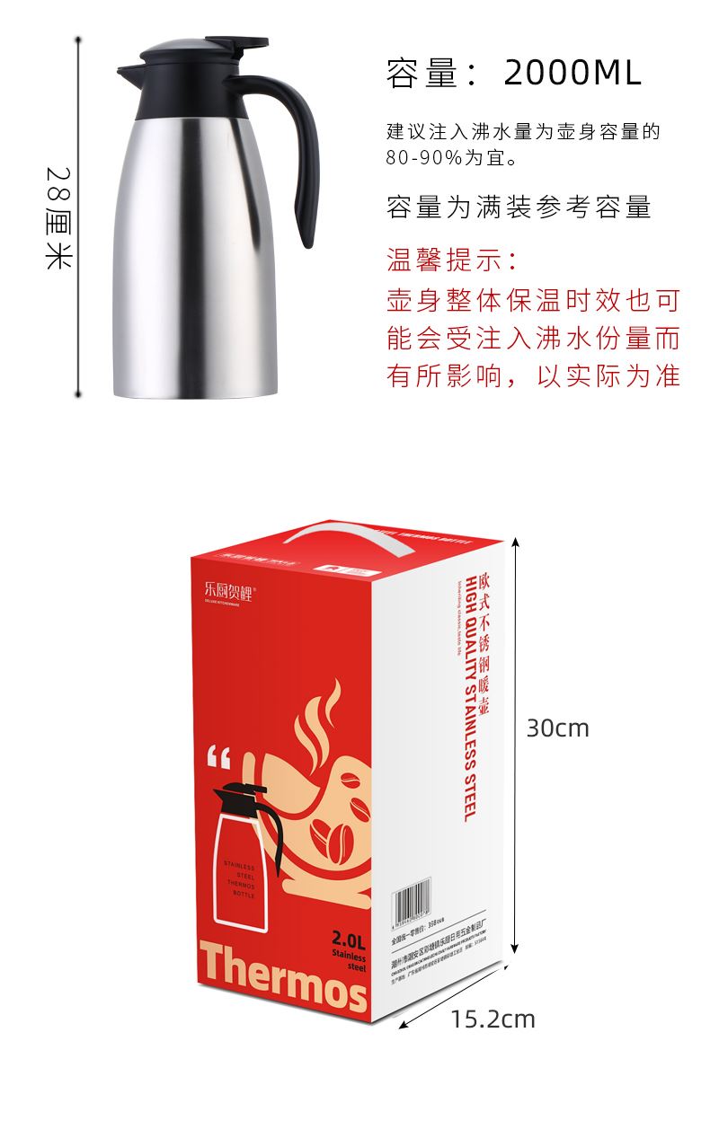 产品规格:2.0L 产品材质:304不锈钢 包装方式:opp透明袋+手提彩盒 彩盒尺寸:15*15*30CM 条 码:6959460800078 创造高业绩,送礼心坎里,好产品,助您开门红事半功倍。 福星高照,星耀前路,暖意与好运一路相随。 双层真空设计,保温保冷长达六小时起 独特开关设计,单手方便开启,壶盖设计紧凑,密封效果更好。 优质加厚pp塑料手柄,使用时拿捏舒服,隔热防烫 中国红礼盒包装,时尚大气,是您引流拓客,必备礼品。