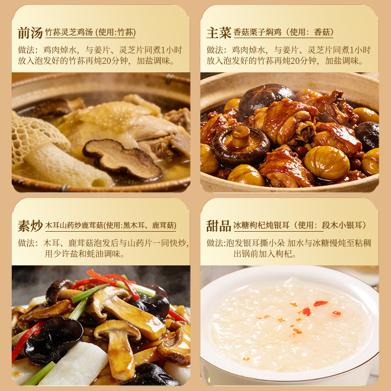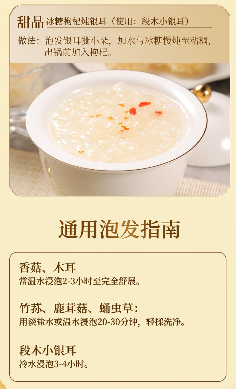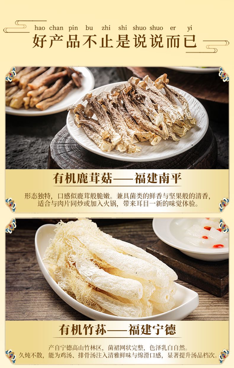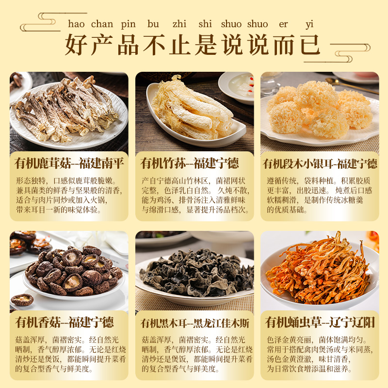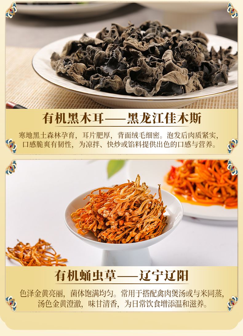 精选有机竹荪25g 福建古田 精选有机椴木小银耳125g 福建古田 精选有机香菇 165g 福建古田 精选有机黑木耳 160g 黑龙江佳木斯 精选有机鹿茸菇150g 福建南平 精选有机蛹虫草90g 辽宁辽阳