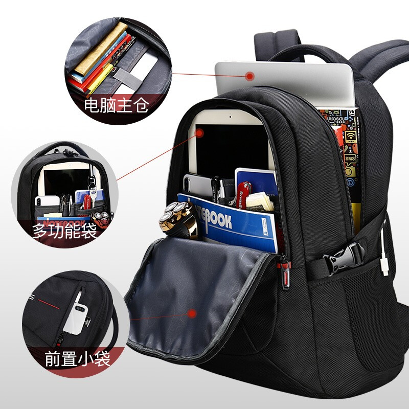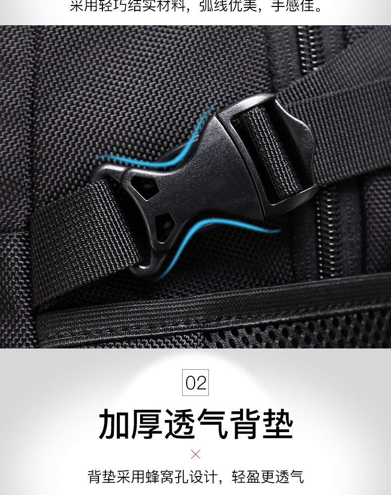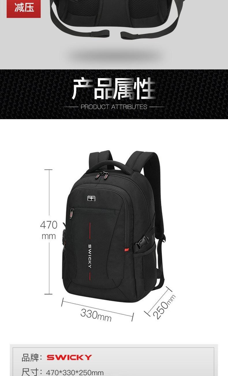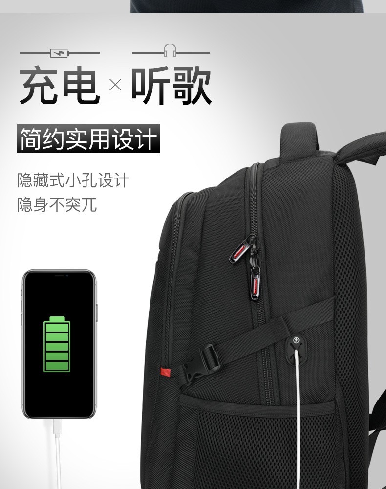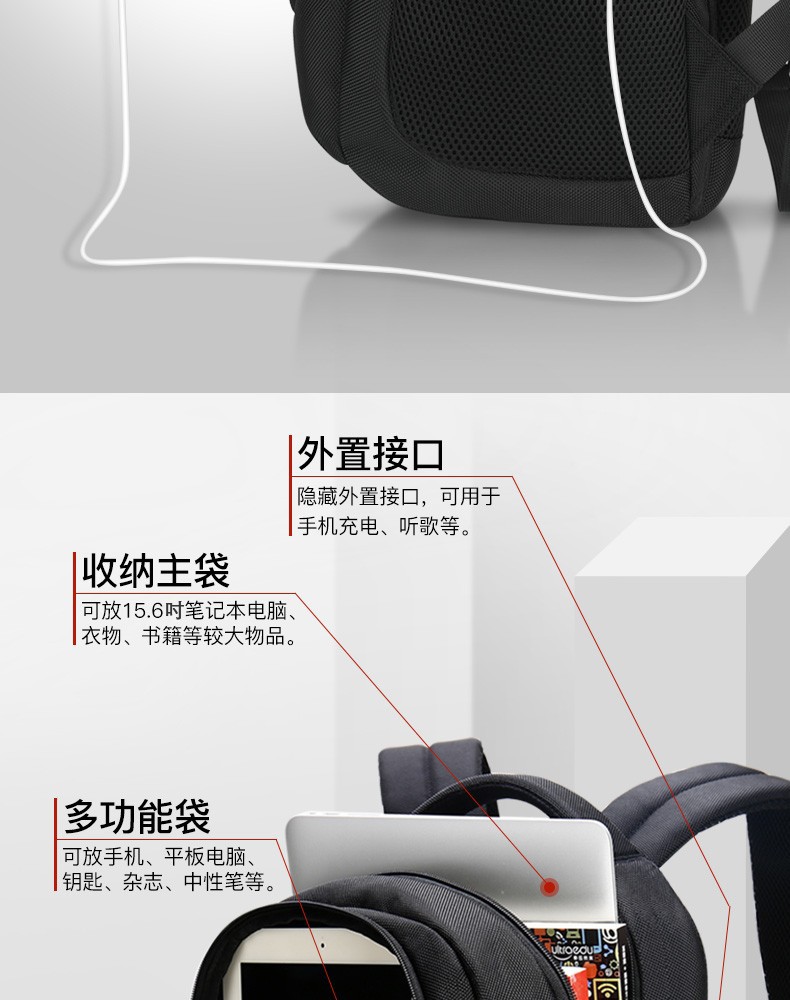 型 号:88042 大号 尺 寸:470*330*200(MM)大号 材 质:织物 颜 色:黑色 重 量:0.925kg 2.采用优质涤纶材料 防泼水; 3.超大容量设计可放15寸电脑; 4.外置USB接口可直接连接手机充电; 5.主袋内加厚电脑隔层; 6.弹力蜂窝背板、透气、缓压、减震