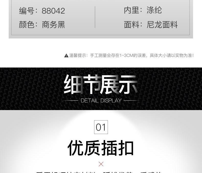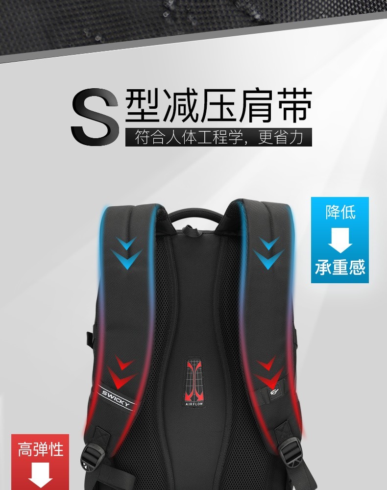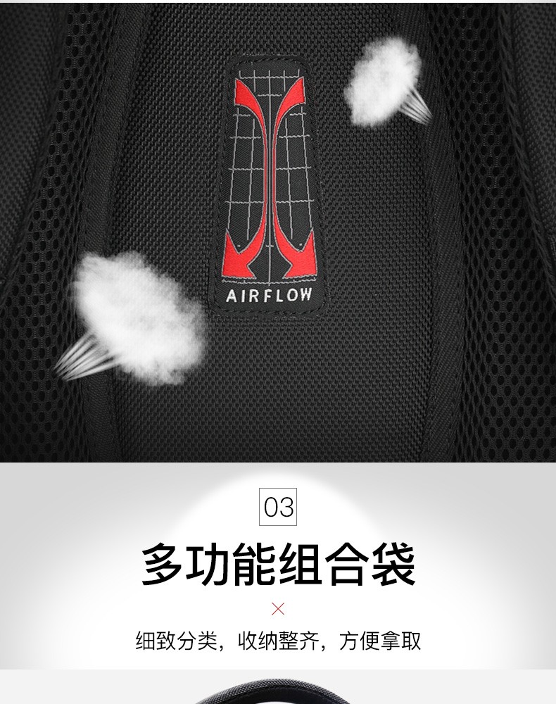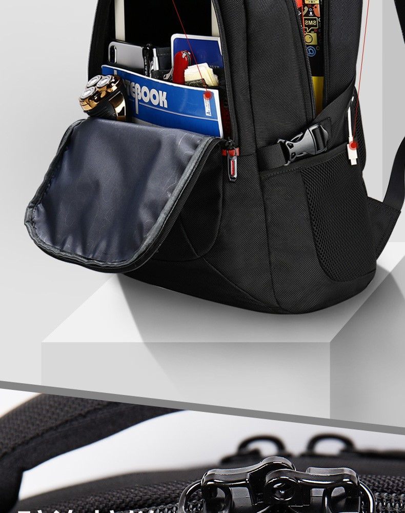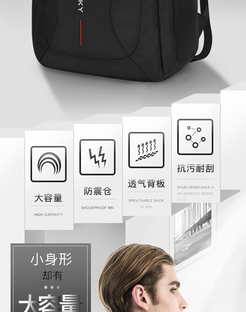 型 号:88042 大号 尺 寸:470*330*200(MM)大号 材 质:织物 颜 色:黑色 重 量:0.925kg 2.采用优质涤纶材料 防泼水; 3.超大容量设计可放15寸电脑; 4.外置USB接口可直接连接手机充电; 5.主袋内加厚电脑隔层; 6.弹力蜂窝背板、透气、缓压、减震