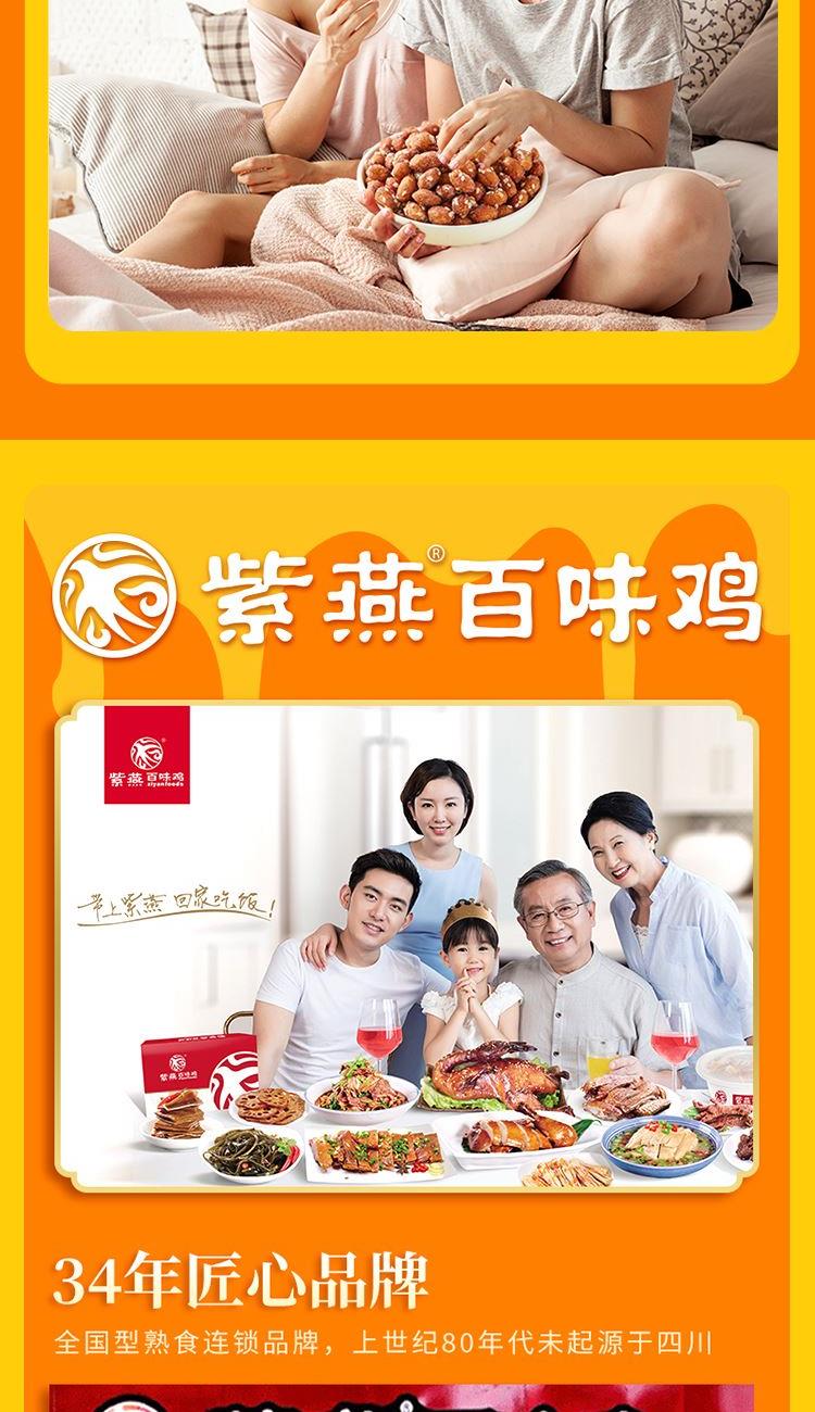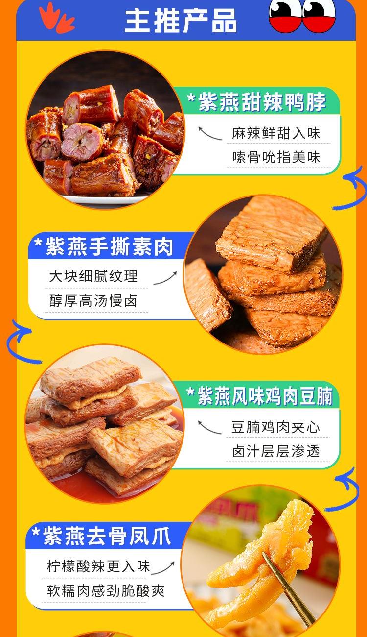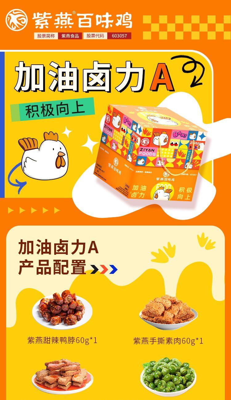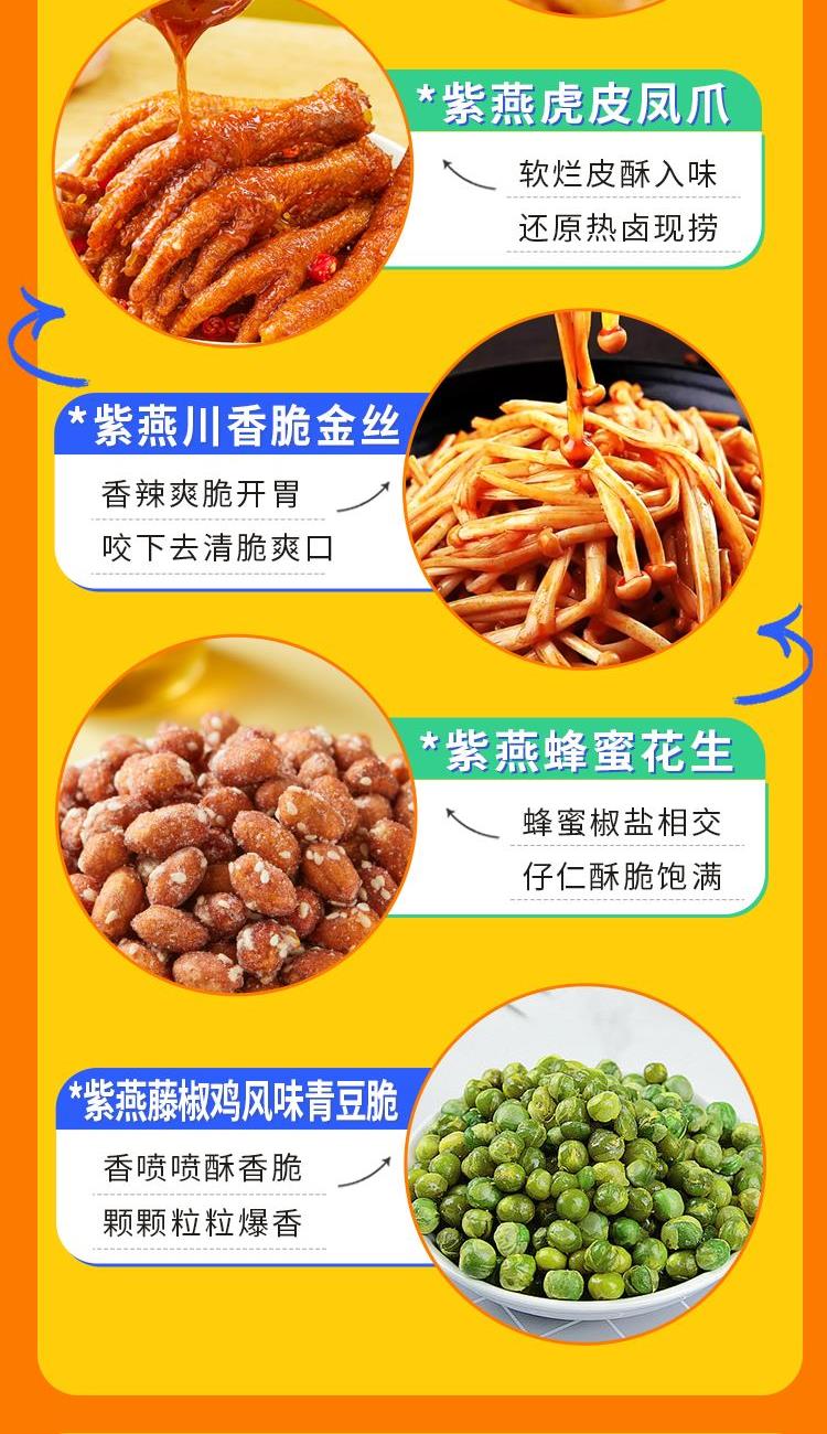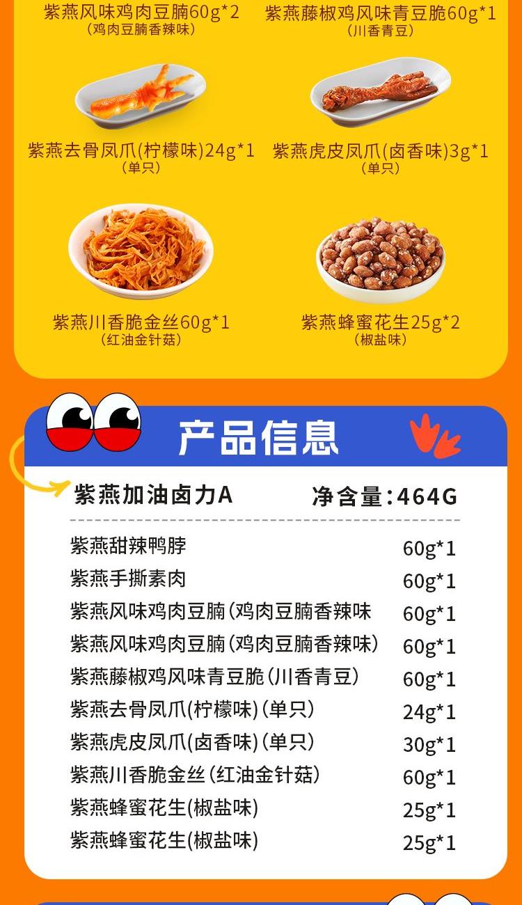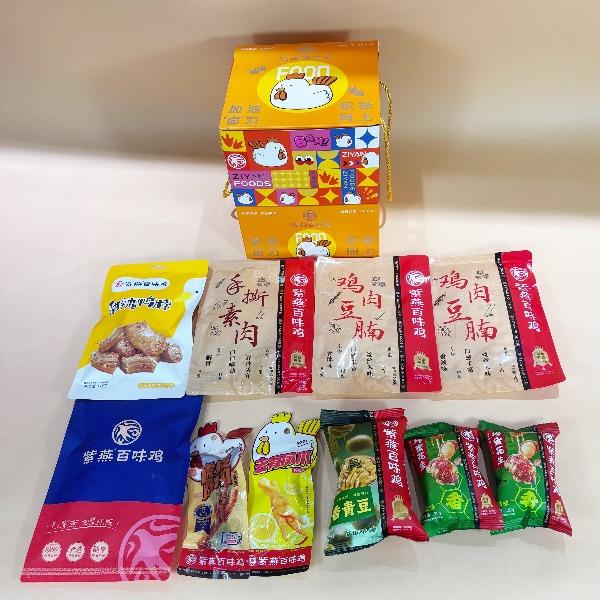 紫燕甜辣鸭脖60g*1 紫燕手撕素肉60g*1 紫燕风味鸡肉豆腩(鸡肉豆腩香辣味)60g*2 紫燕藤椒鸡风味青豆脆(川香青豆)60g*1 紫燕去骨凤爪(柠檬味)(单只)24g*1 紫燕虎皮凤爪(卤香味)(单只)30g*1 紫燕川香脆金丝(红油金针菇)60g*1 紫燕蜂蜜花生(椒盐味)25g*2 礼盒+组装+外盒