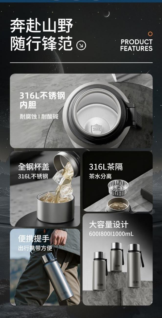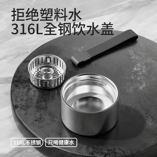 颜色:米白 银灰色 亮黑色 重量: 412g 材质:316L奥氏体不锈钢内胆、316L不锈钢滤网,食品级PP,PC配件。 硅胶提升,舒适提拎,坚固不易断。 316L全钢分享盖,拒绝塑料水件,饮水美滴都要安心。 包装:单瓦盒
