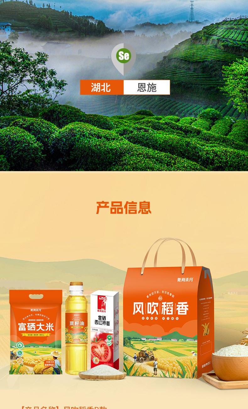 产品信息 品 名:风吹稻香B 规 格:富硒大米500g、菜籽油418ml 富硒西红柿挂面300g 包 装:长25cm宽7cm高32cm 产品特色 1、富硒大米富含有机硒,每100g平均硒含量≥20ug;更易被人体利用吸收。 2、菜籽油油品透亮、香味浓郁,烟点高、炒菜油烟少、低温下不易凝固等特点;菜籽油中还含有丰富的维生素E以及油酸、亚油酸、亚麻酸等 3、富硒西红柿面爽口细腻,入口顺滑,富硒小麦粉细腻劲道。 4、精美礼盒,送礼佳品。