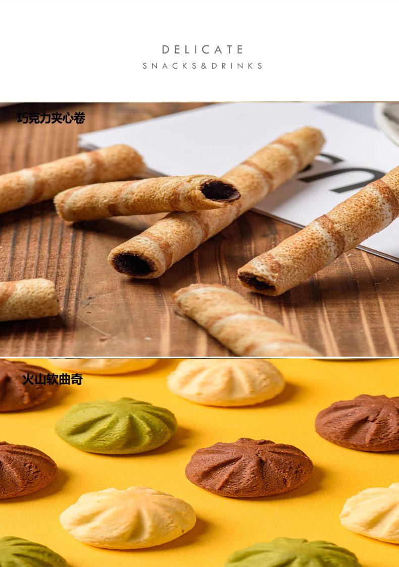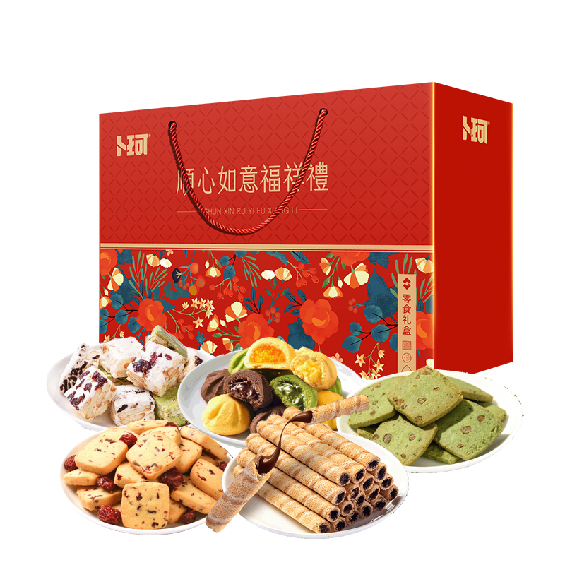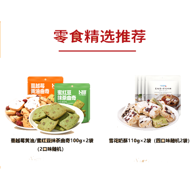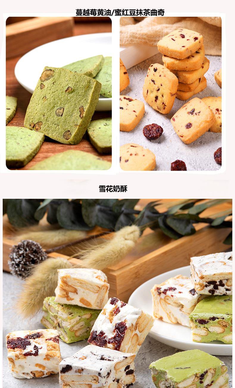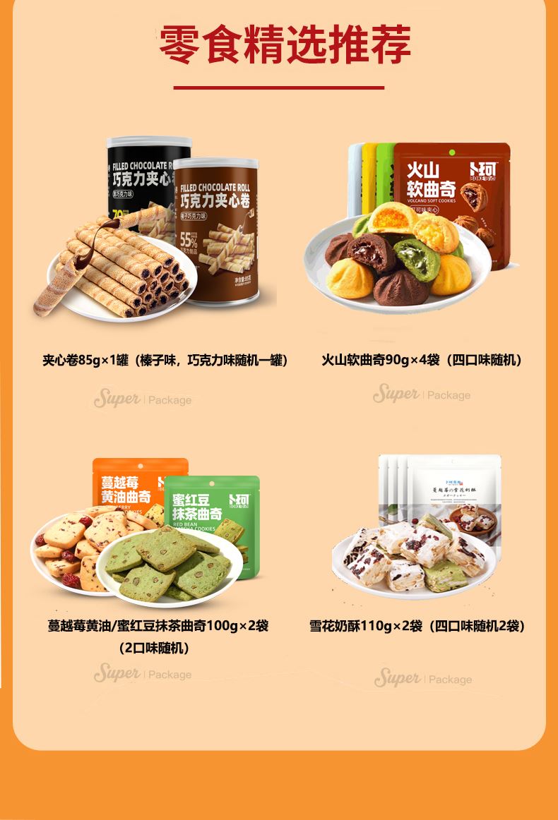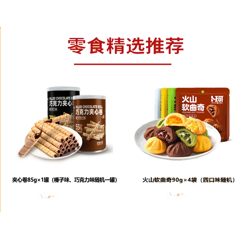 克重:865克 内配: 1、巧克力夹心卷(黑巧克力味)(榛子巧克力味)85g×1罐(两口味随机) 2、火山曲奇(芒果夹心)(抹茶夹心)(可可夹心)(牛奶夹心)90g×4袋(四口味随机) 3、蔓越莓黄油曲奇、蜜红豆抹茶曲奇100g×2袋(2口味随机) 4、雪花奶酥110g×2袋(四口味随机) 礼盒规格:380*270*135mm 保质期:9月