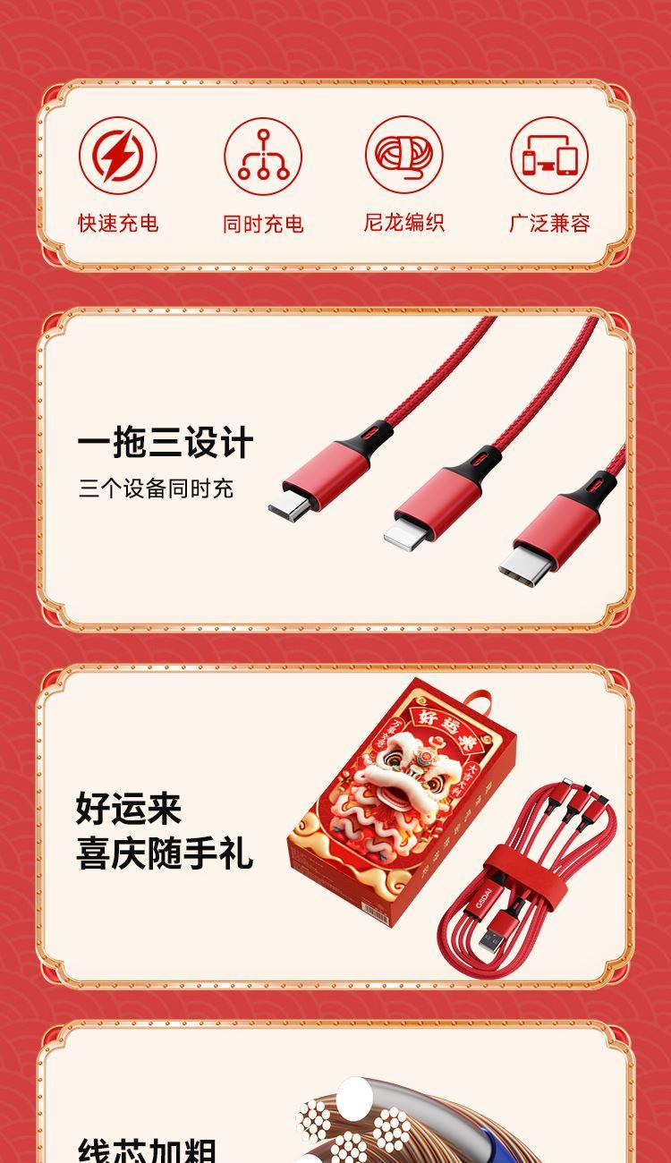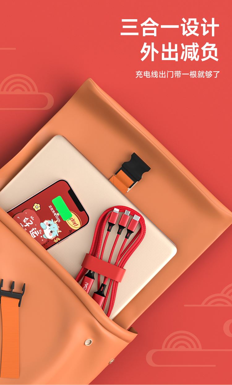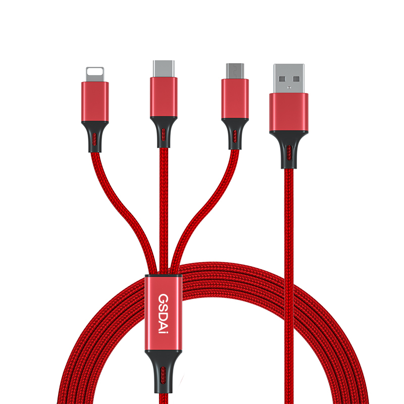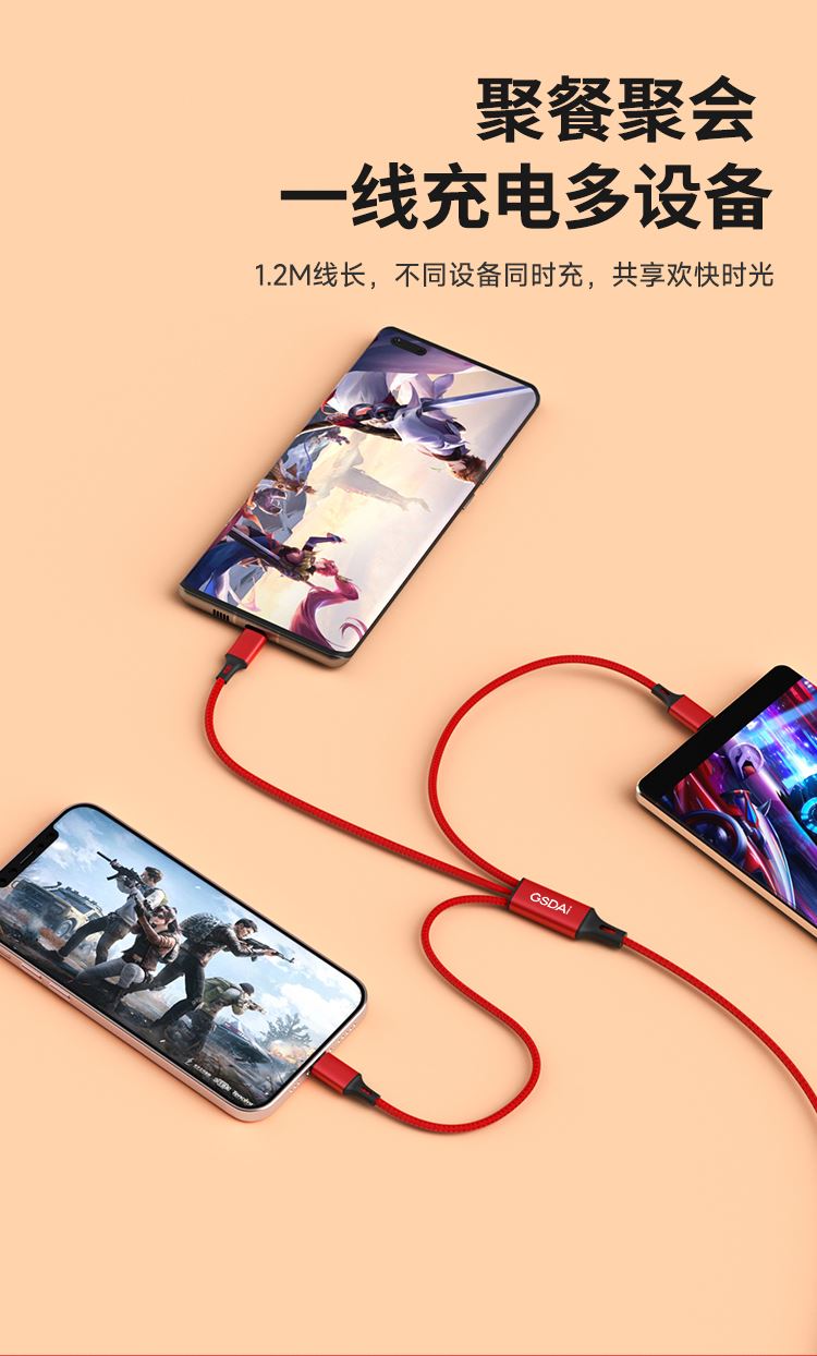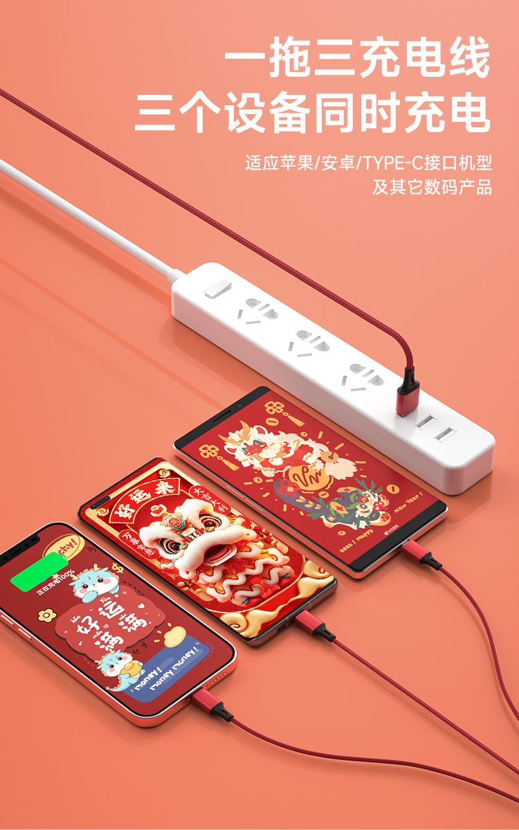材质:尼龙编织+铝合金 电流:5V-2.1A 输入接口:USB 输出接口:Type-C+lightning+Micro 线长:1.2M 1:一拖三充电线、三个设备同时充电 2:线芯加粗、充电稳定且高效 3:尼龙编织线、不缠绕耐磨损 4:新年聚会、一线搞定多设备 5:1.2M线长、龙年新年礼,送礼新选择 6:安全电芯,放心充电