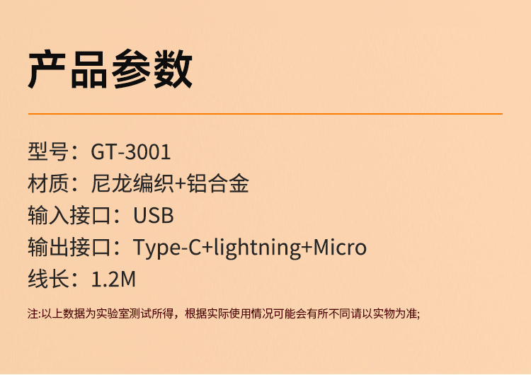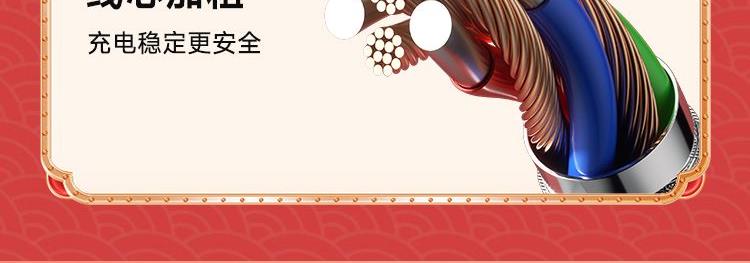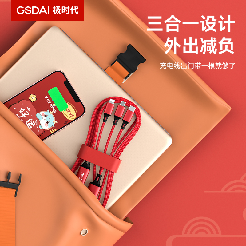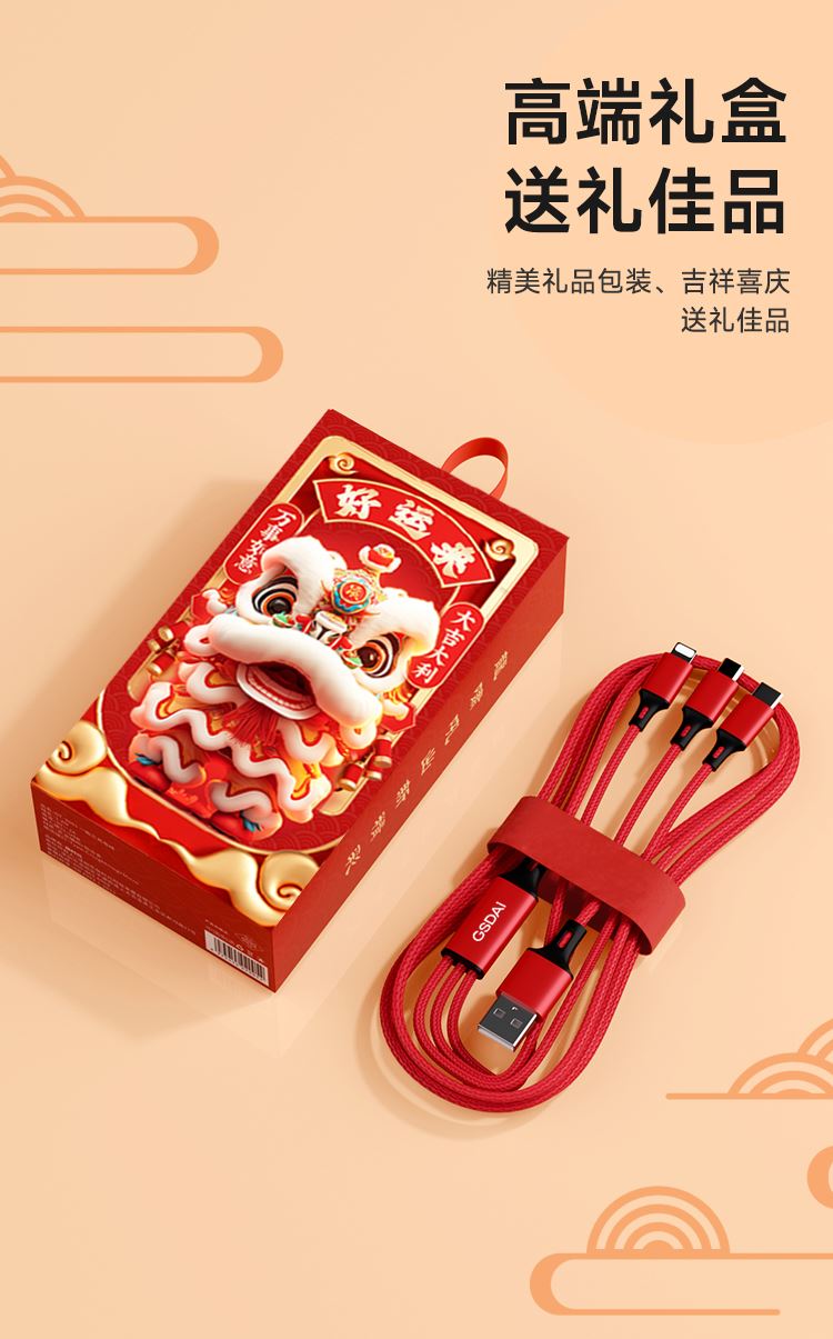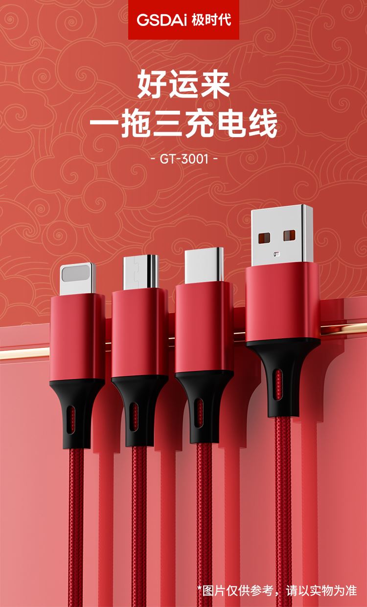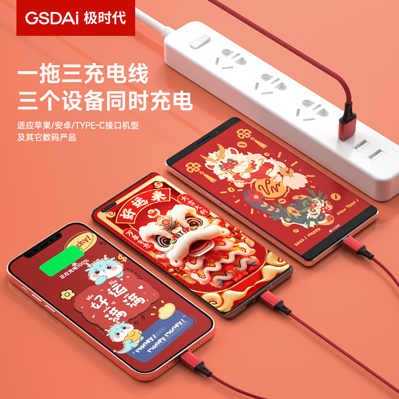 材质:尼龙编织+铝合金 电流:5V-2.1A 输入接口:USB 输出接口:Type-C+lightning+Micro 线长:1.2M 1:一拖三充电线、三个设备同时充电 2:线芯加粗、充电稳定且高效 3:尼龙编织线、不缠绕耐磨损 4:新年聚会、一线搞定多设备 5:1.2M线长、龙年新年礼,送礼新选择 6:安全电芯,放心充电