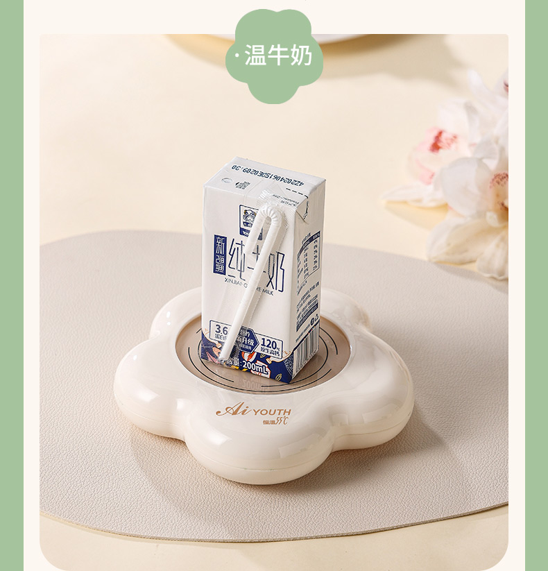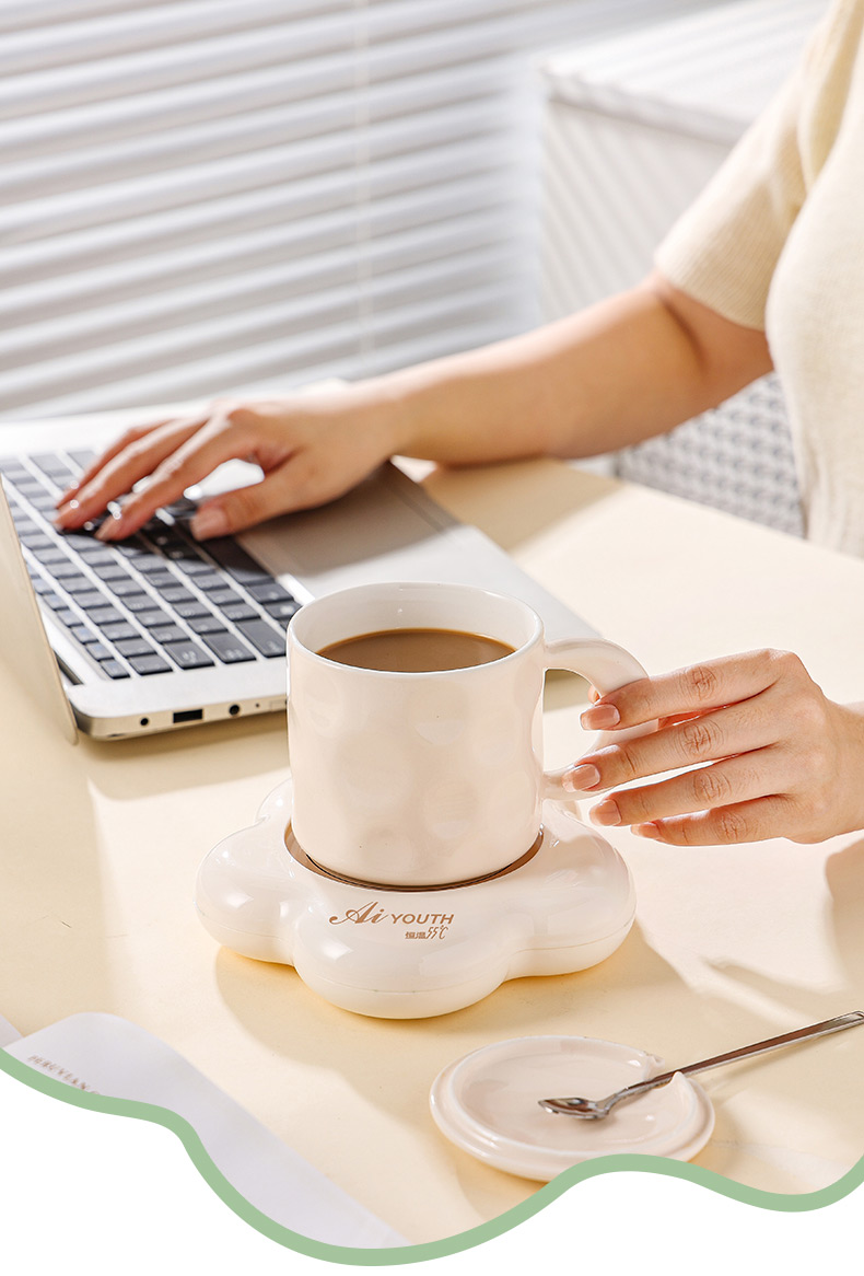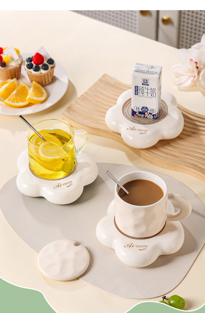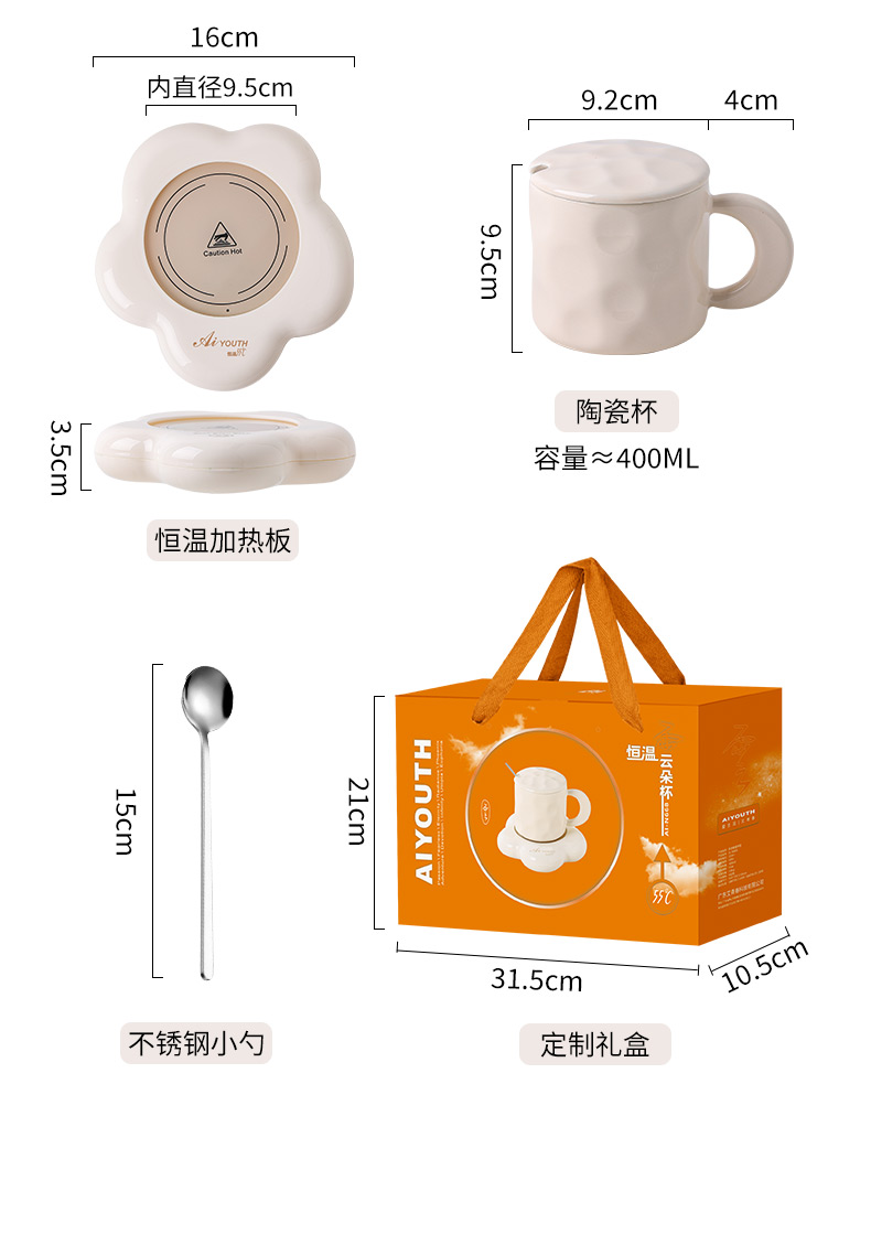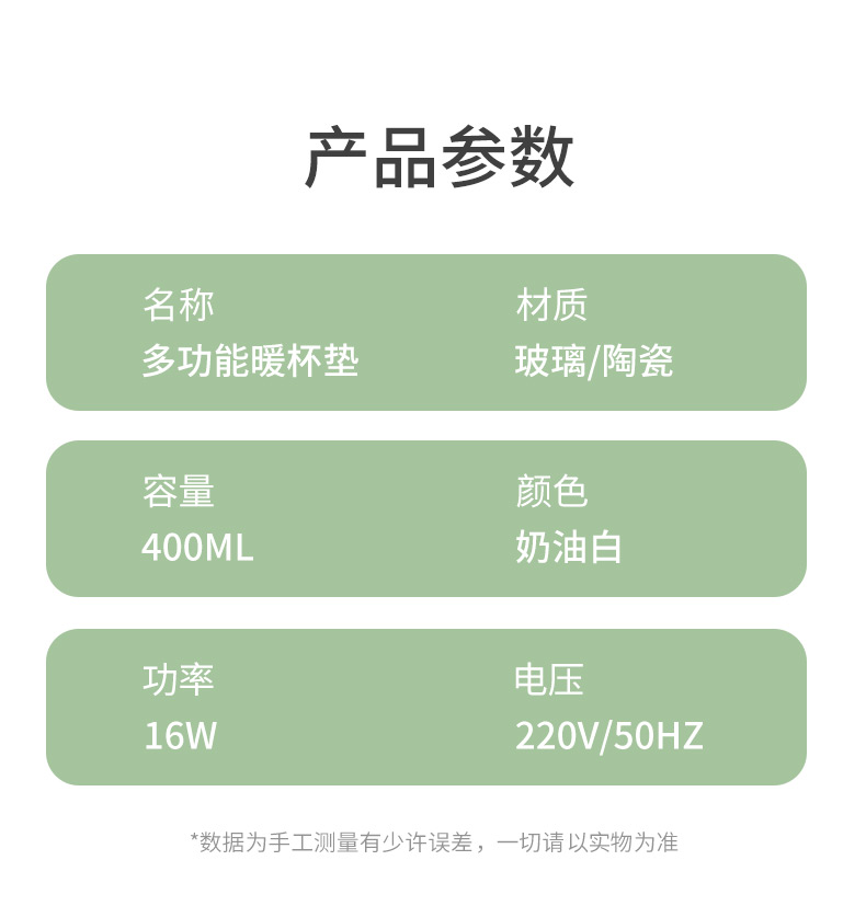 额定电压: 220V~ 额定频率:50Hz 额定功率: 16W 产品容量: 400ML 重 量: 0.8kg 颜 色 :奶油白 包装尺寸: 306*105*210mm 包装清单:陶瓷杯、不锈钢勺、重力感应恒温杯垫 主要材质:陶瓷 特色功能: 1.55℃智能控温,温暖近在手边 2.硅胶体发热,膜面板,整圈发热均匀 3.静音加热,不挑杯子,快速加热,多彩颜色 4.兼容不同款式和材质的杯型,平/薄底器具加热更快